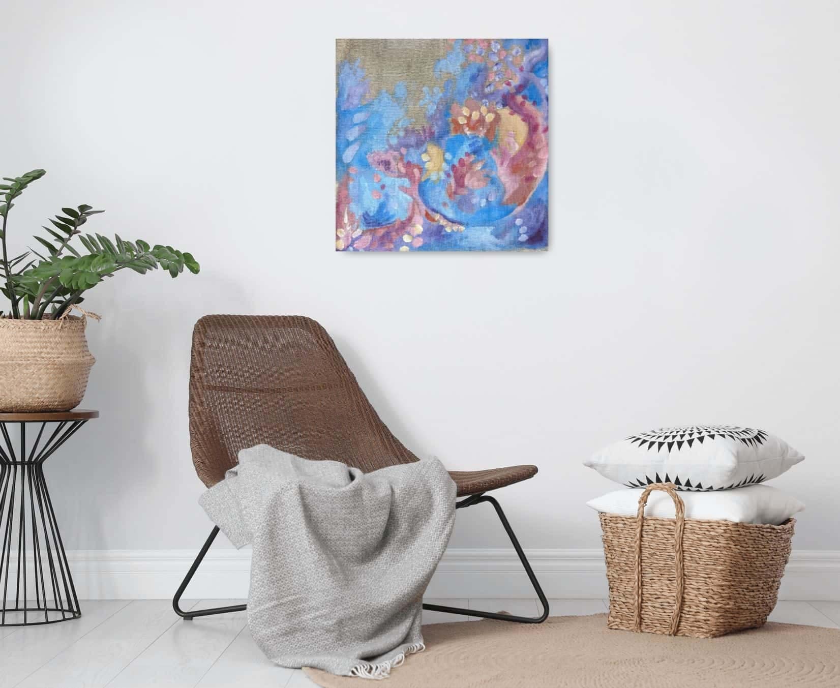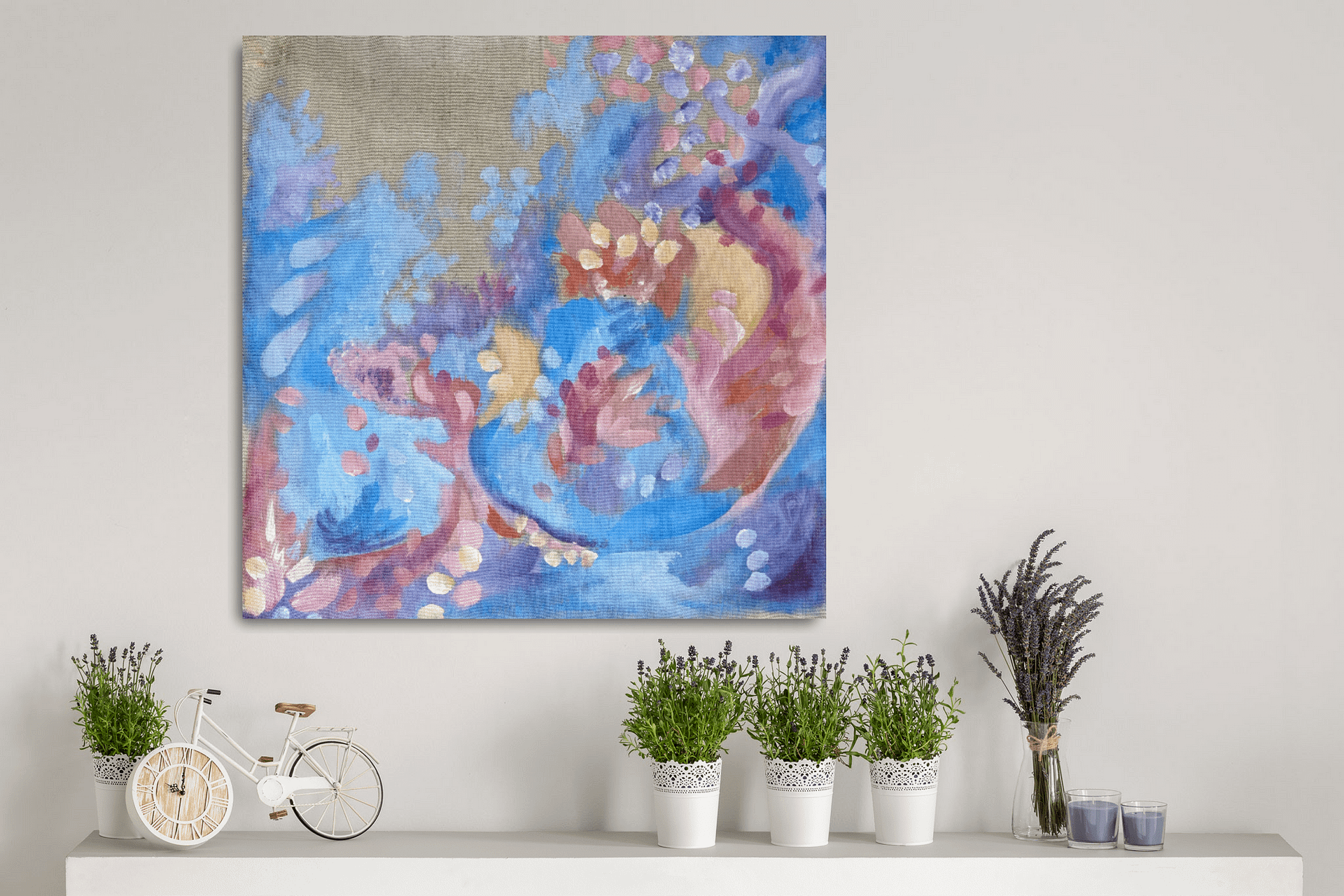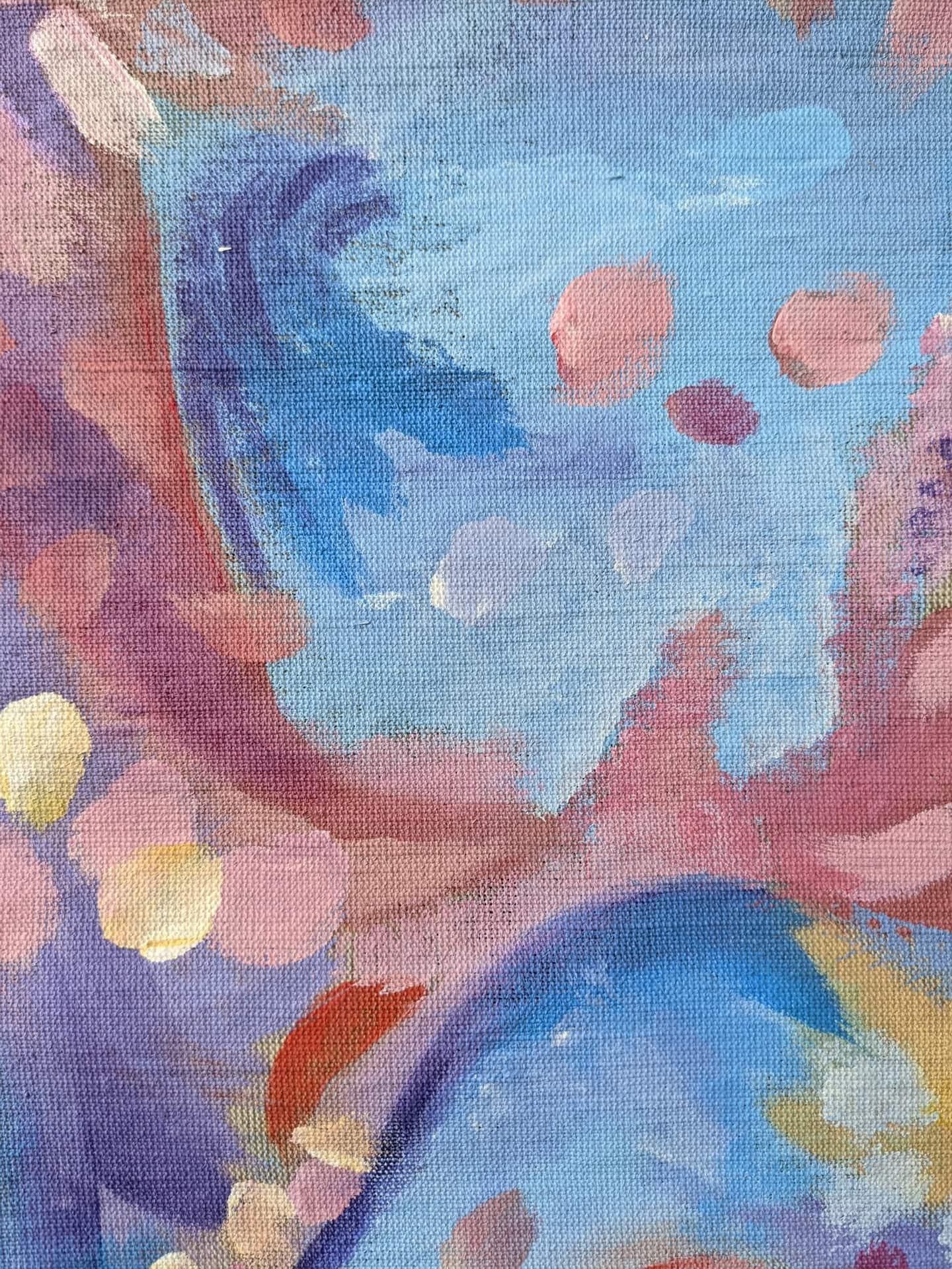 Originální abstraktní obraz v modrých a růžových odstínech, namalovaný na plátně na blind rámu, s malovanými okraji.