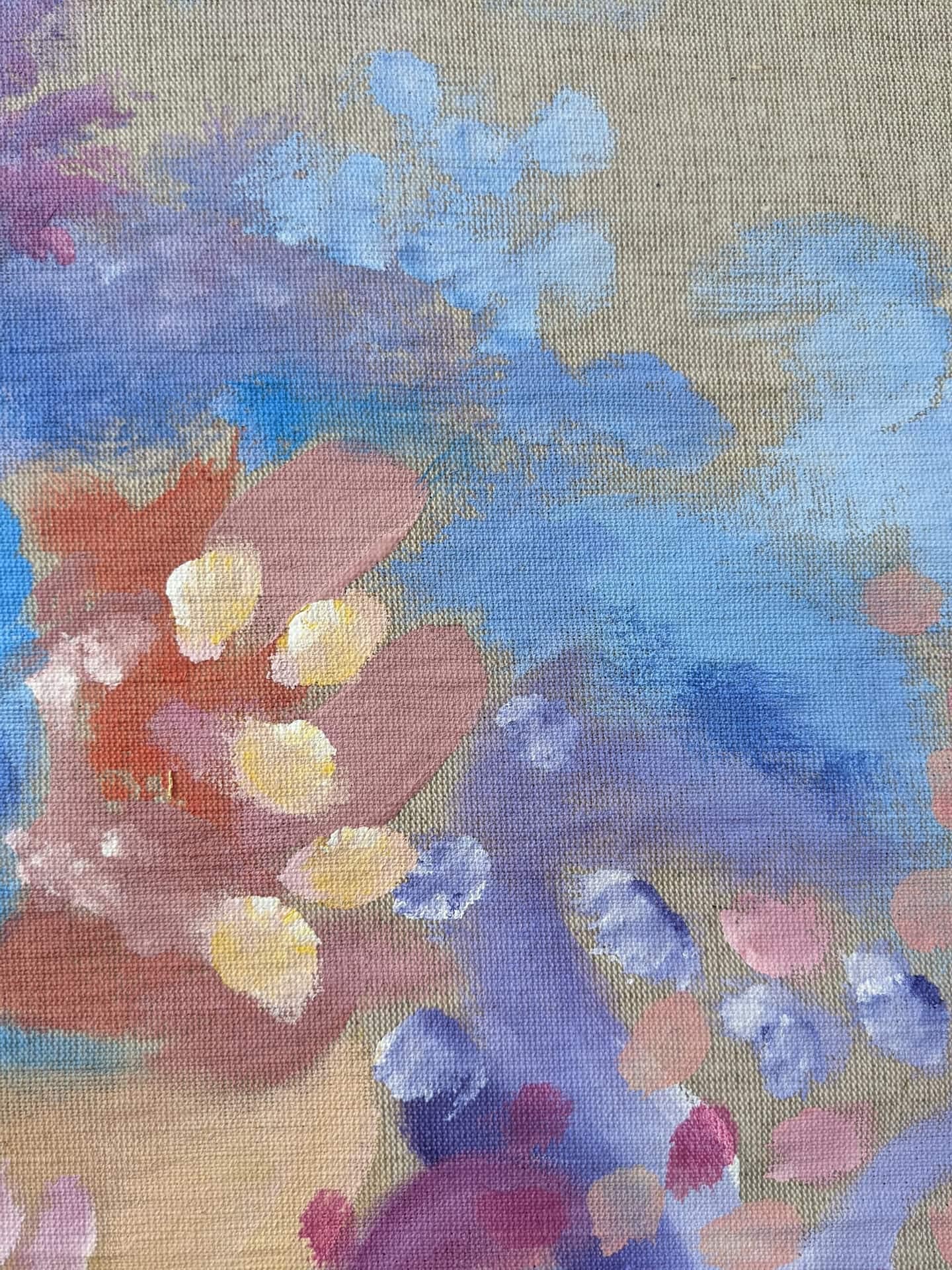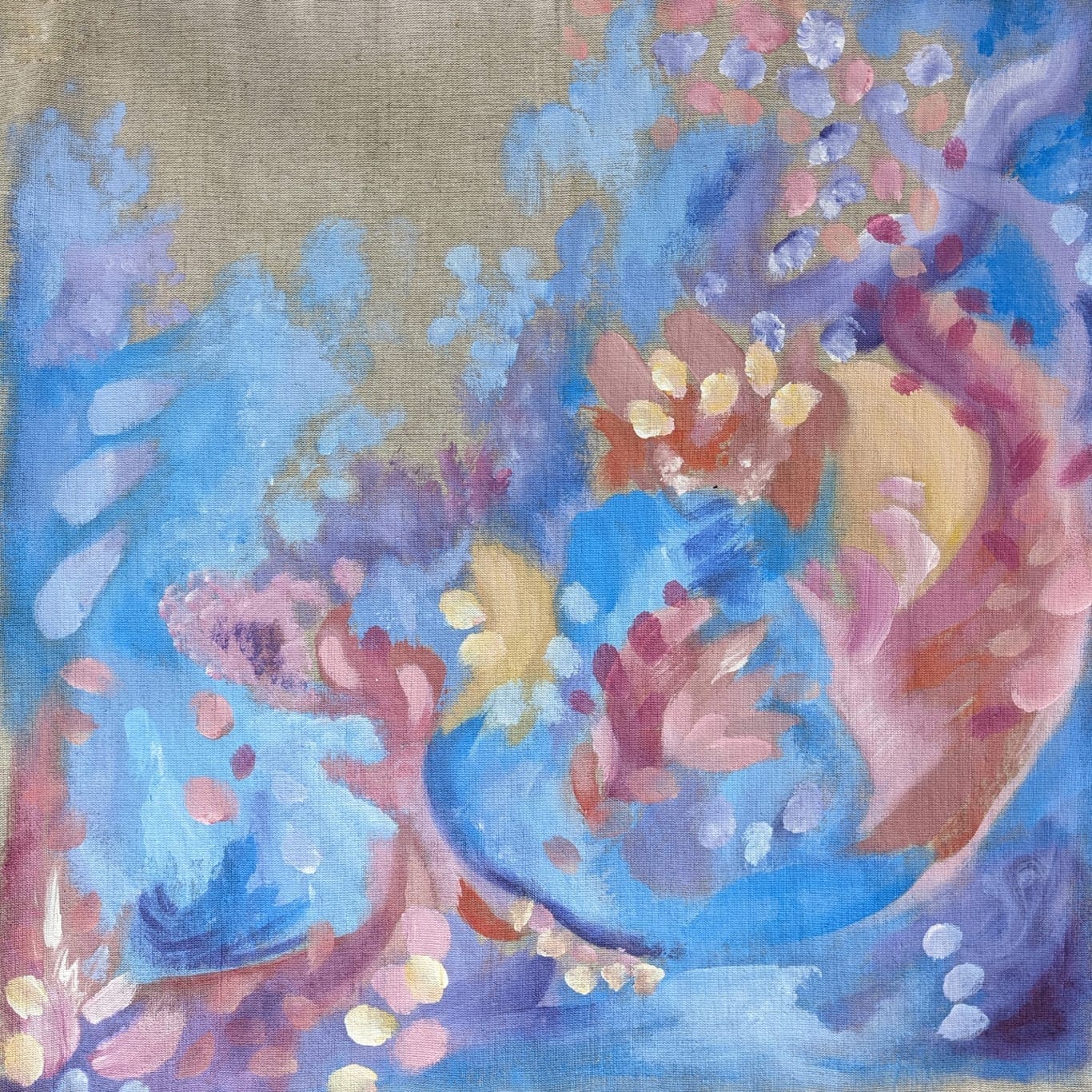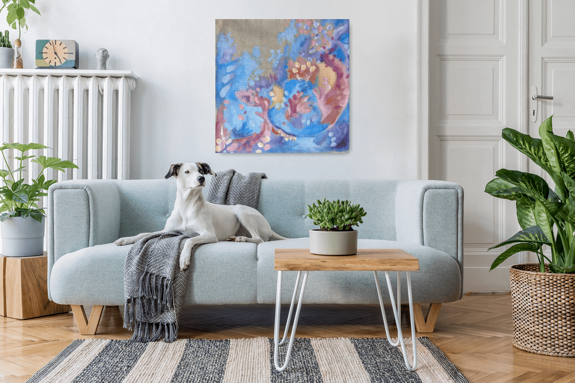 Originální abstraktní obraz v modrých a růžových odstínech, namalovaný na plátně na blind rámu, s malovanými okraji.