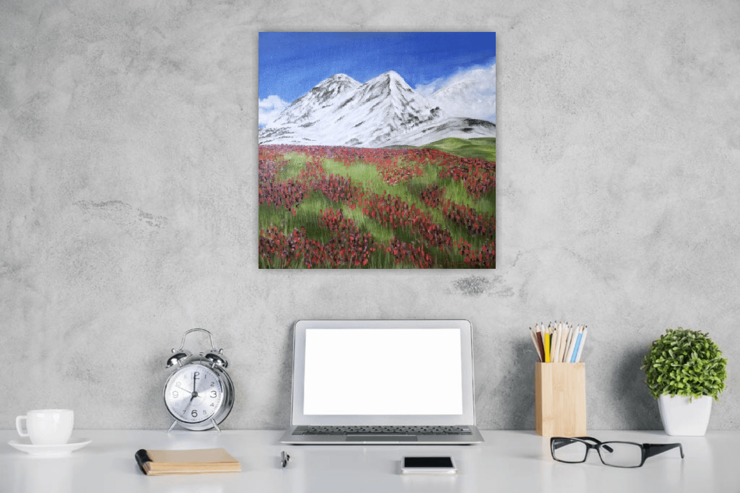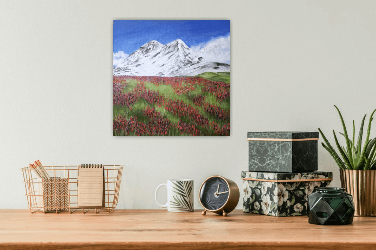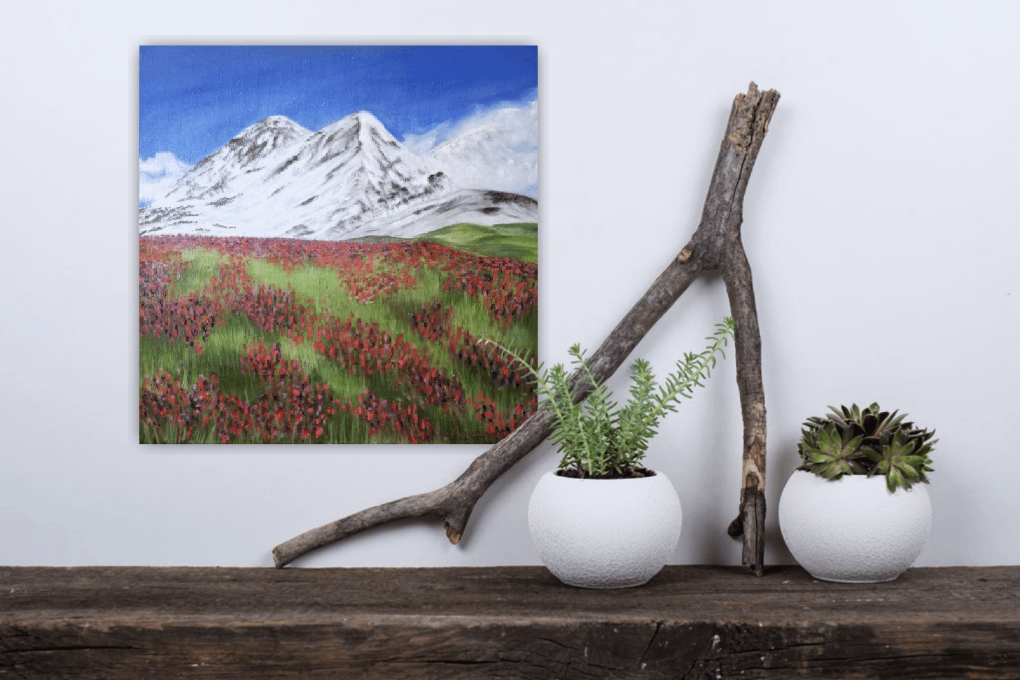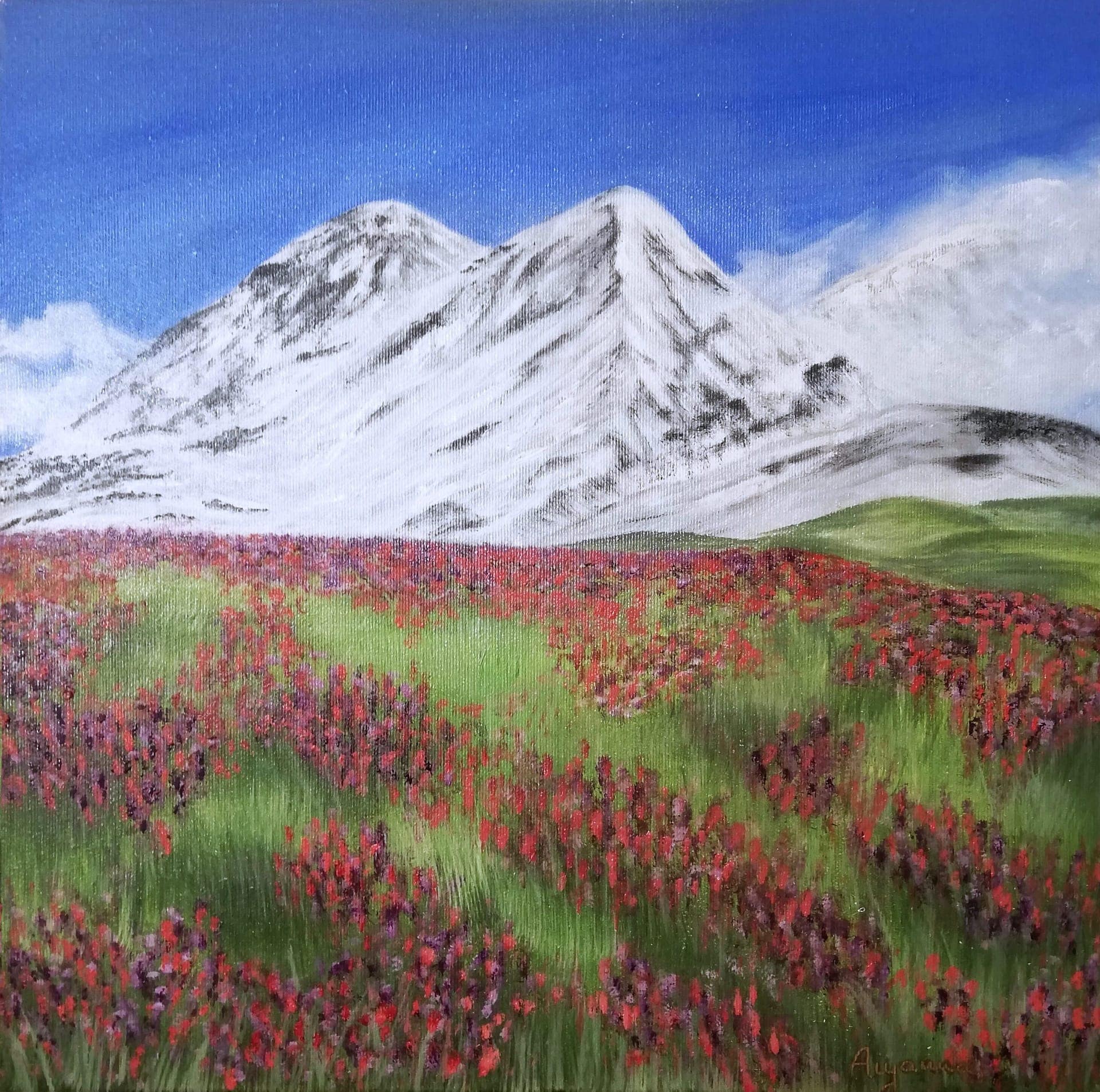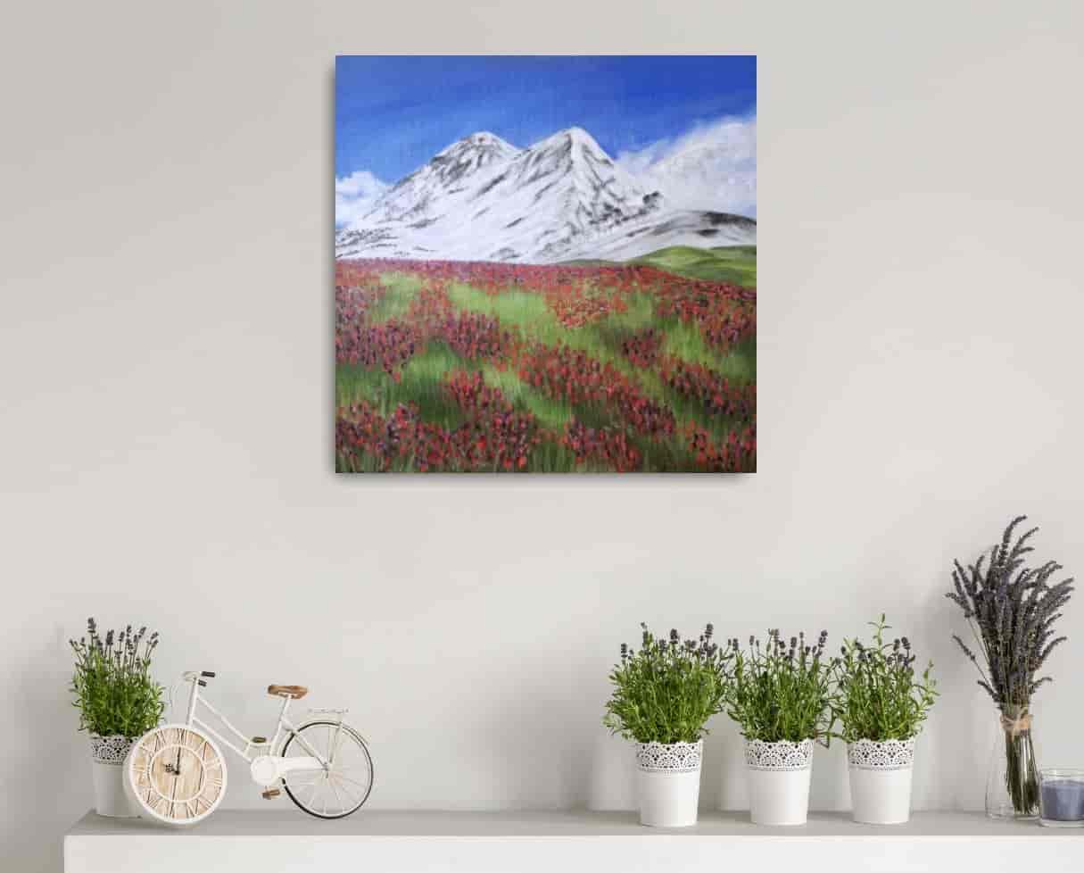 Originální olejomalba květinové louky a pohledu na zasněžené hory na plátně.