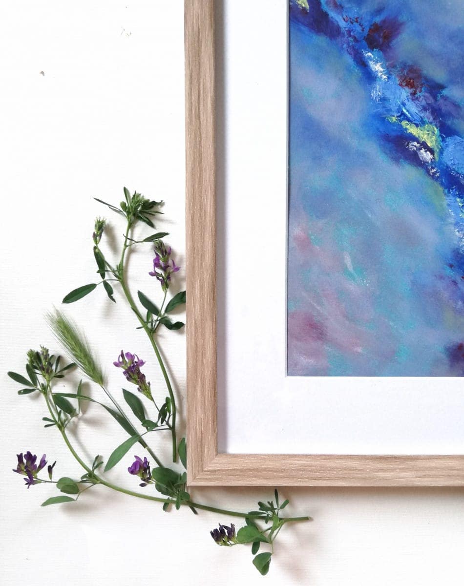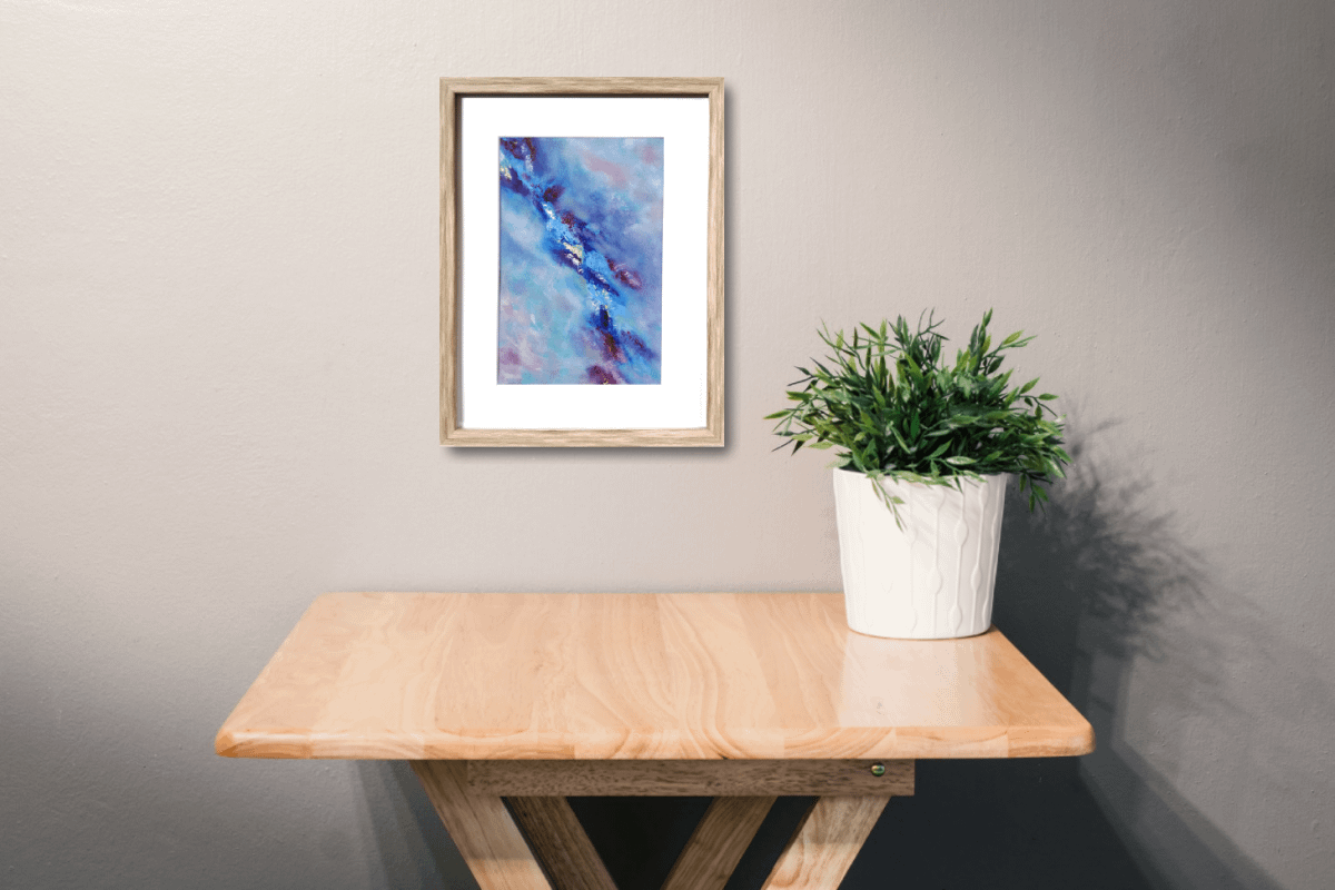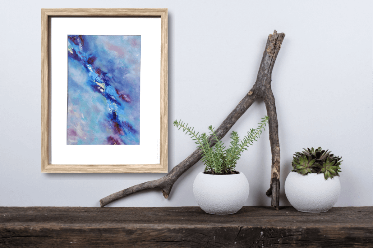 Materiál: akvarelový papír zarámovaný ve dřevěném rámu s paspartou a sklem, akrylová barva, alkoholový inkoust, zlatá barva, lesklý lak.