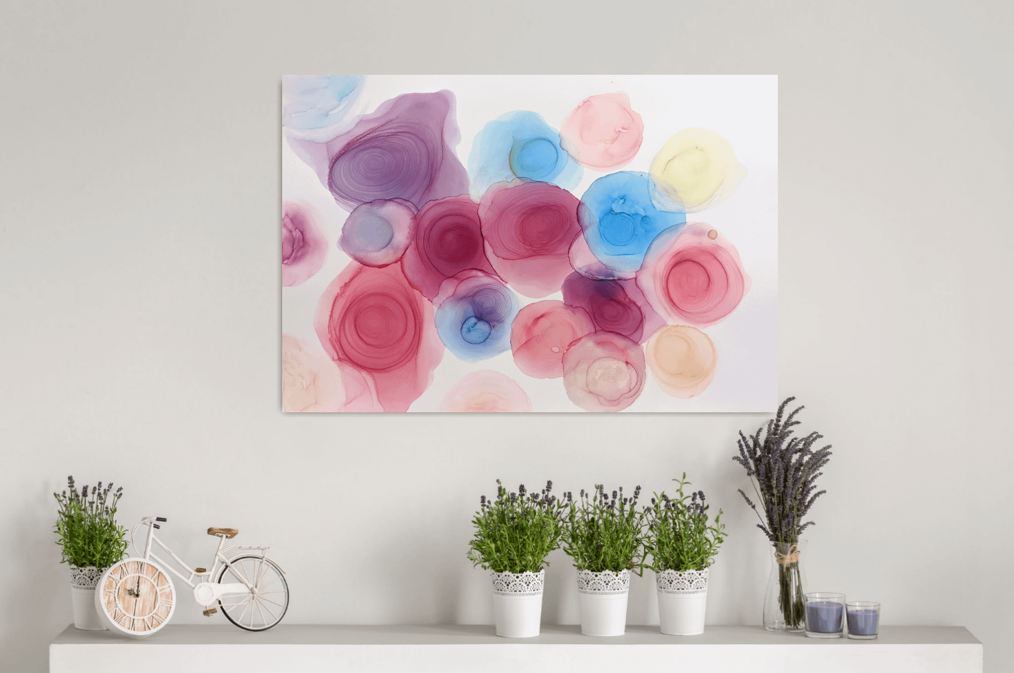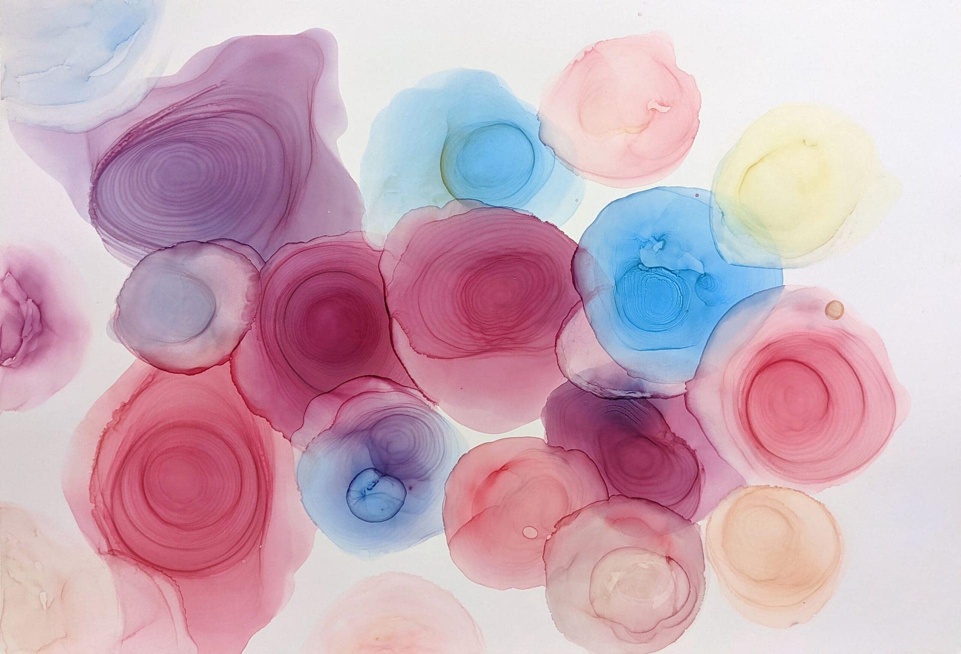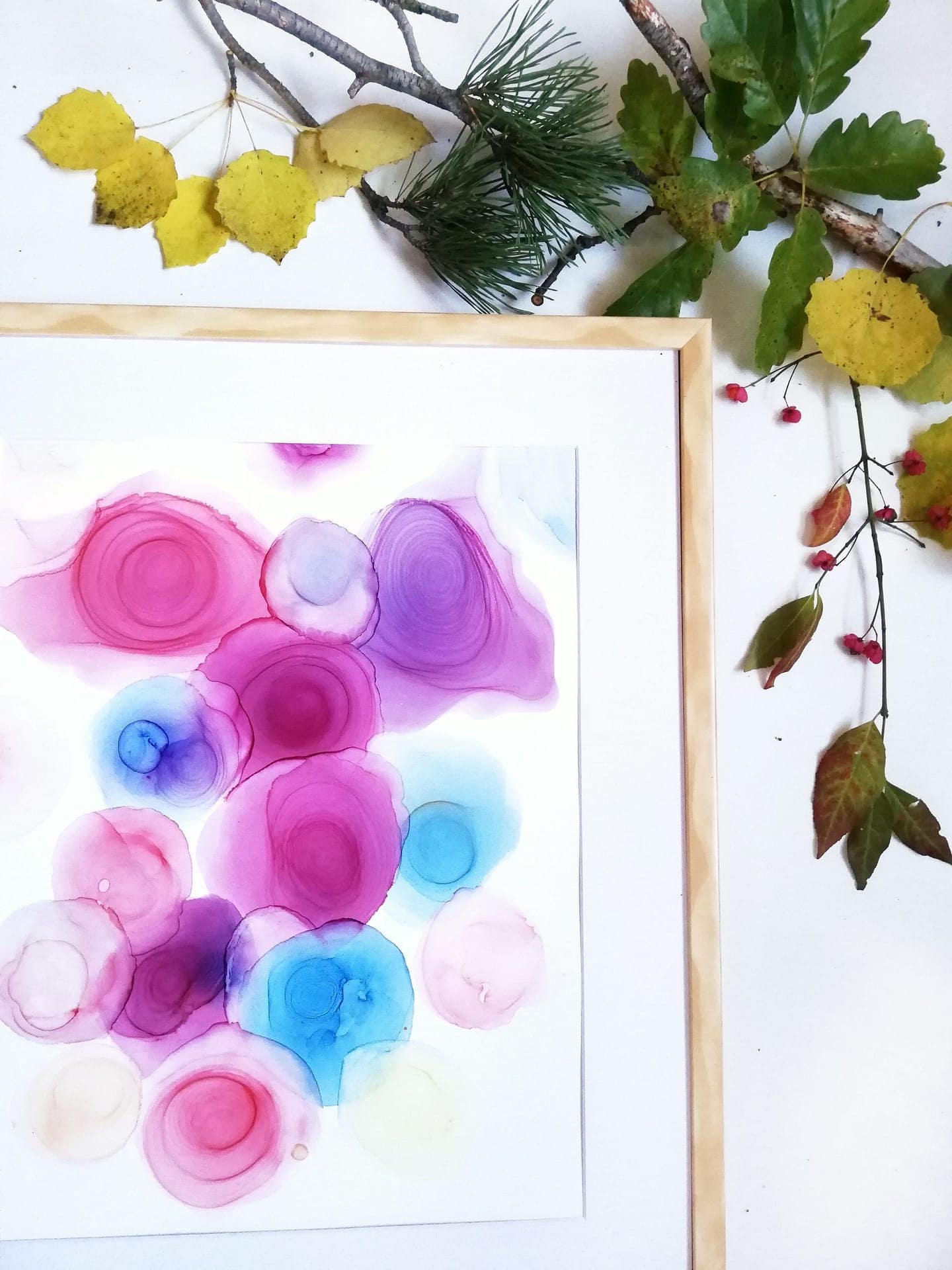 Materiál: alkoholové inkousty, lesklý lak, papír.