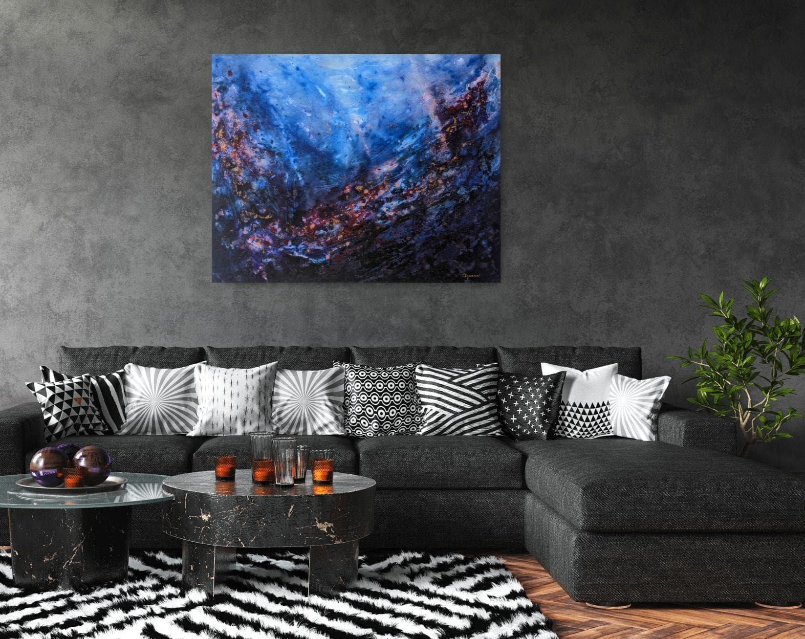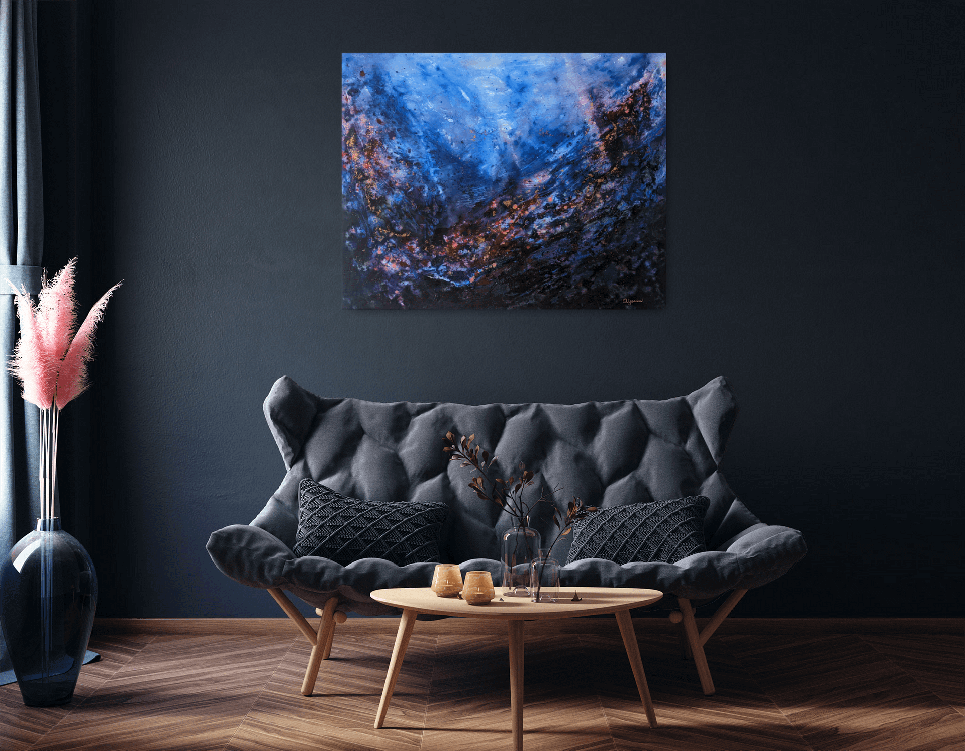 Originální, moderní akrylová malba na plátně na blind rámu v modré, fialové a zlaté barvě na tmavém pozadí.