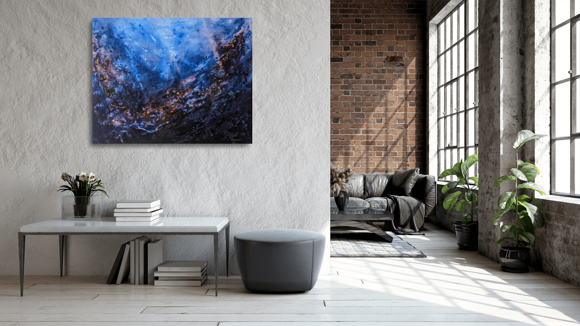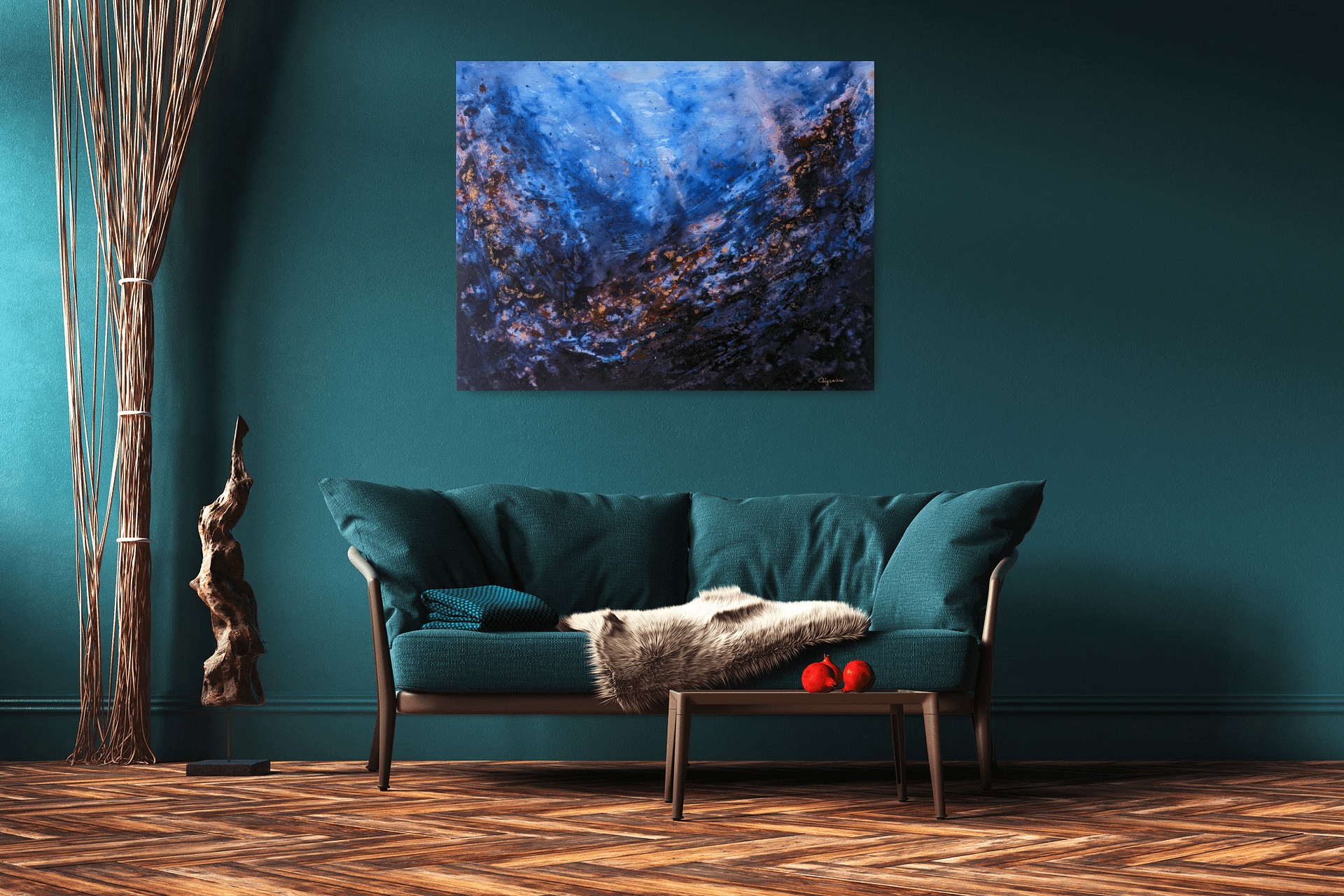 Abstraktní obraz je nalakovaný (2 vrstvy) pro ochranu proti UV záření a prachu. Malovaný kombinovanou technikou.