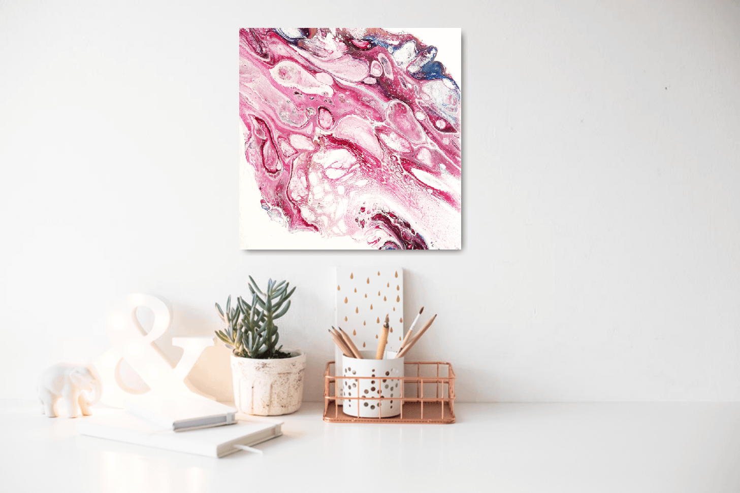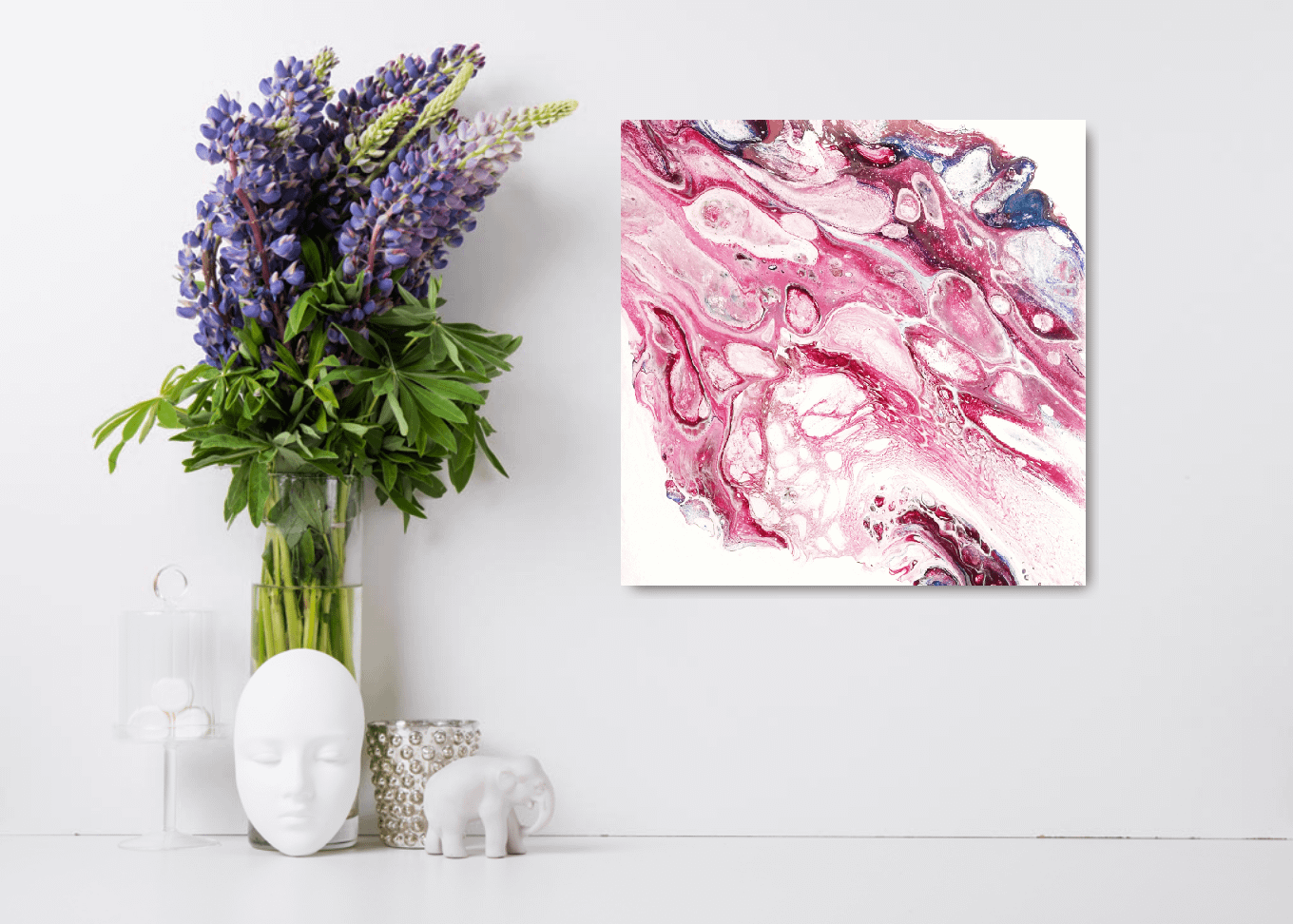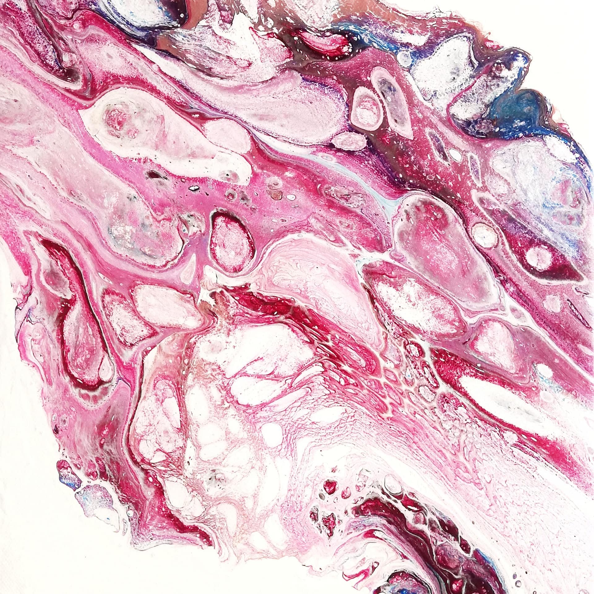 Abstraktní obraz malovaný tekutým akrylem v odstínech růžové.