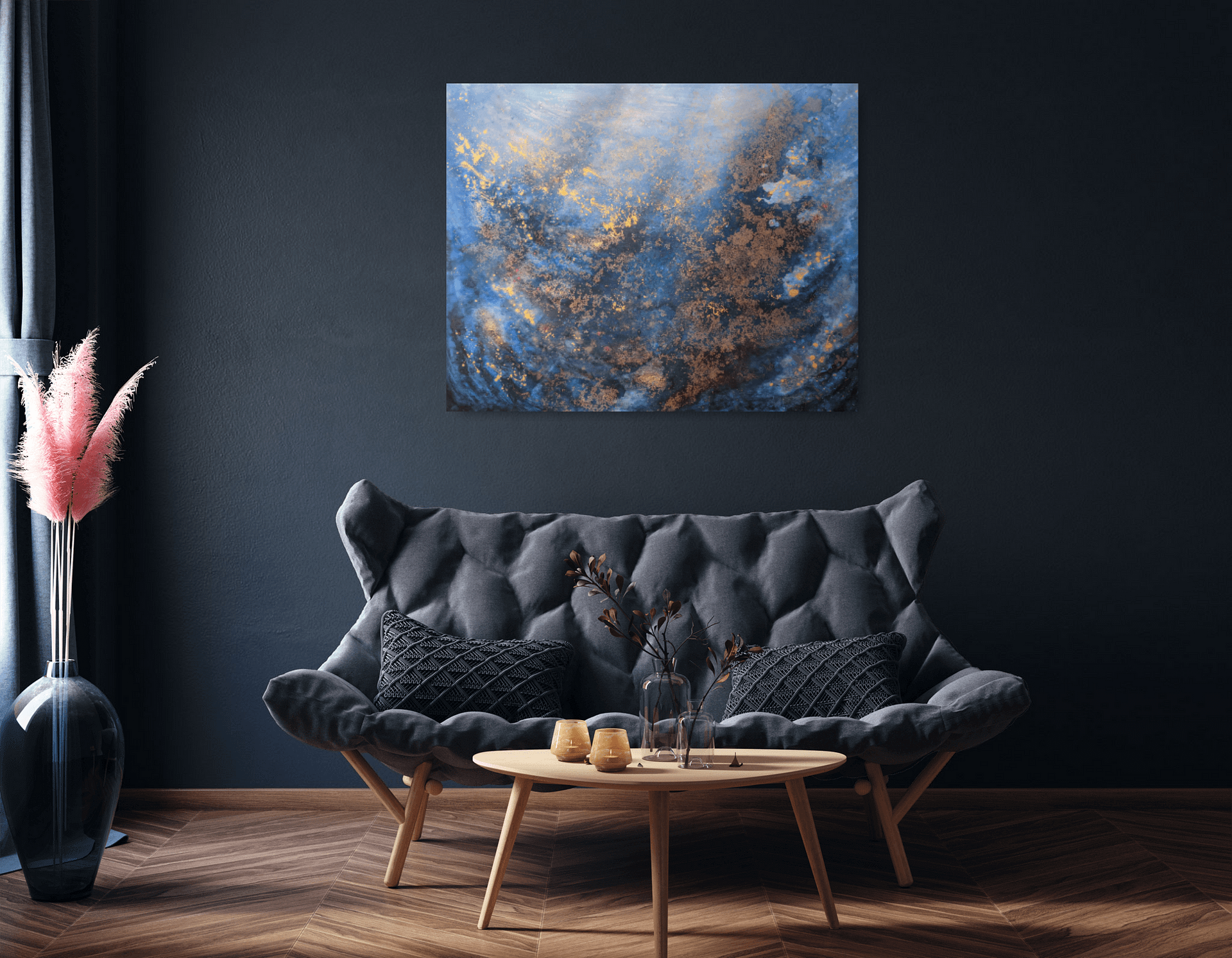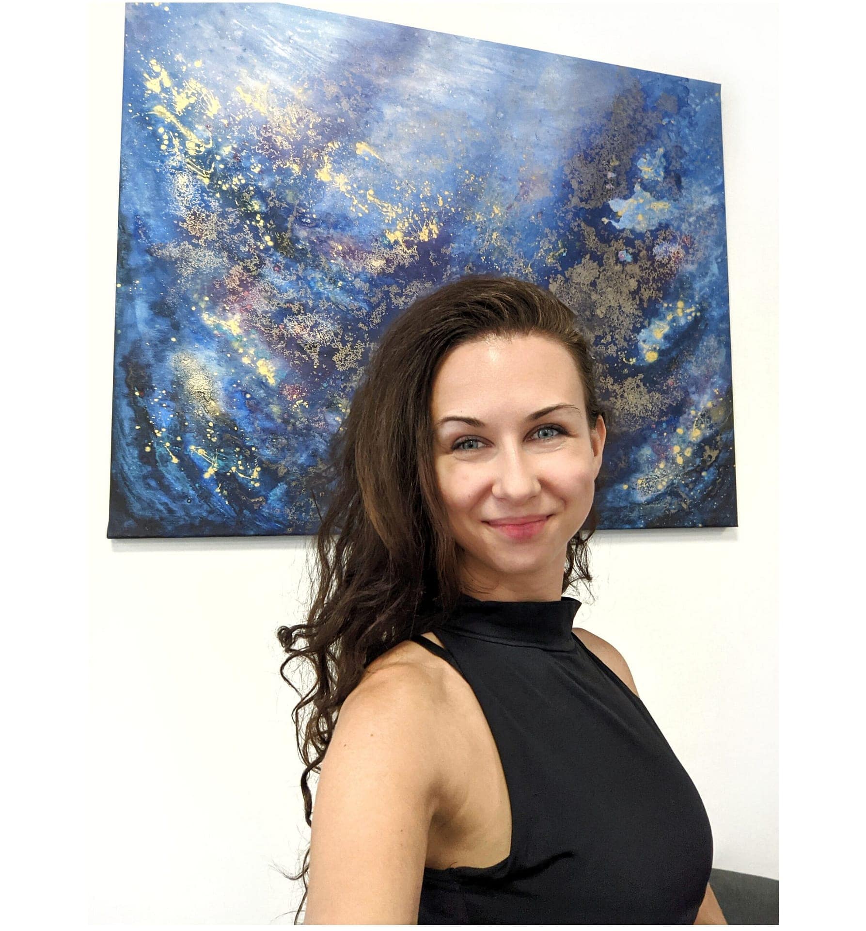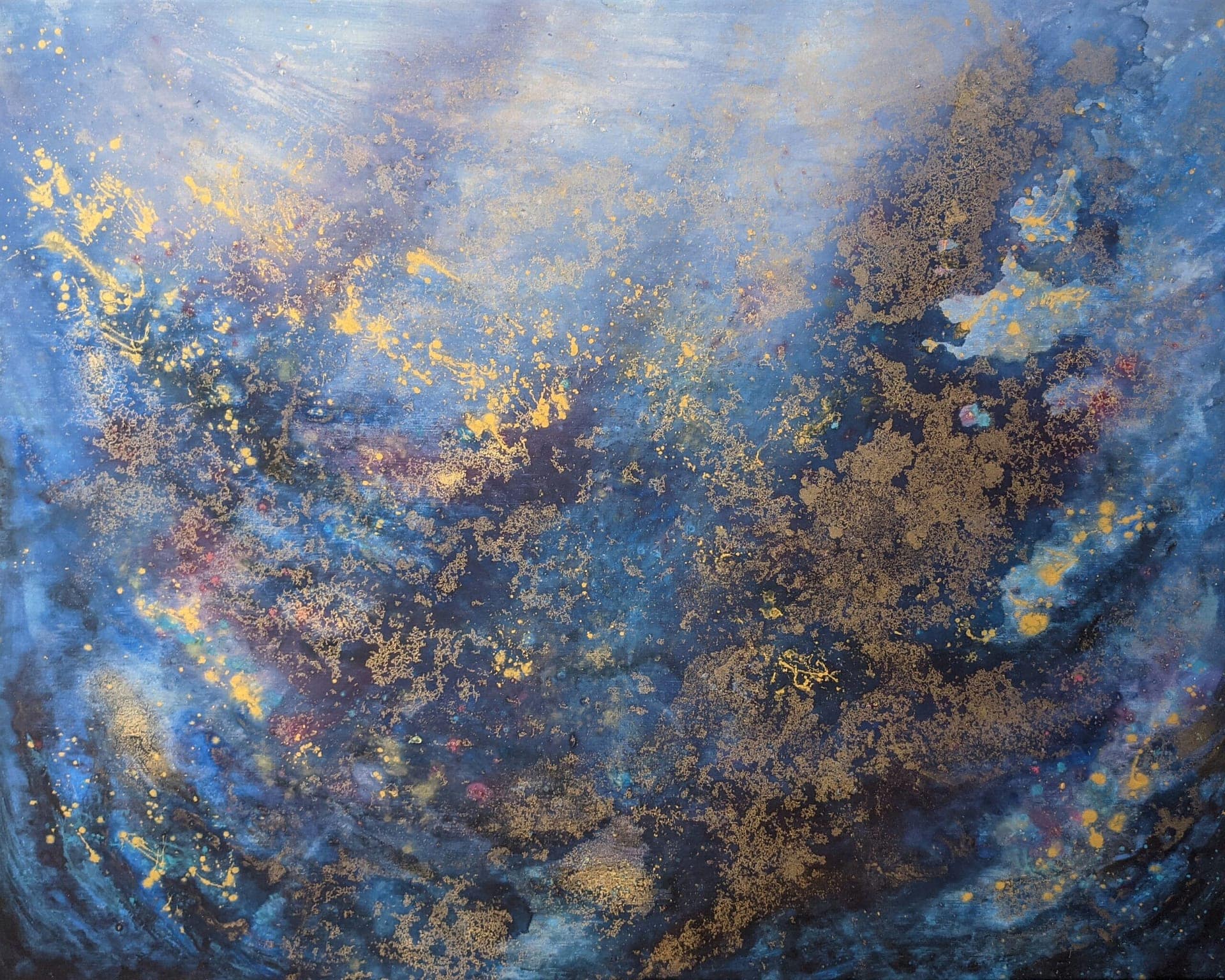 Materiál: plátno natažené na dřevěném rámu, akrylová barva, alkoholový inkoust, zlatá barva, lesklý lak.