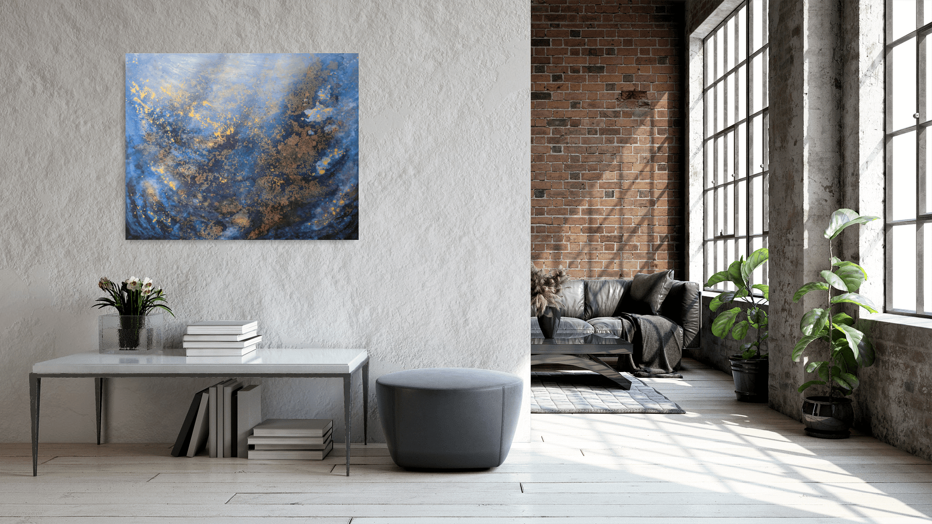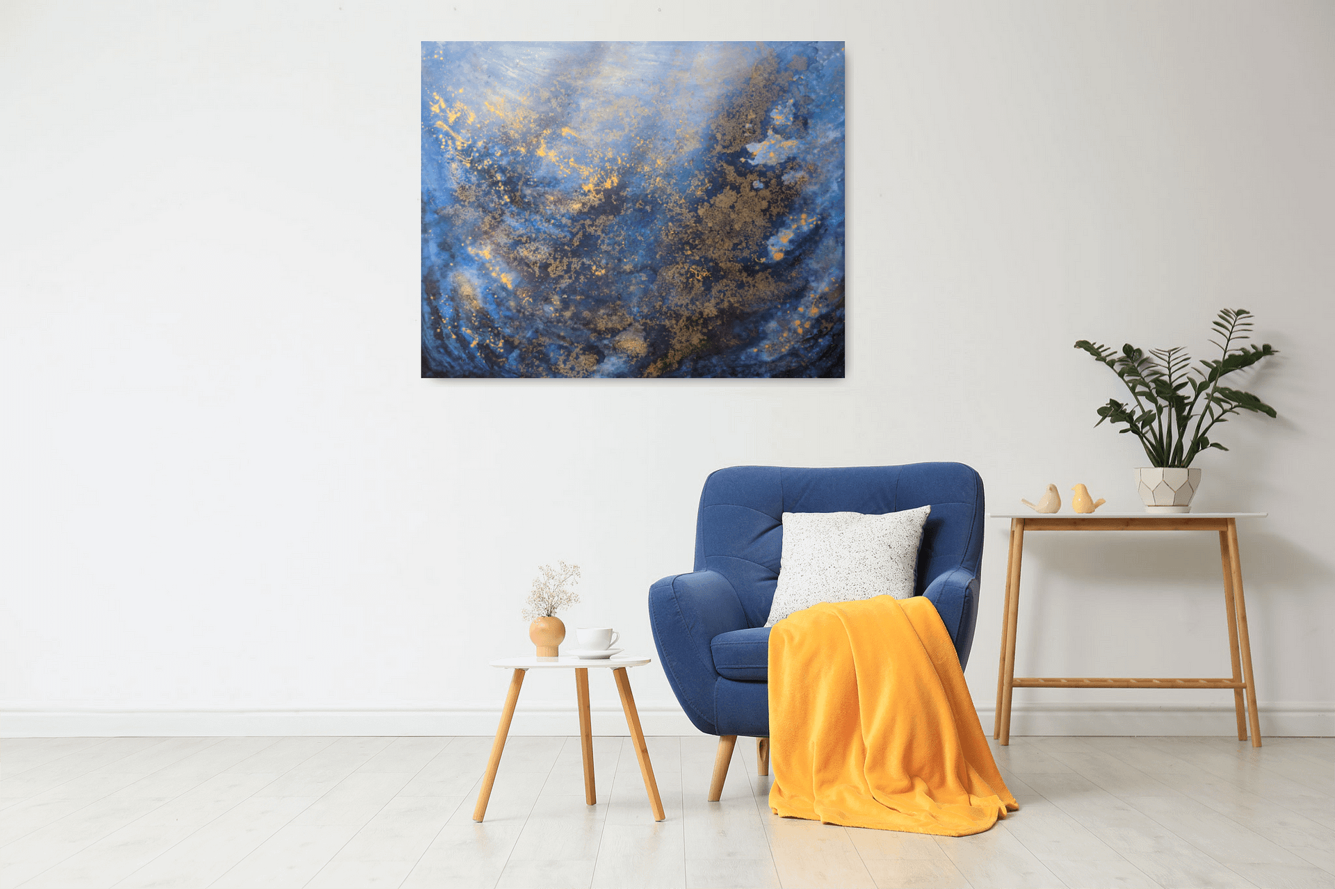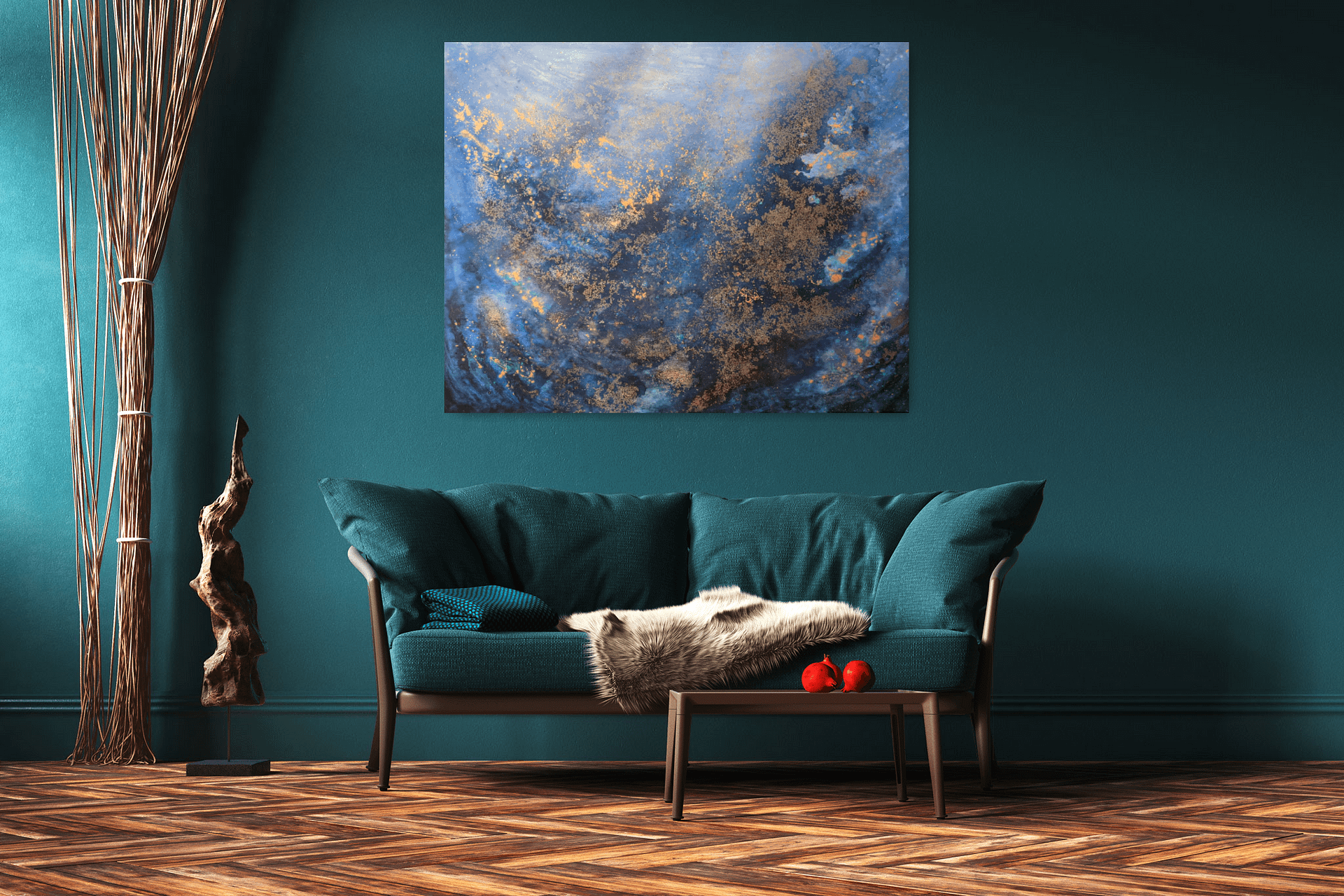 Materiál: plátno natažené na dřevěném rámu, akrylová barva, alkoholový inkoust, zlatá barva, lesklý lak.