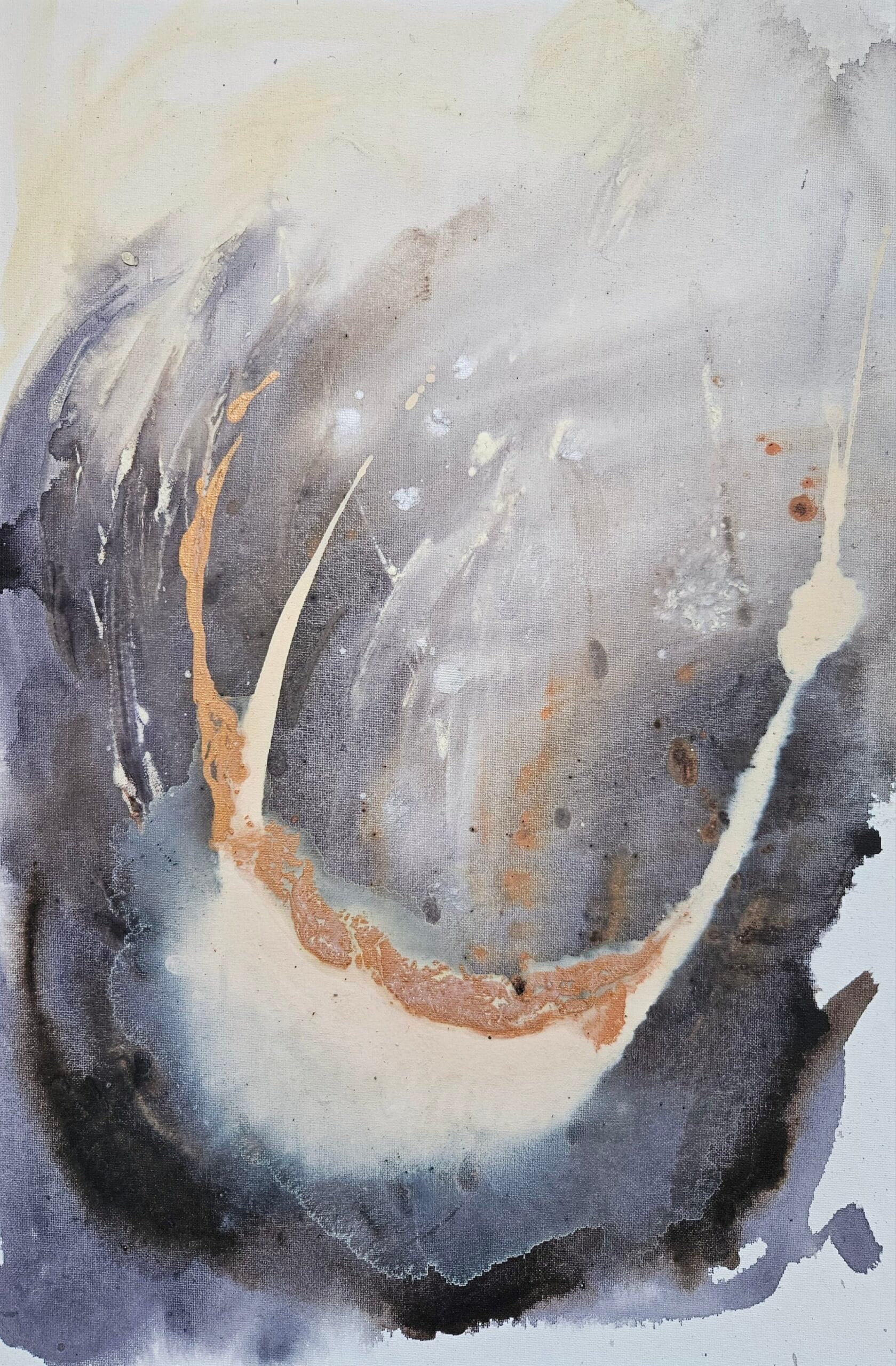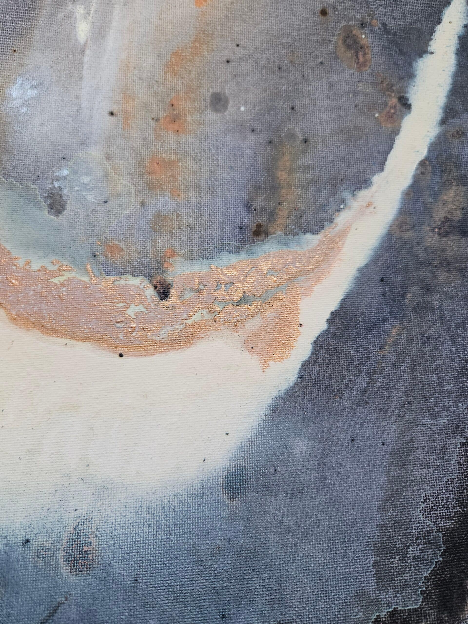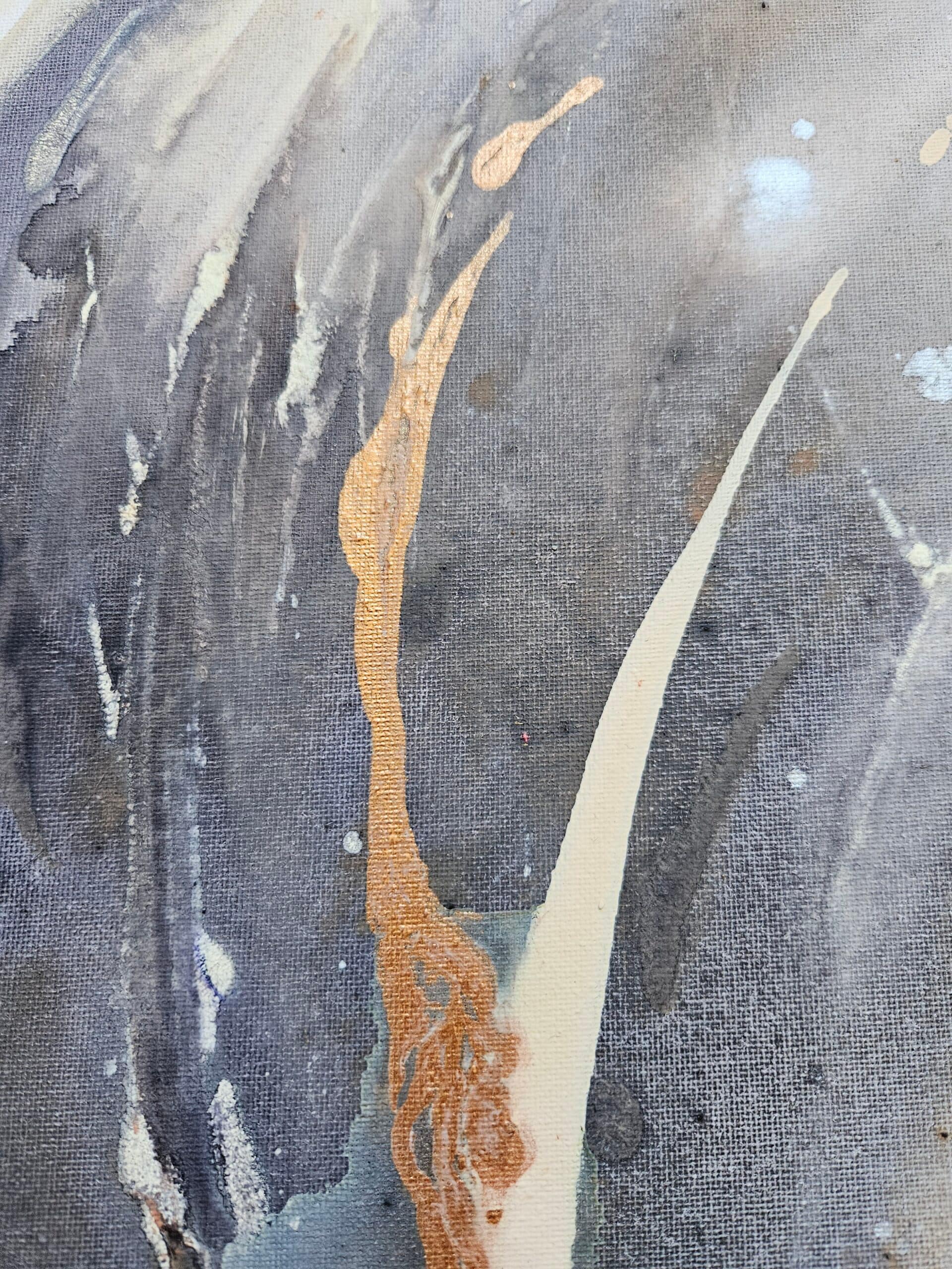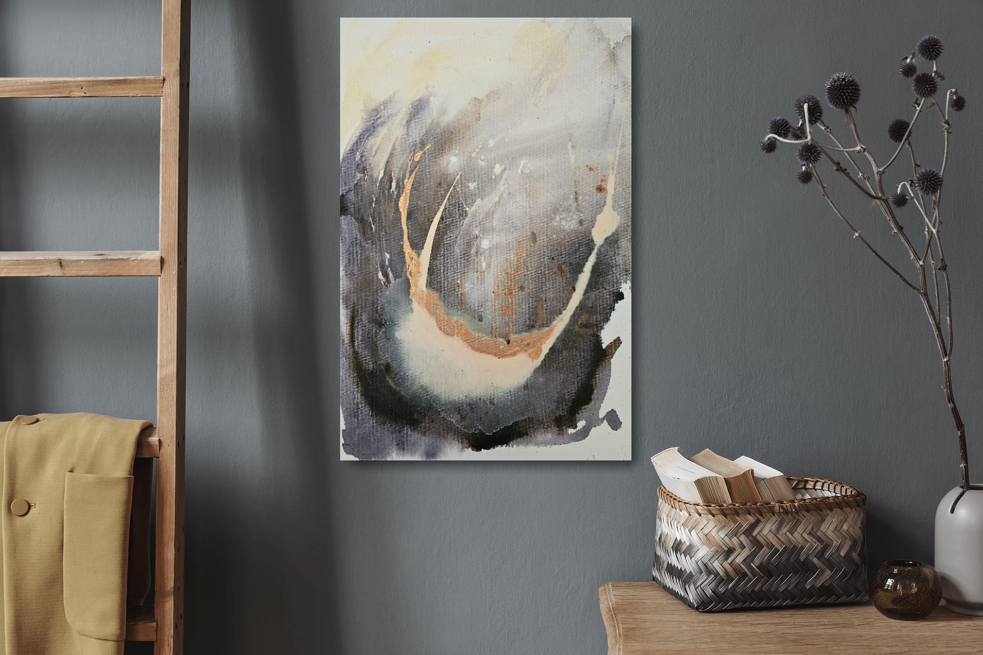 Abstraktní malba na plátně na lepence plynoucí v tónech šedé, brozové a jemných zlatých akcentů.
