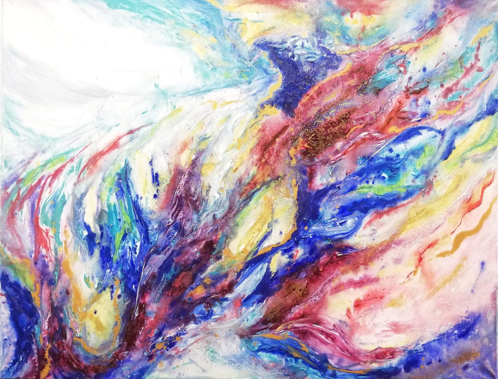 Original, modern abstract acrylic painting on a stretched canvas in blue, magenta, gold and green colours.