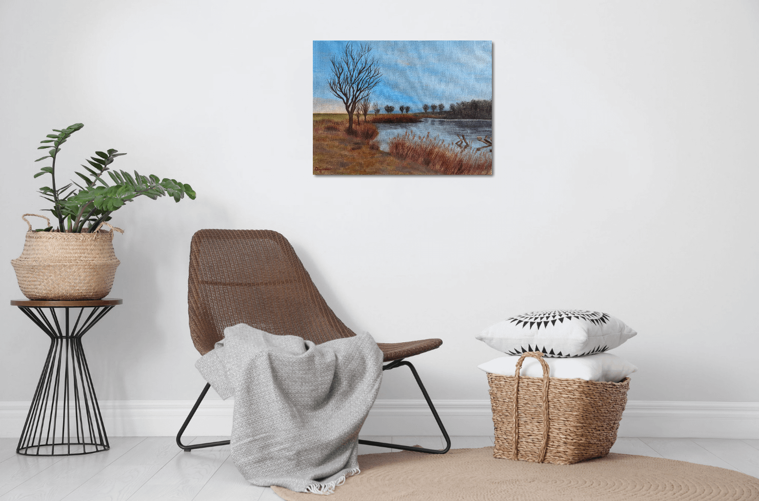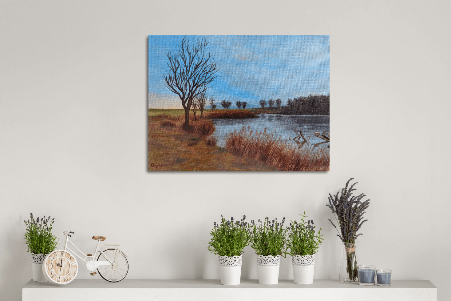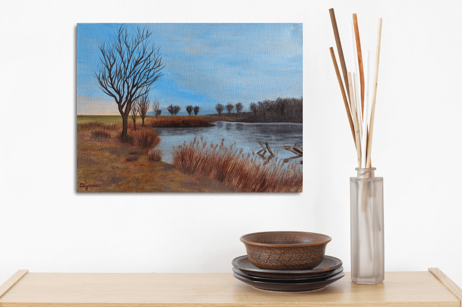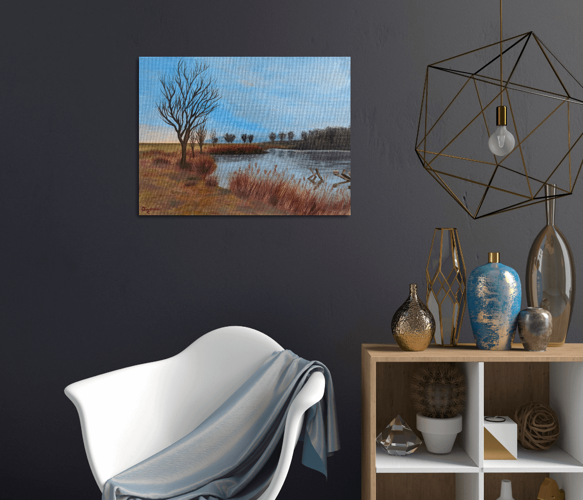 This painting can help you brighten any room and bring colors to your home with a view over a small lake and trees in the background.
