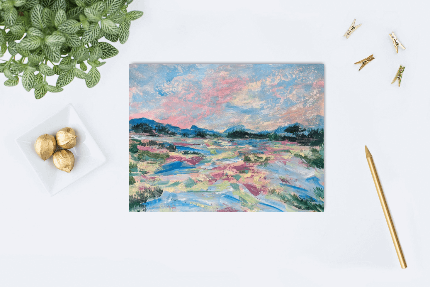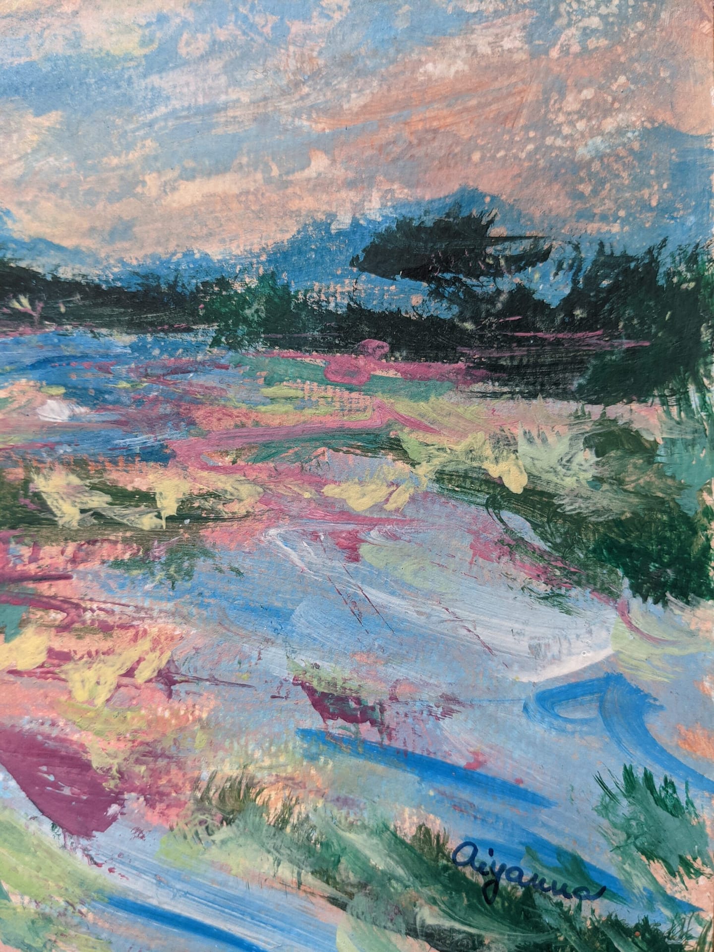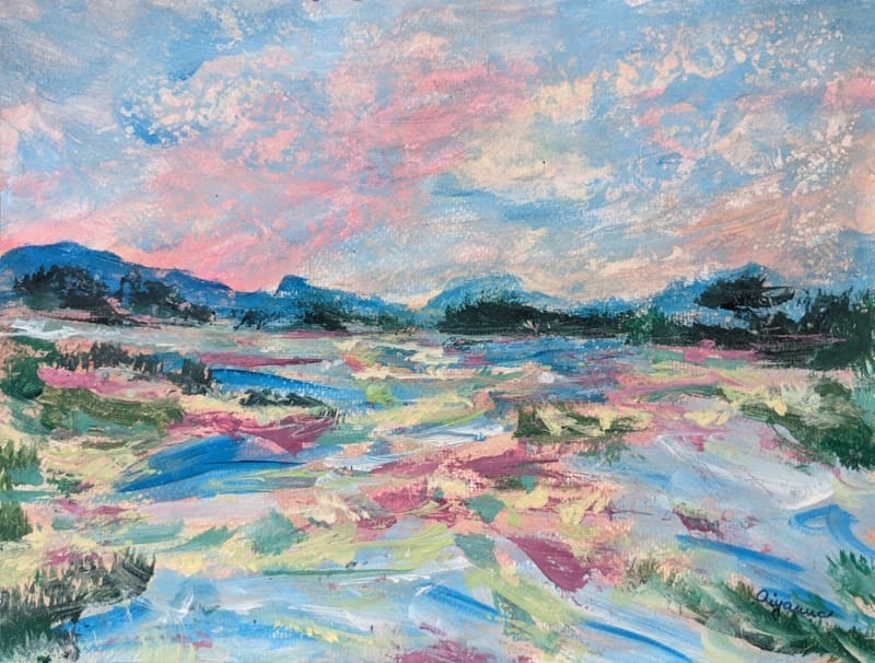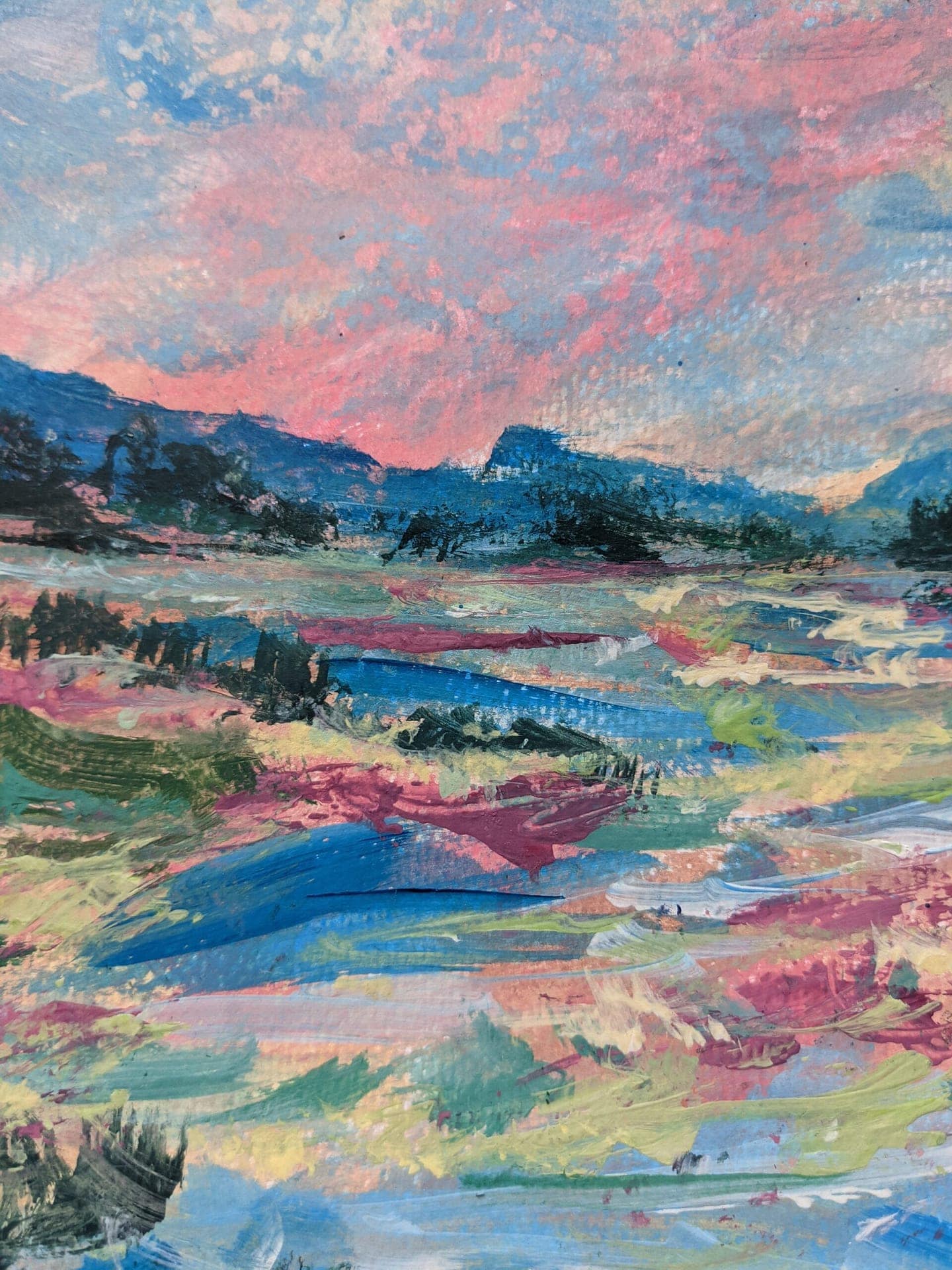 Technique: hand-painted original artwork, palette knife, and brushes; acrylic paint on paper.