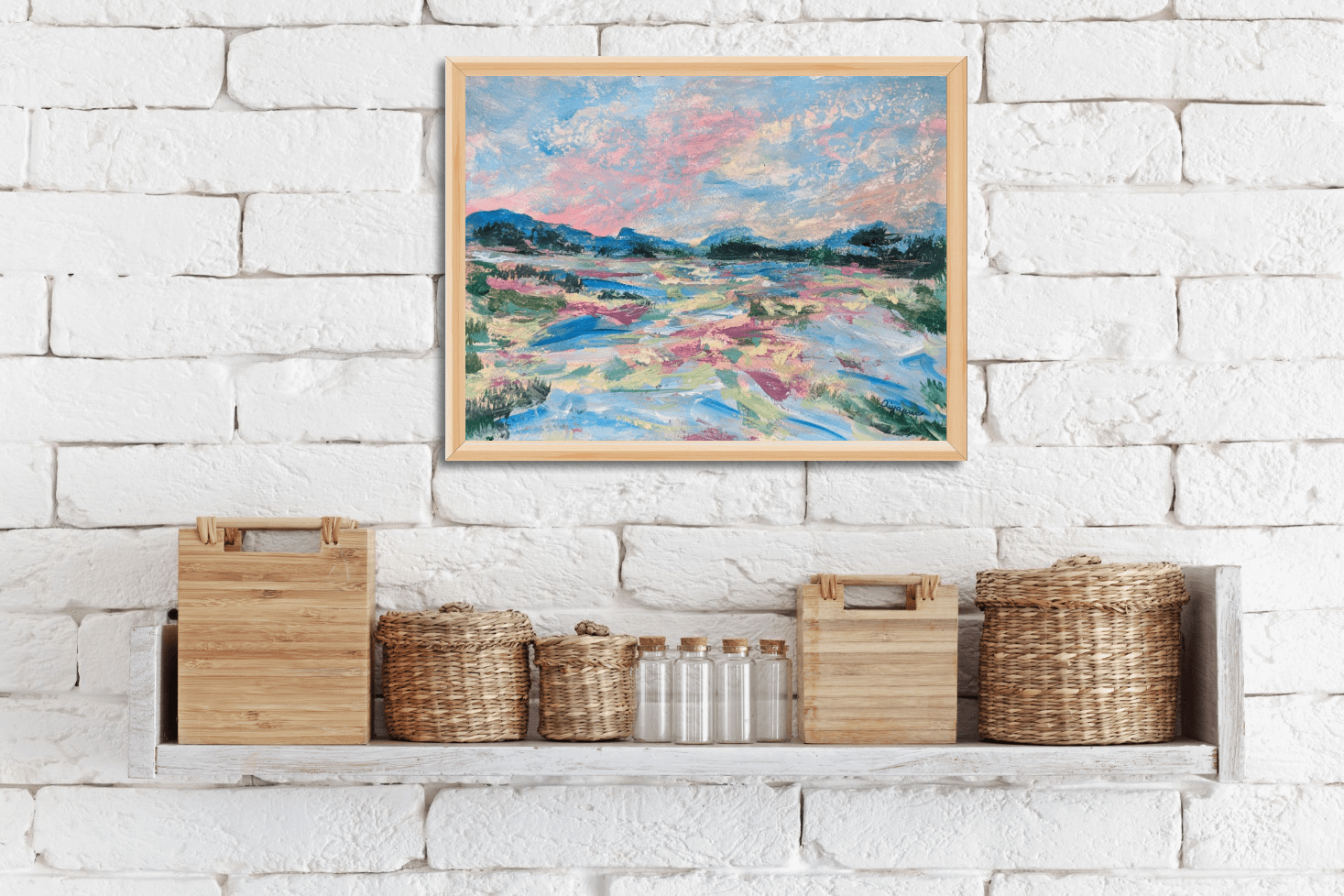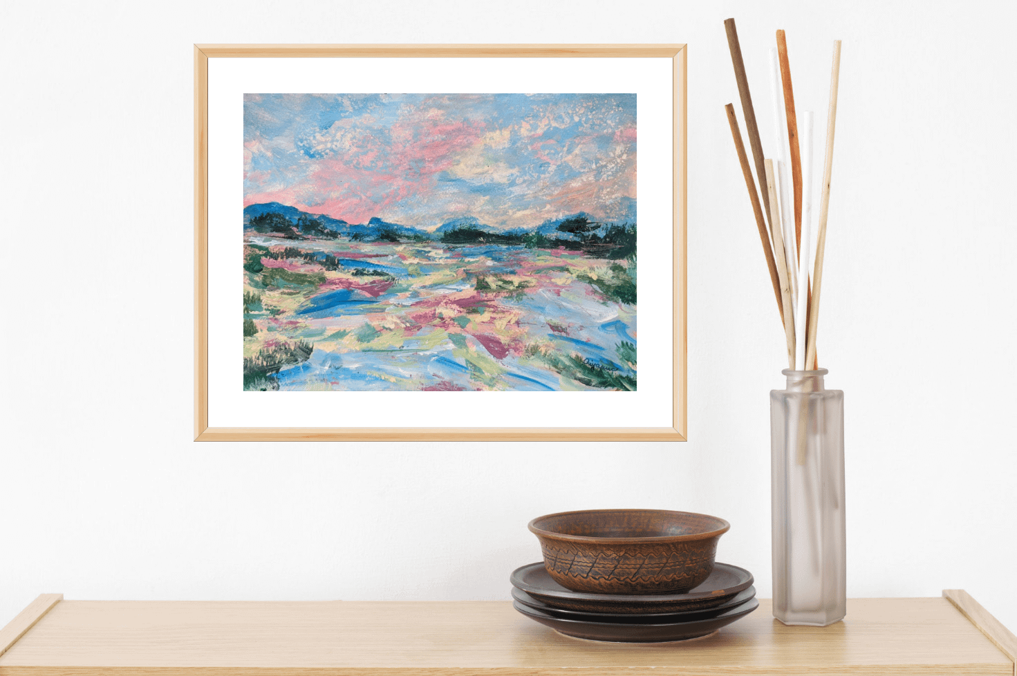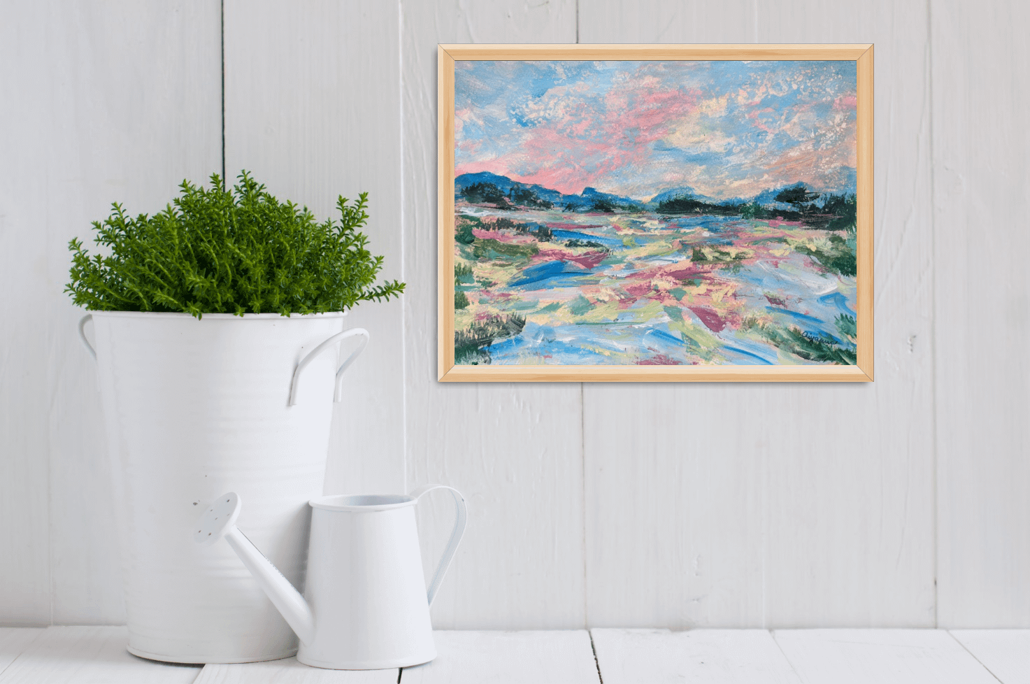 Technique: hand-painted original artwork, palette knife, and brushes; acrylic paint on paper.