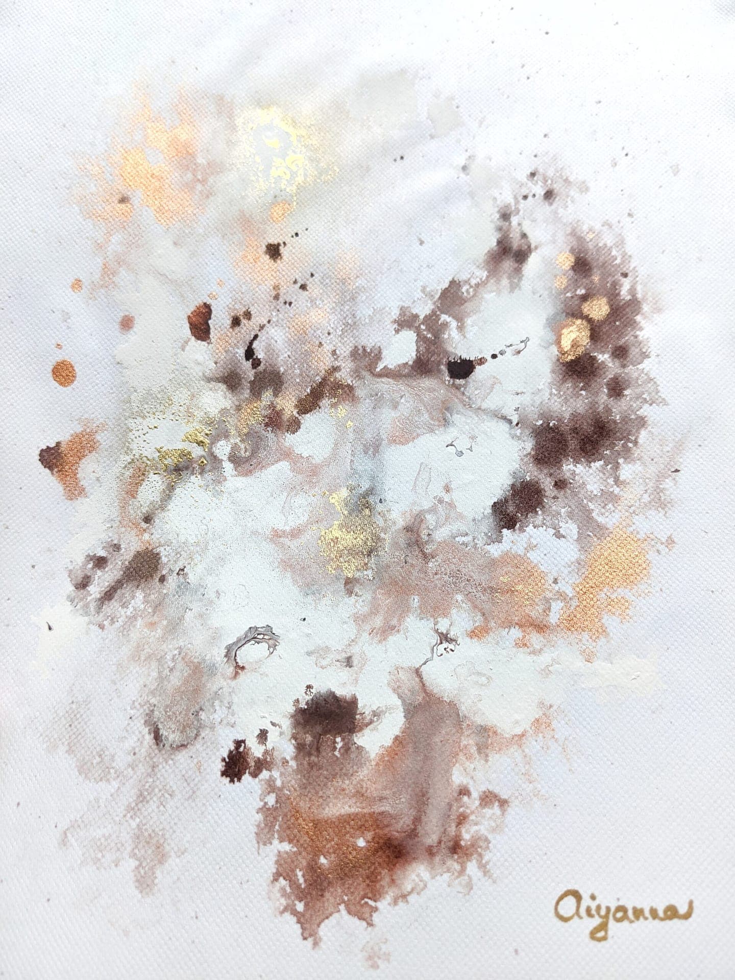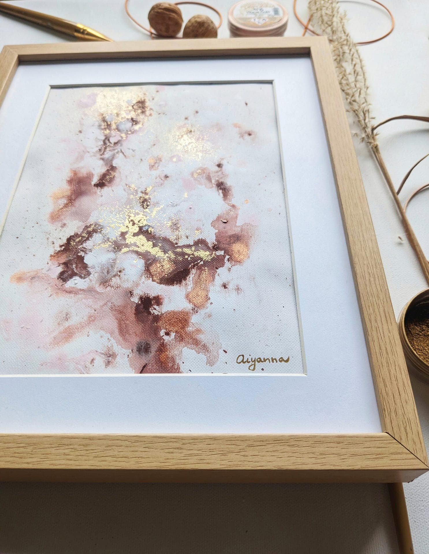 This collection of paintings was inspired by the heartfelt gratitude and love that I feel in my life. These paintings are carrying within themselves a warm image of a safe home and a beautiful feeling of loving and being loved. Brown tones for cozy, earthy warmth, pink color for love, and gold particles for the gratitude, that I feel for all that we have.