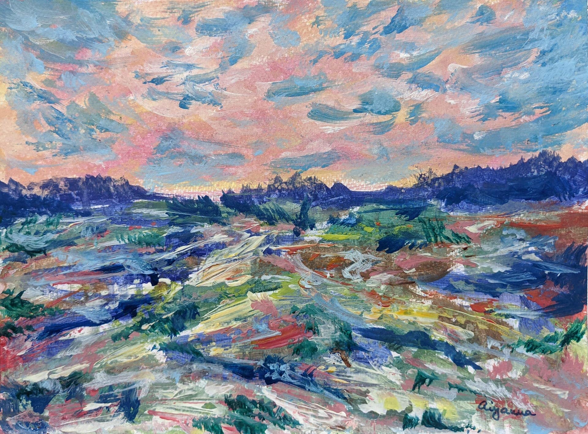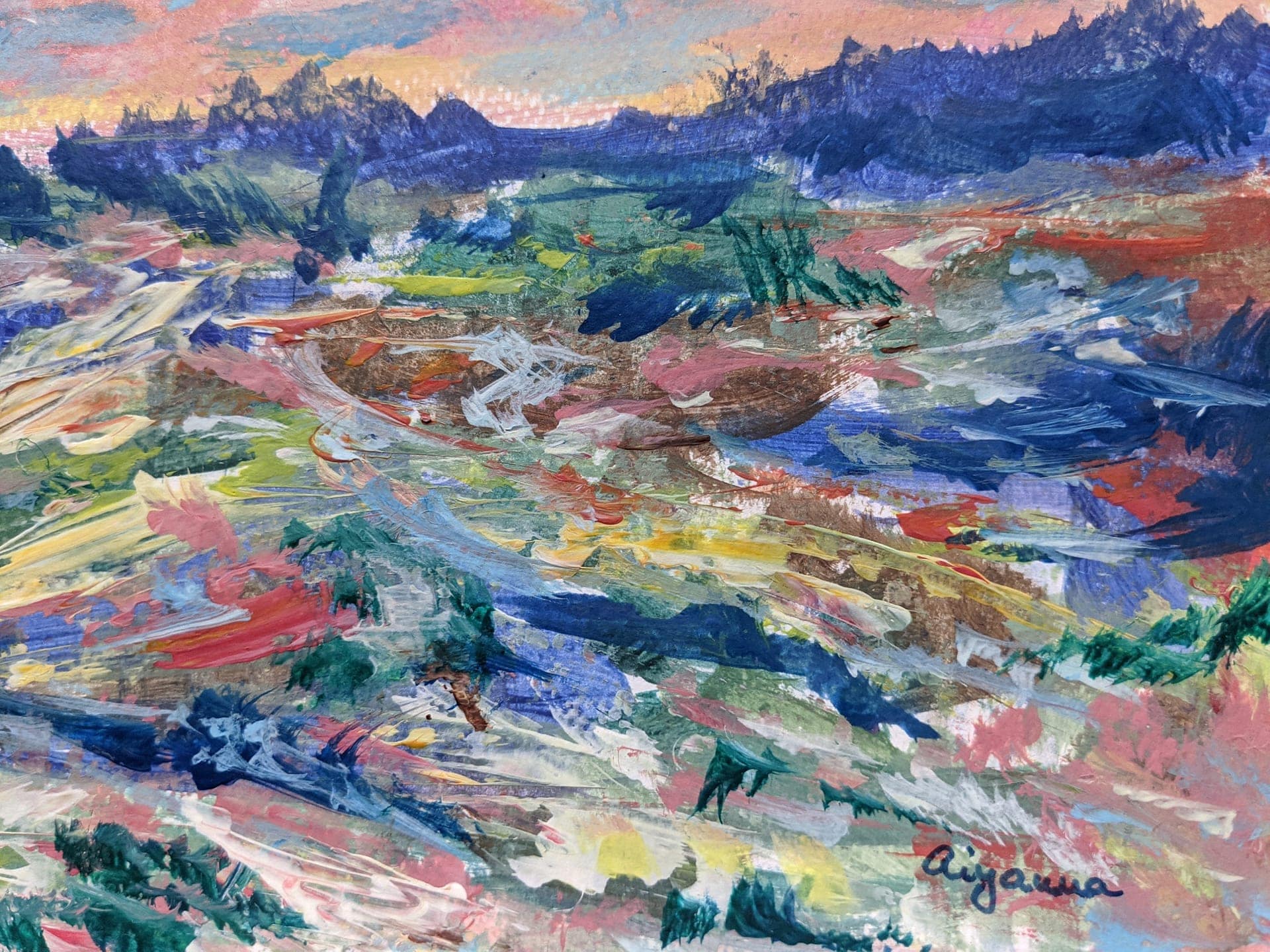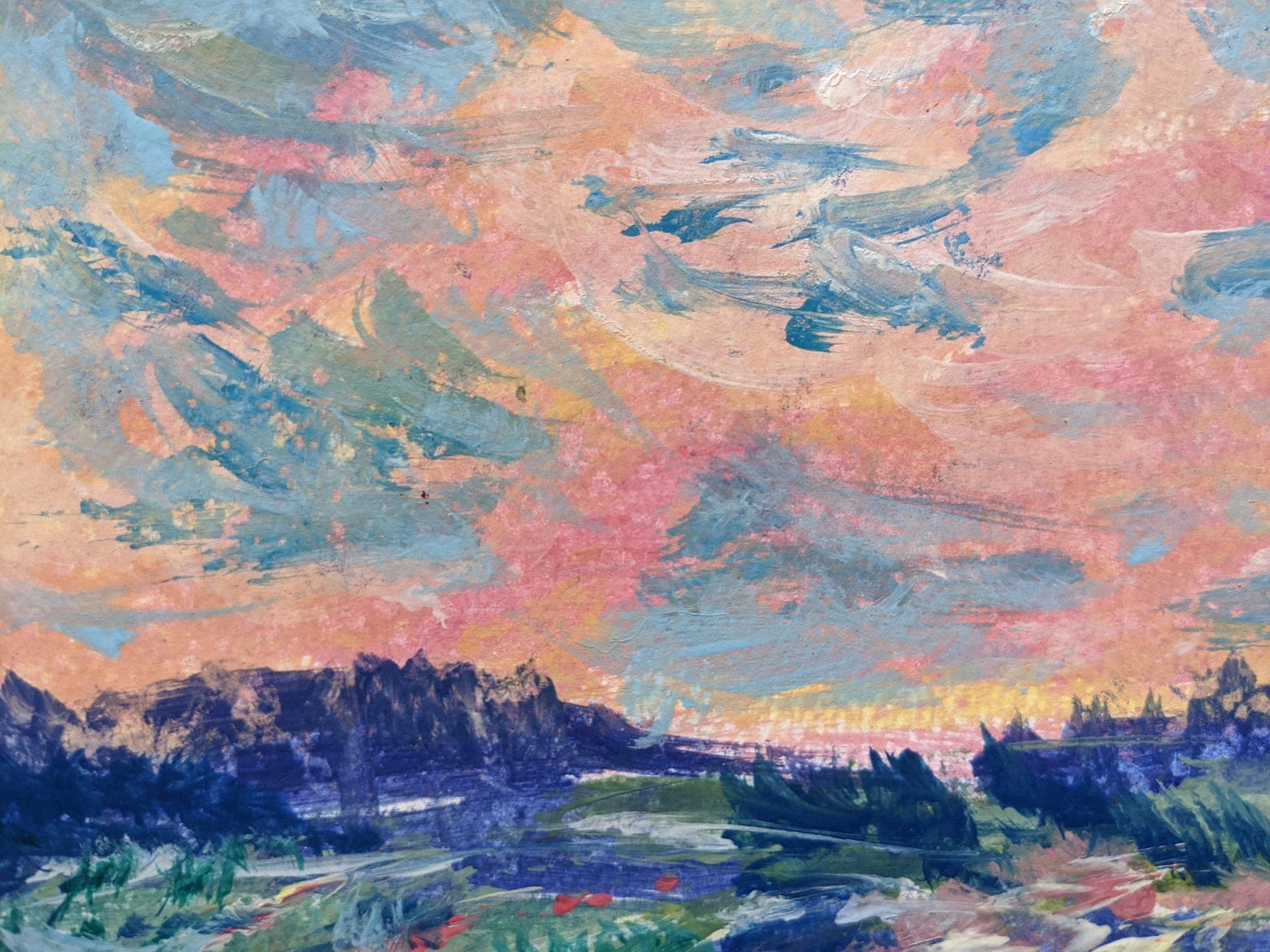 Technique: hand-painted original artwork, palette knife, and brushes; acrylic paint on paper.