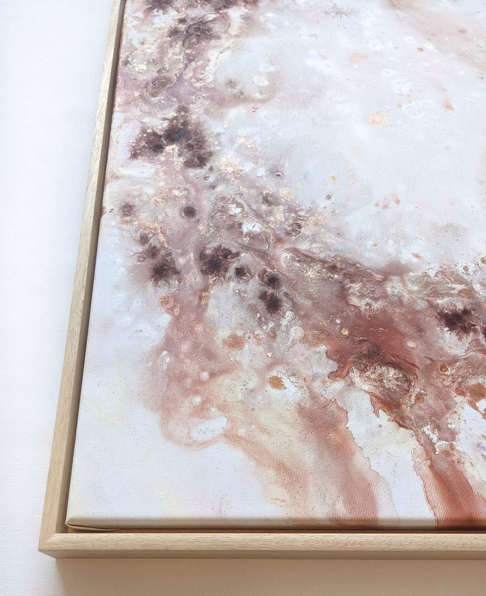 This collection of paintings was inspired by the heartfelt gratitude and love that I feel in my life. These paintings are carrying within themselves a warm image of a safe home and a beautiful feeling of loving and being loved. Brown tones for cozy, earthy warmth, pink color for love and gold particles for the gratitude, that I feel for all that we have.