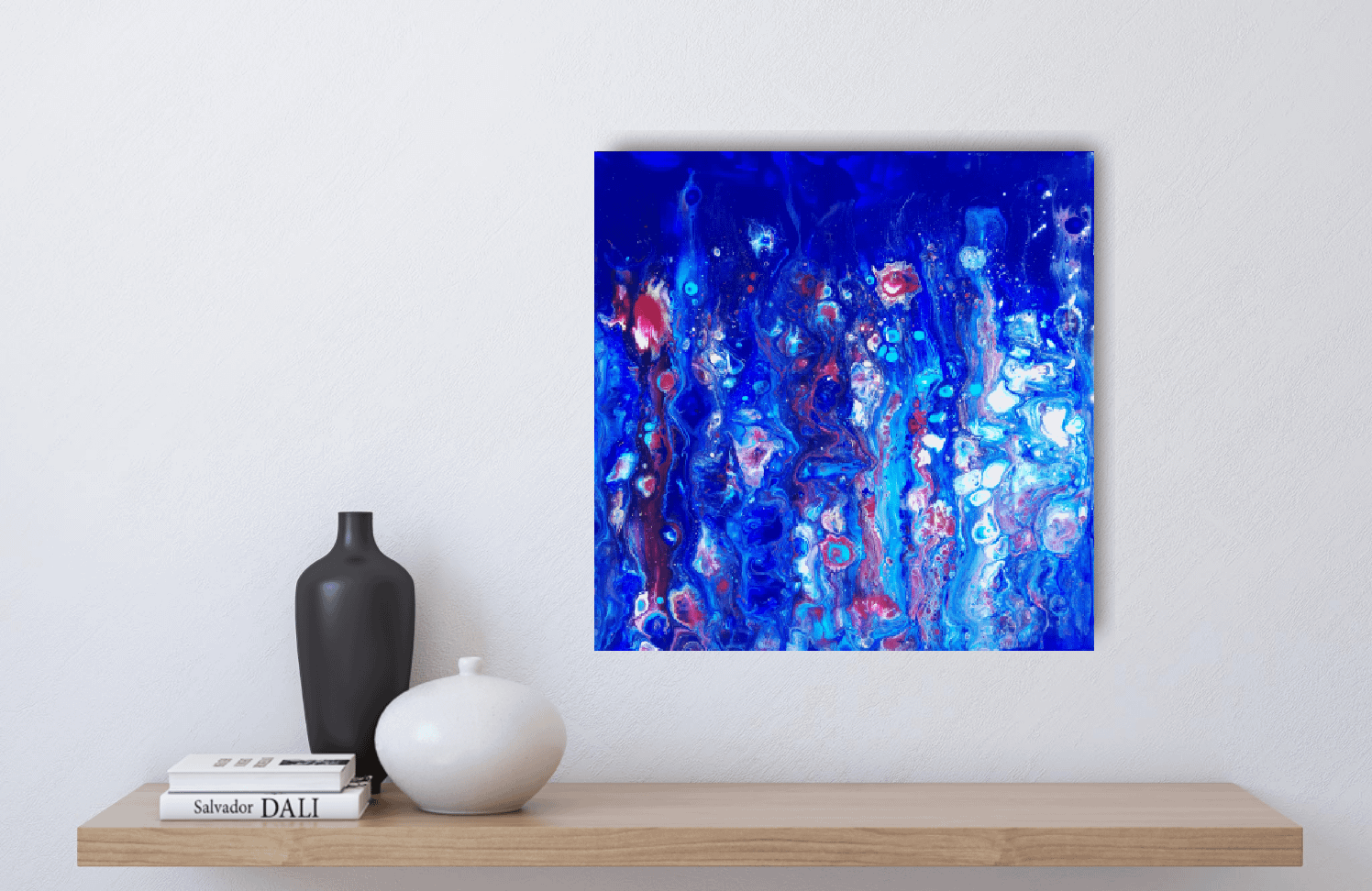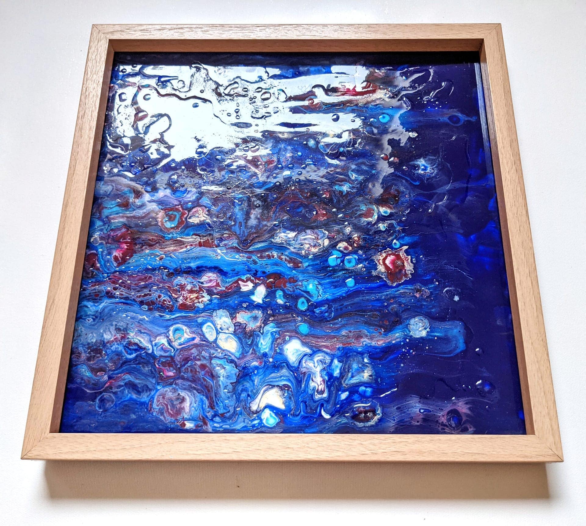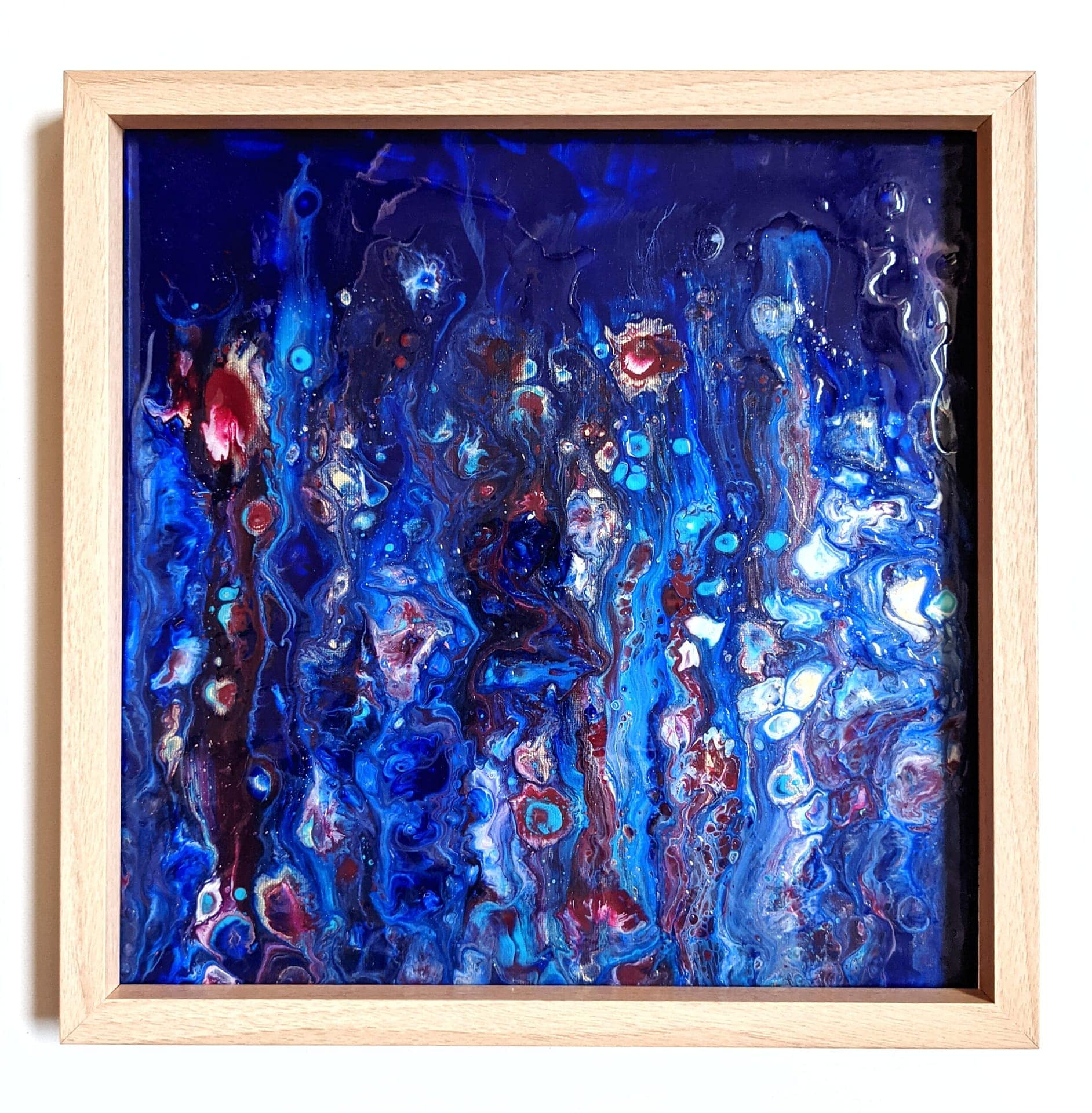 The painting is painted with acrylic paint, topcoat is resin with a beautiful shine and water resemblance. There are drops of the resin in 3D format, you can see more structure on the photos. This water-like surface is created with the resin so the painting has a special effect.