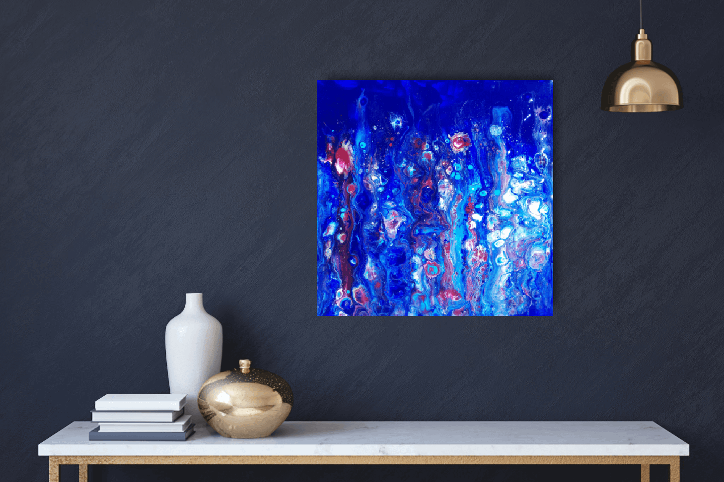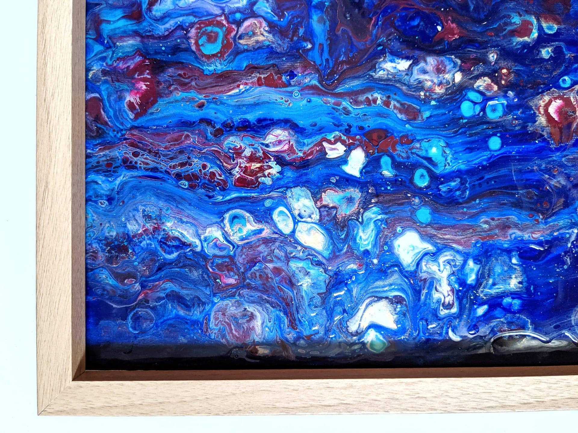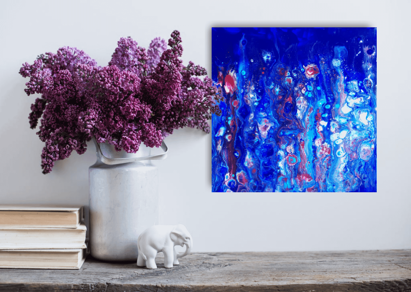The painting is painted with acrylic paint, topcoat is resin with a beautiful shine and water resemblance. There are drops of the resin in 3D format, you can see more structure on the photos. This water-like surface is created with the resin so the painting has a special effect.