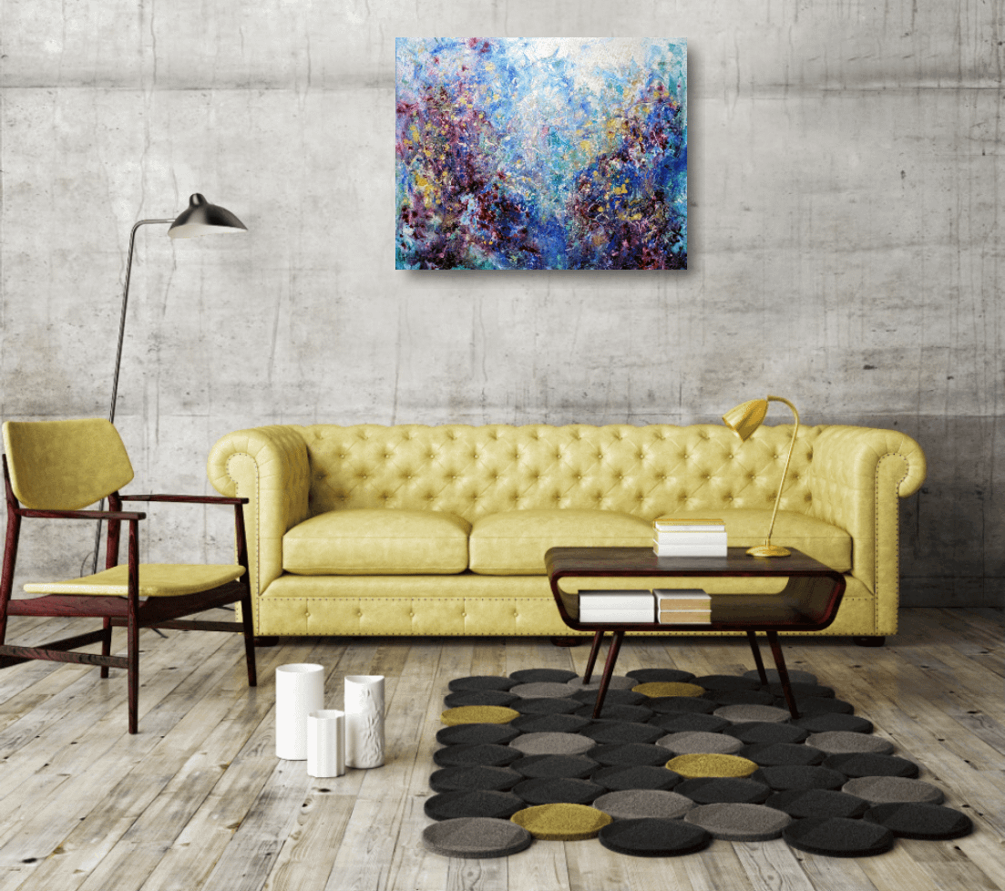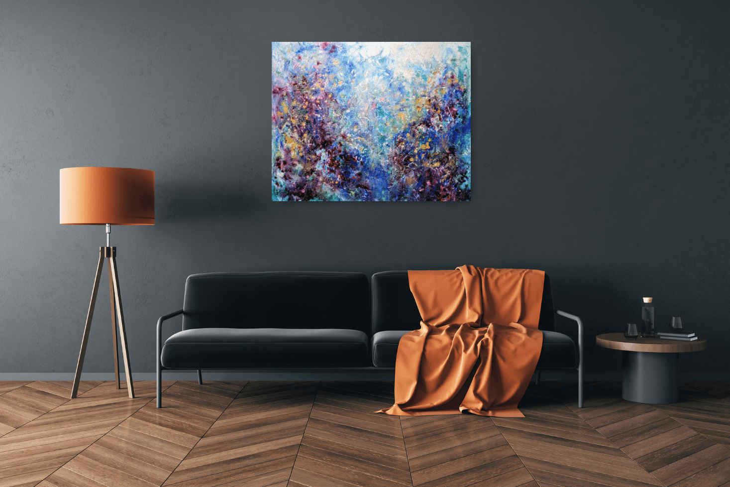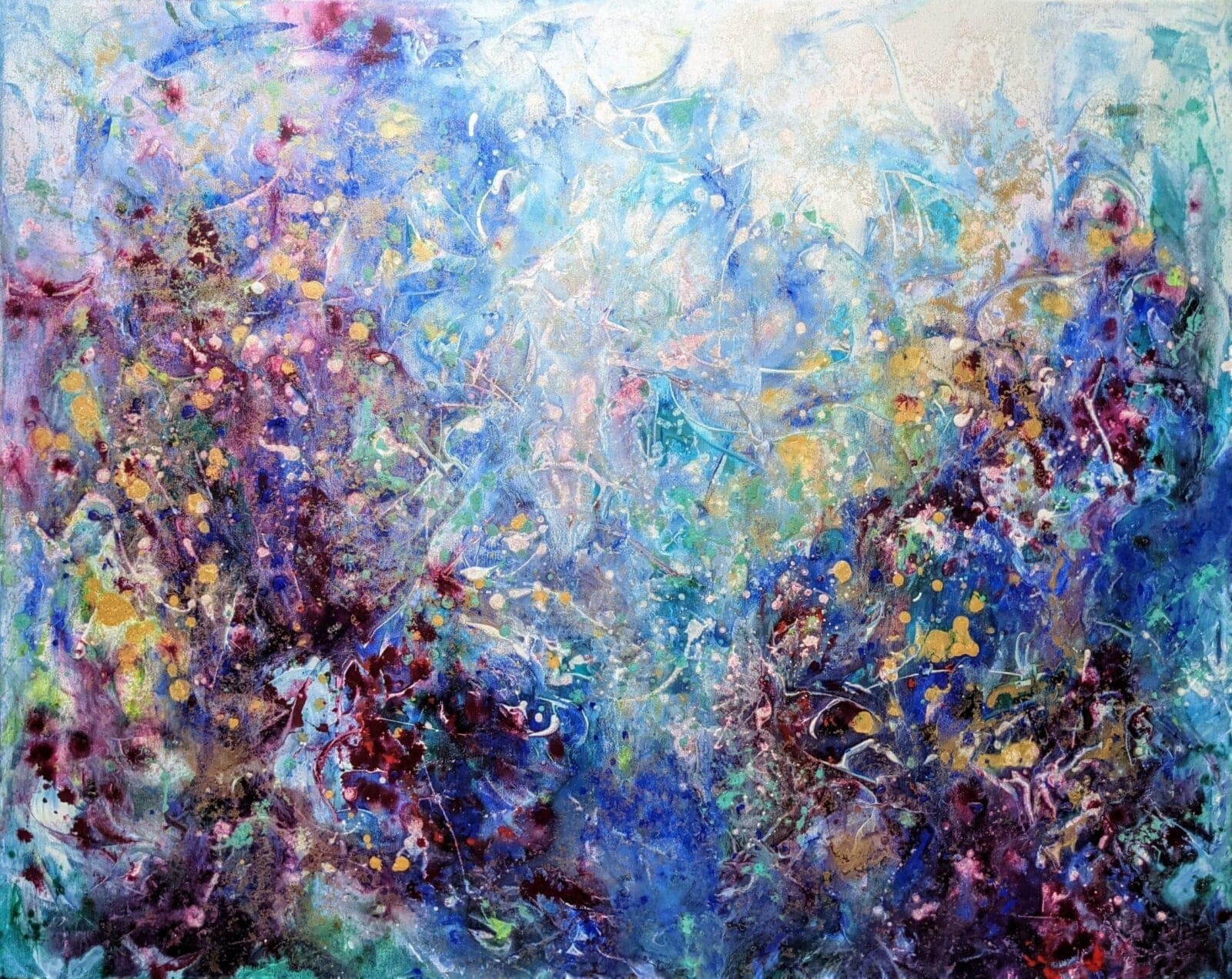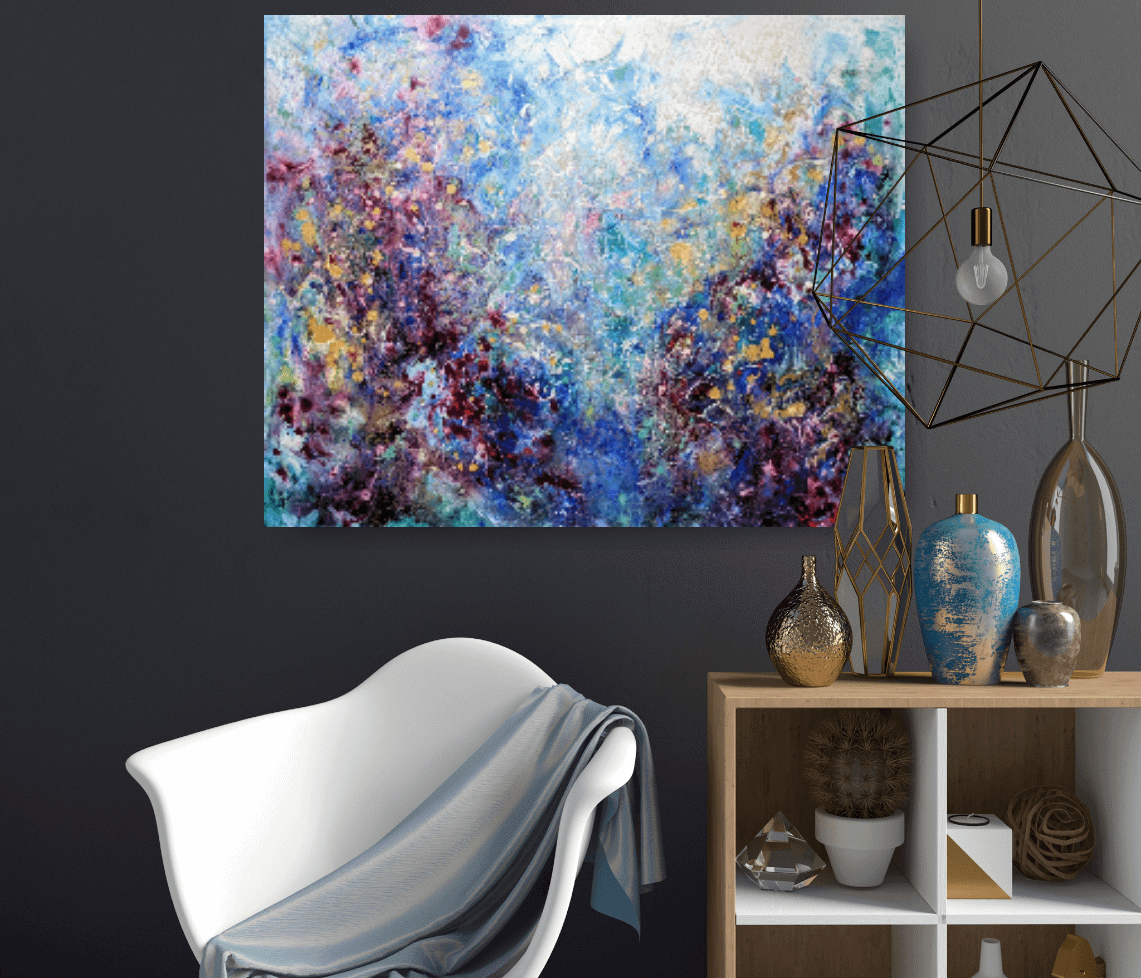 Original, modern abstract acrylic painting on a stretched canvas in blue, magenta, gold and green colours.