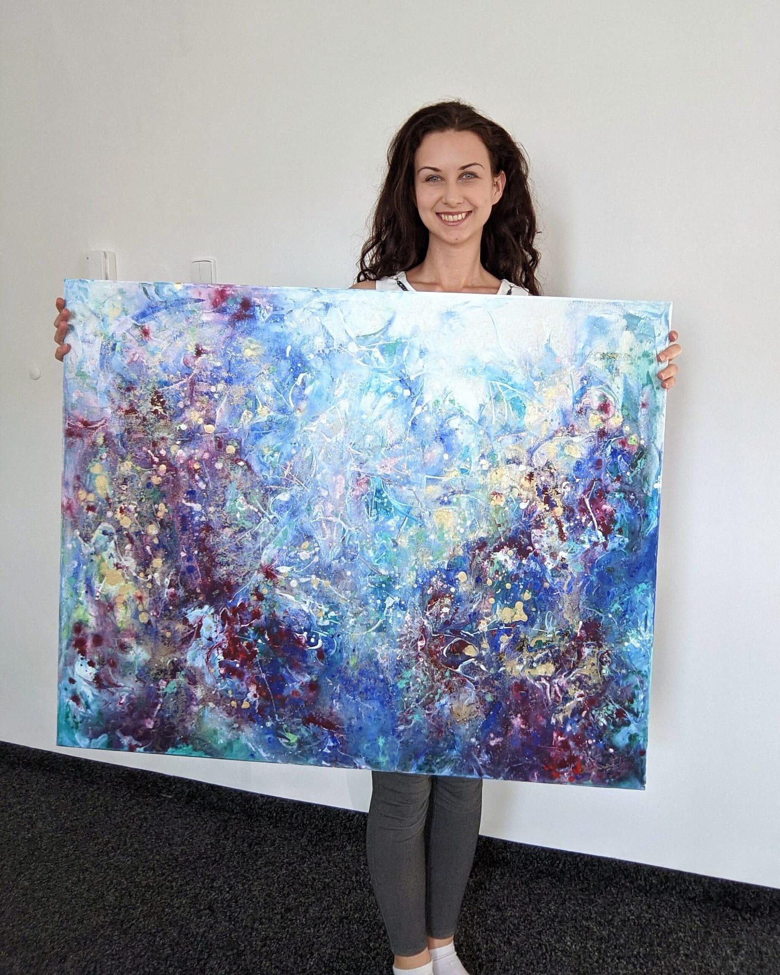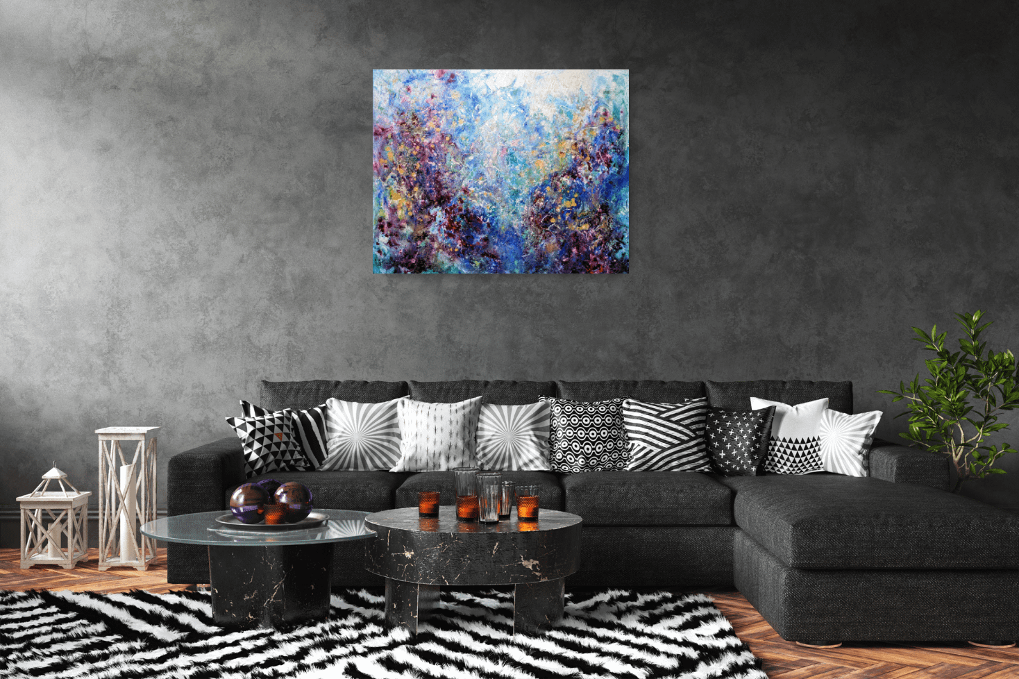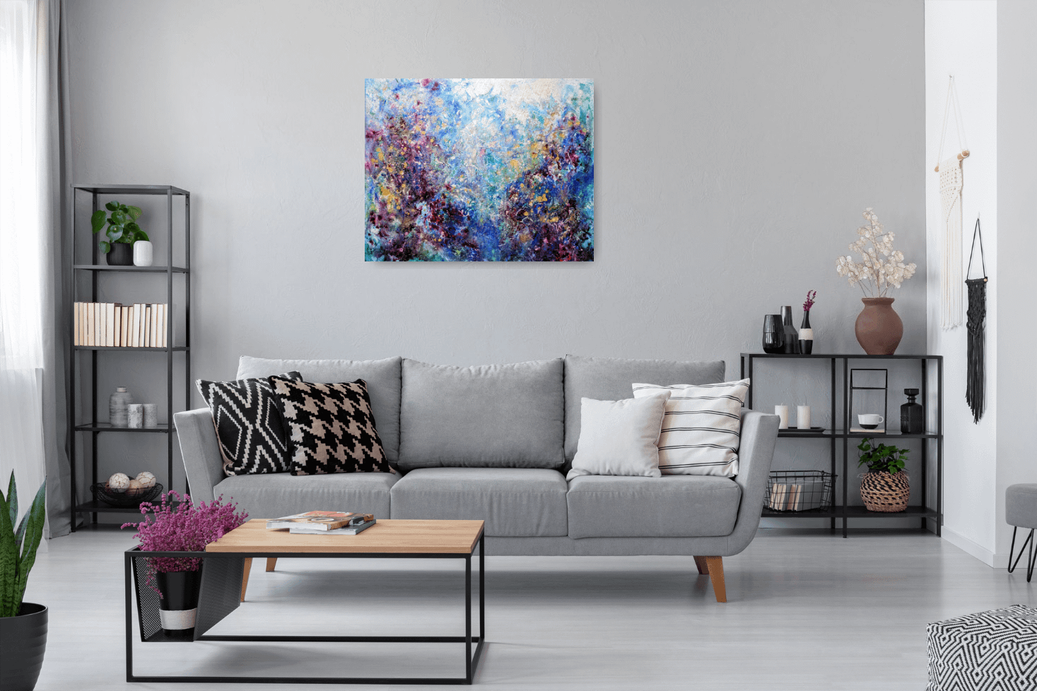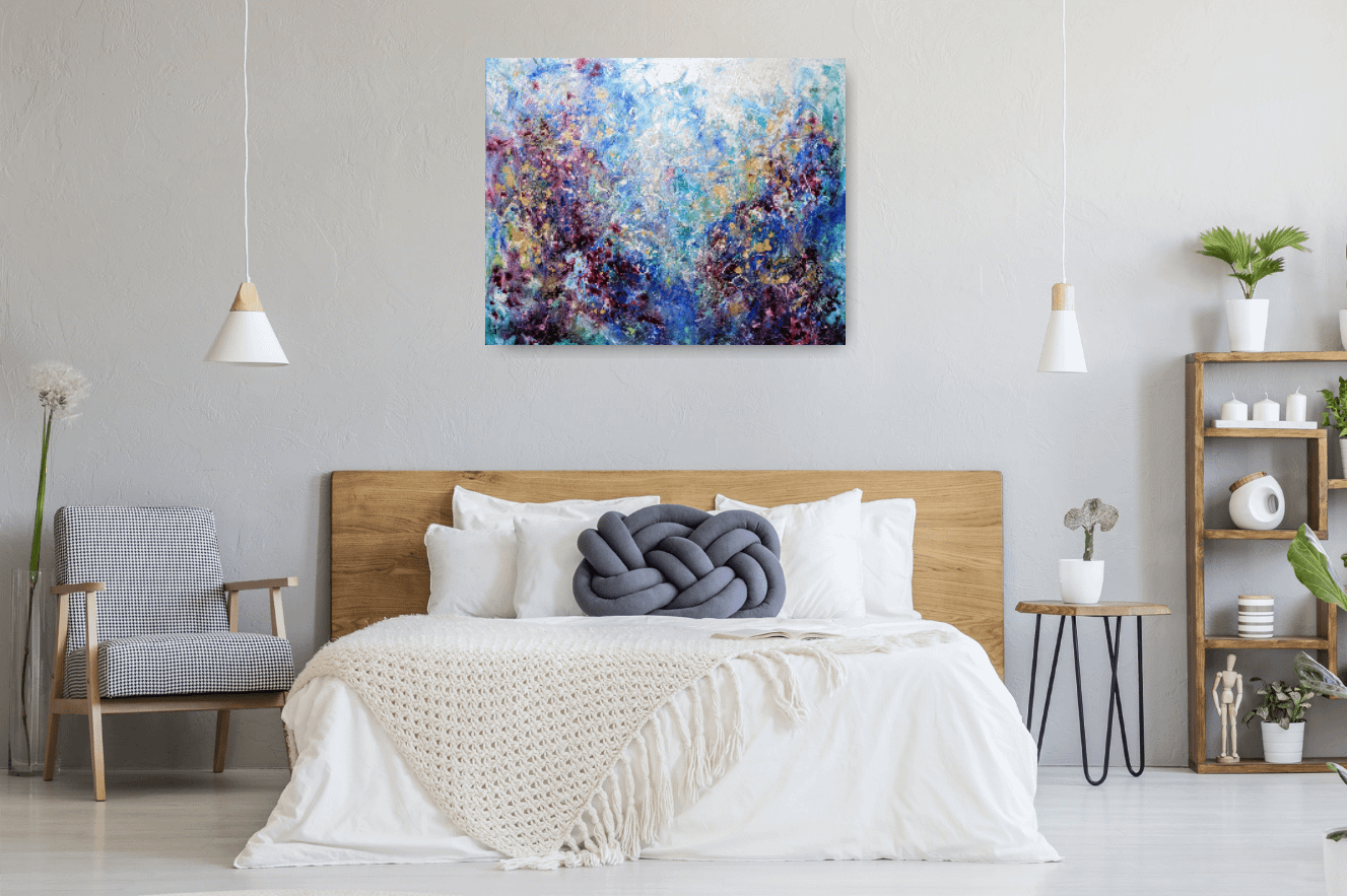 Original, modern abstract acrylic painting on a stretched canvas in blue, magenta, gold and green colours.