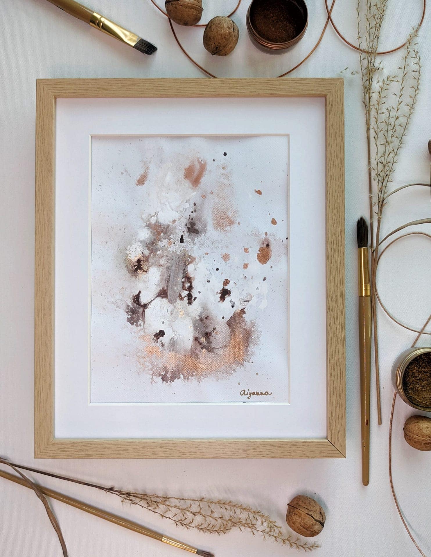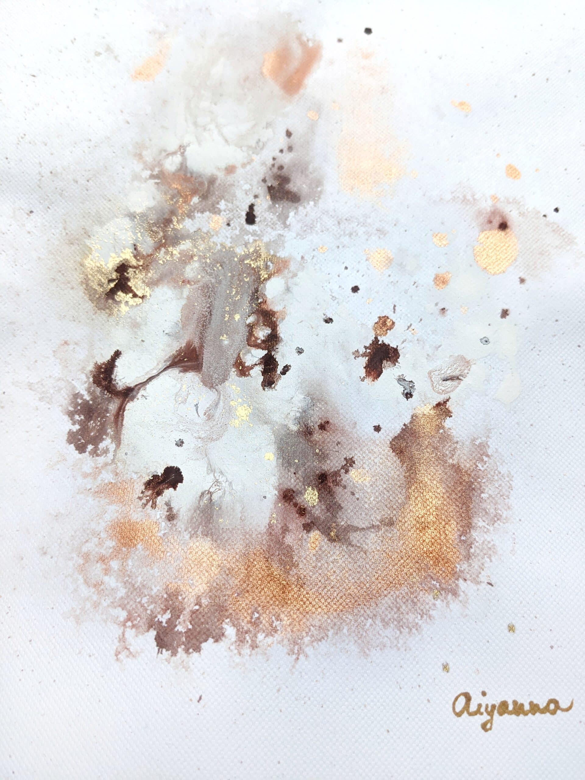 An abstract painting made of acrylic paint and golden pigments on watercolor paper, framed in a wooden frame with matboard and glass. The painting is varnished and signed.