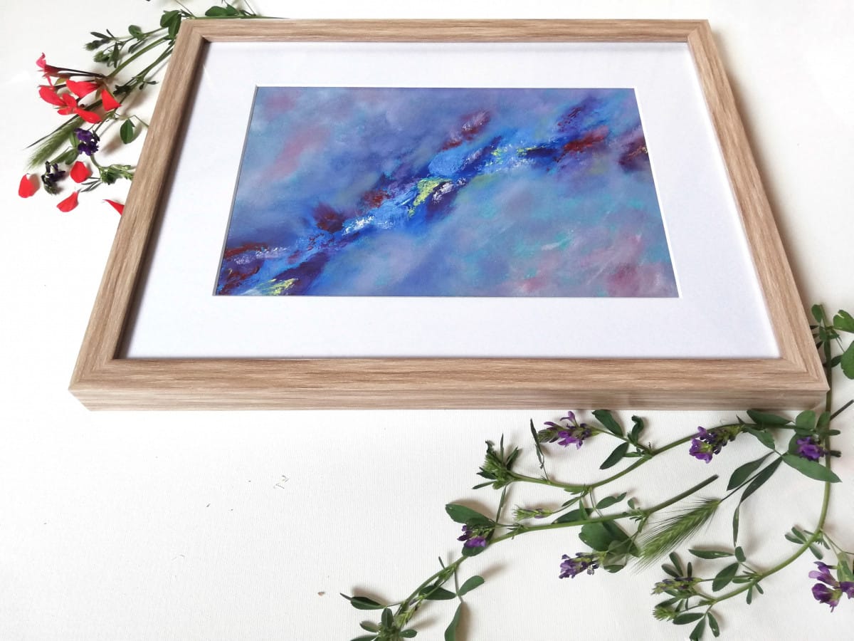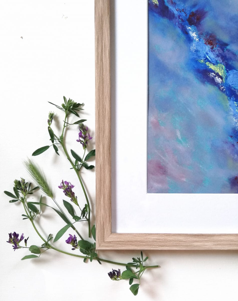 Material: watercolour paper framed in a wooden frame with mat board and glass, acrylic paint, alcohol ink, golden paint, glossy varnish.