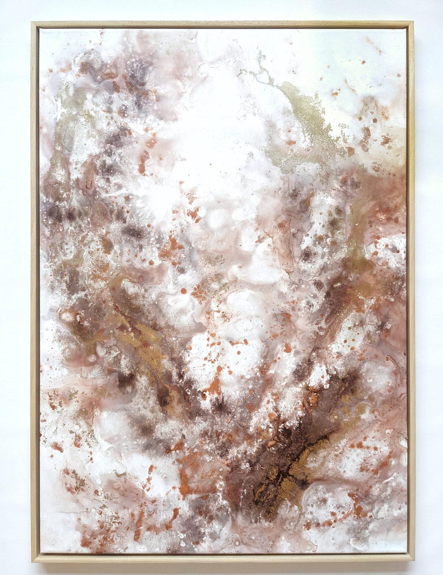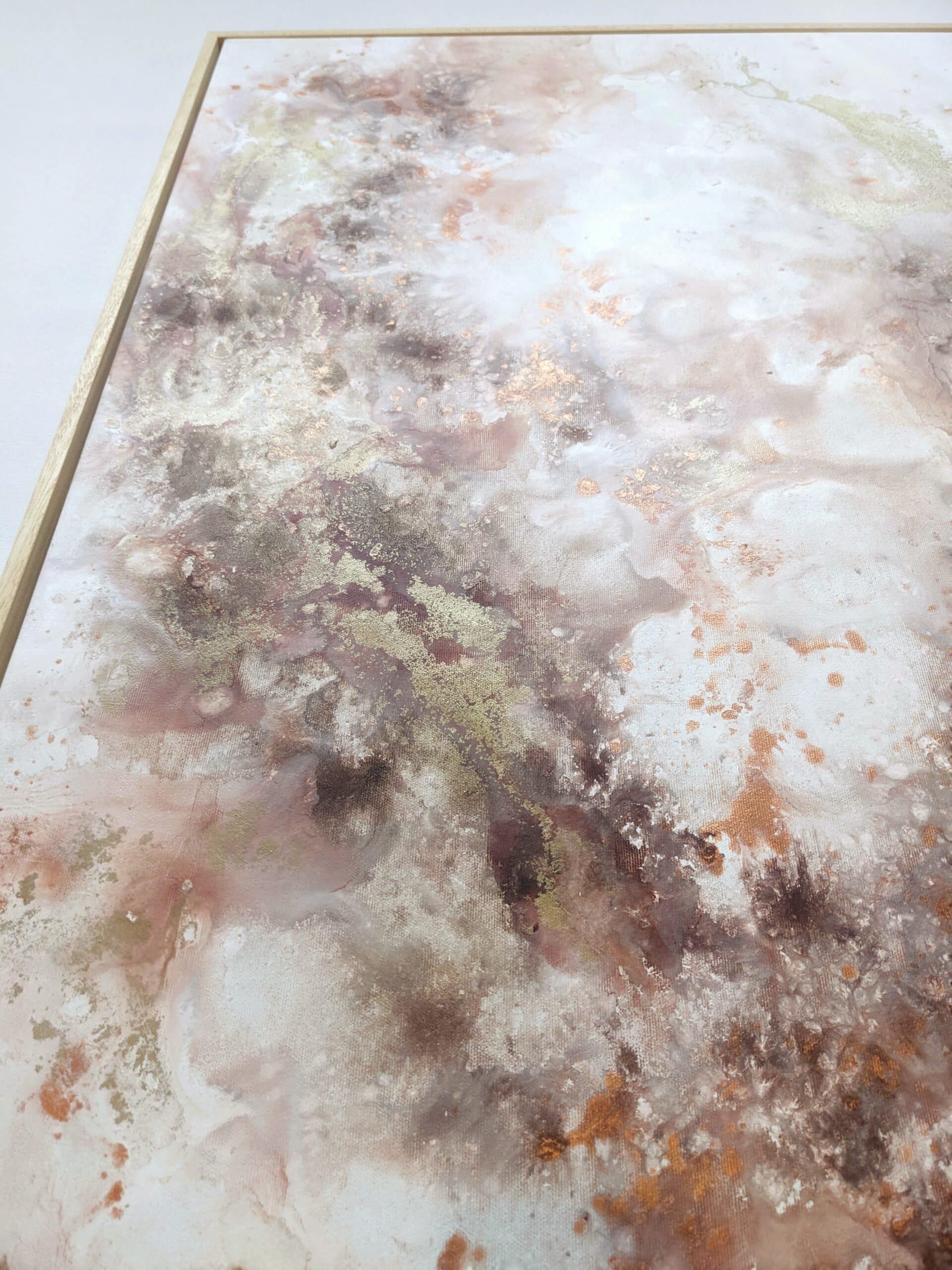An abstract painting made of acrylic paint and golden pigments on stretched canvas. The artwork is varnished and signed.
