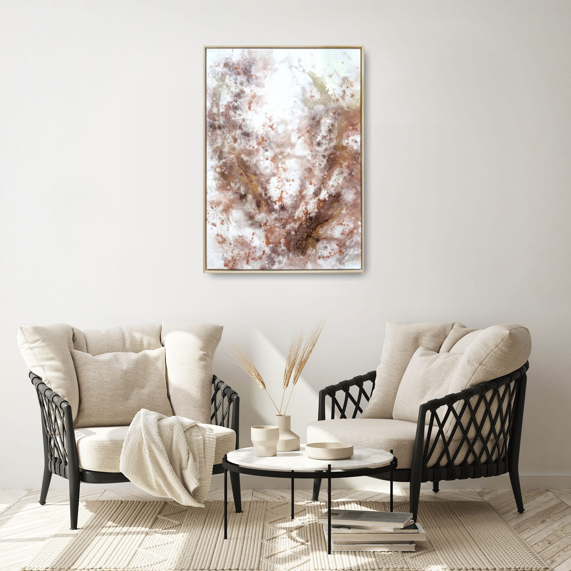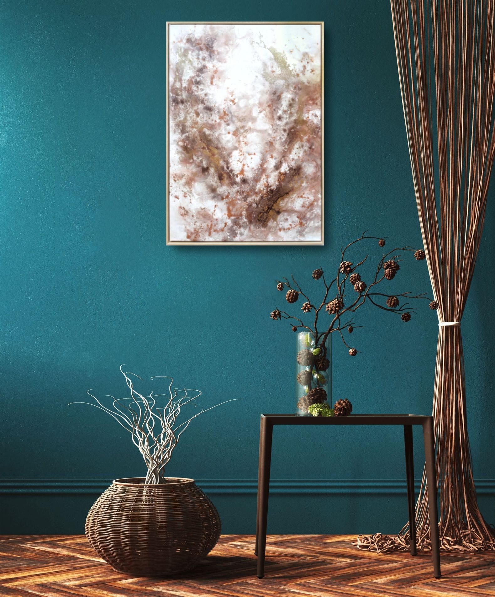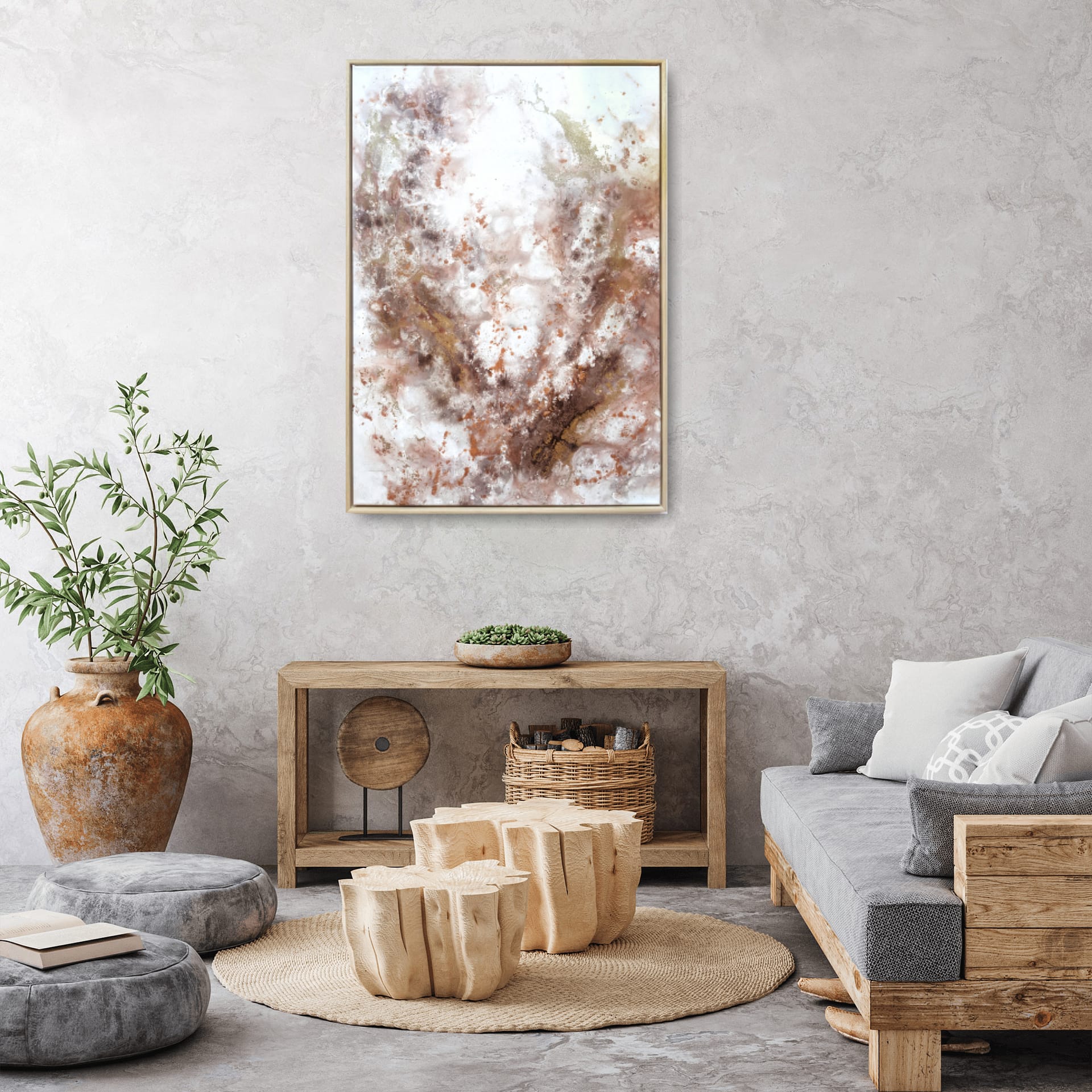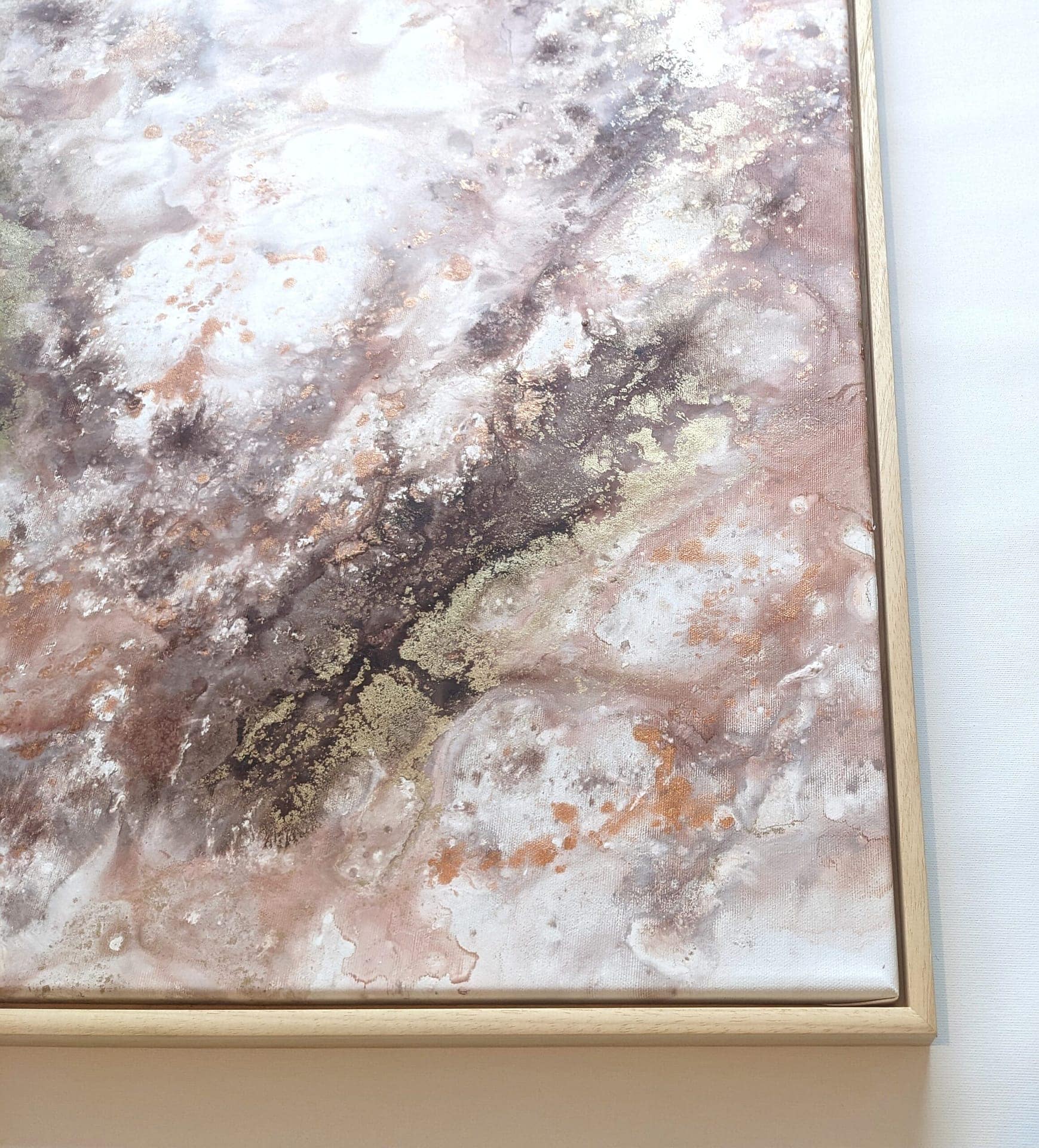 This collection of paintings was inspired by the heartfelt gratitude and love that I feel in my life. These paintings are carrying within themselves a warm image of a safe home and a beautiful feeling of loving and being loved. Brown tones for cozy, earthy warmth, pink color for love and gold particles for the gratitude, that I feel for all that we have.