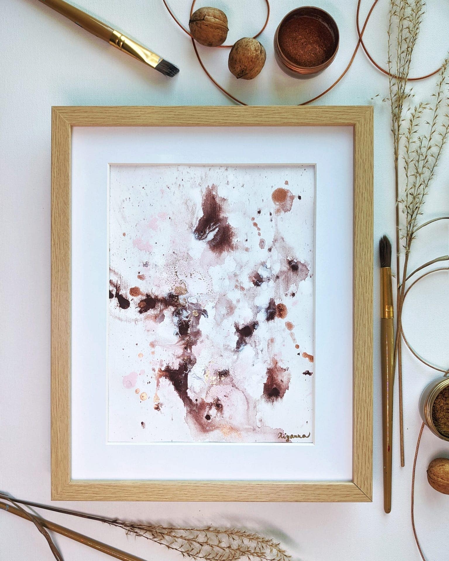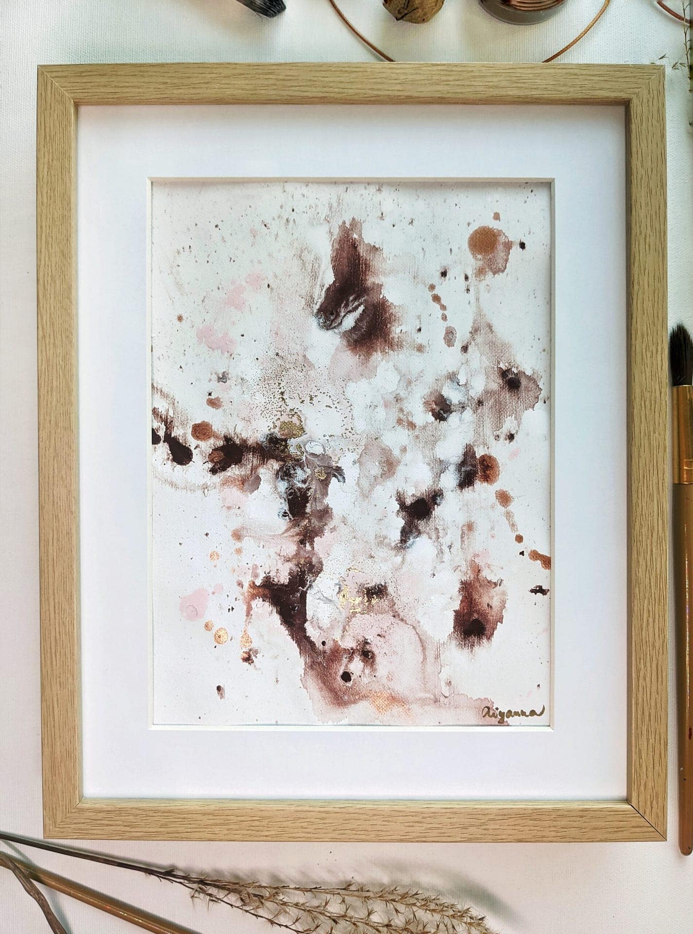 An abstract painting made of acrylic paint and golden pigments on watercolor paper, framed in a wooden frame with matboard and glass. The painting is varnished and signed.