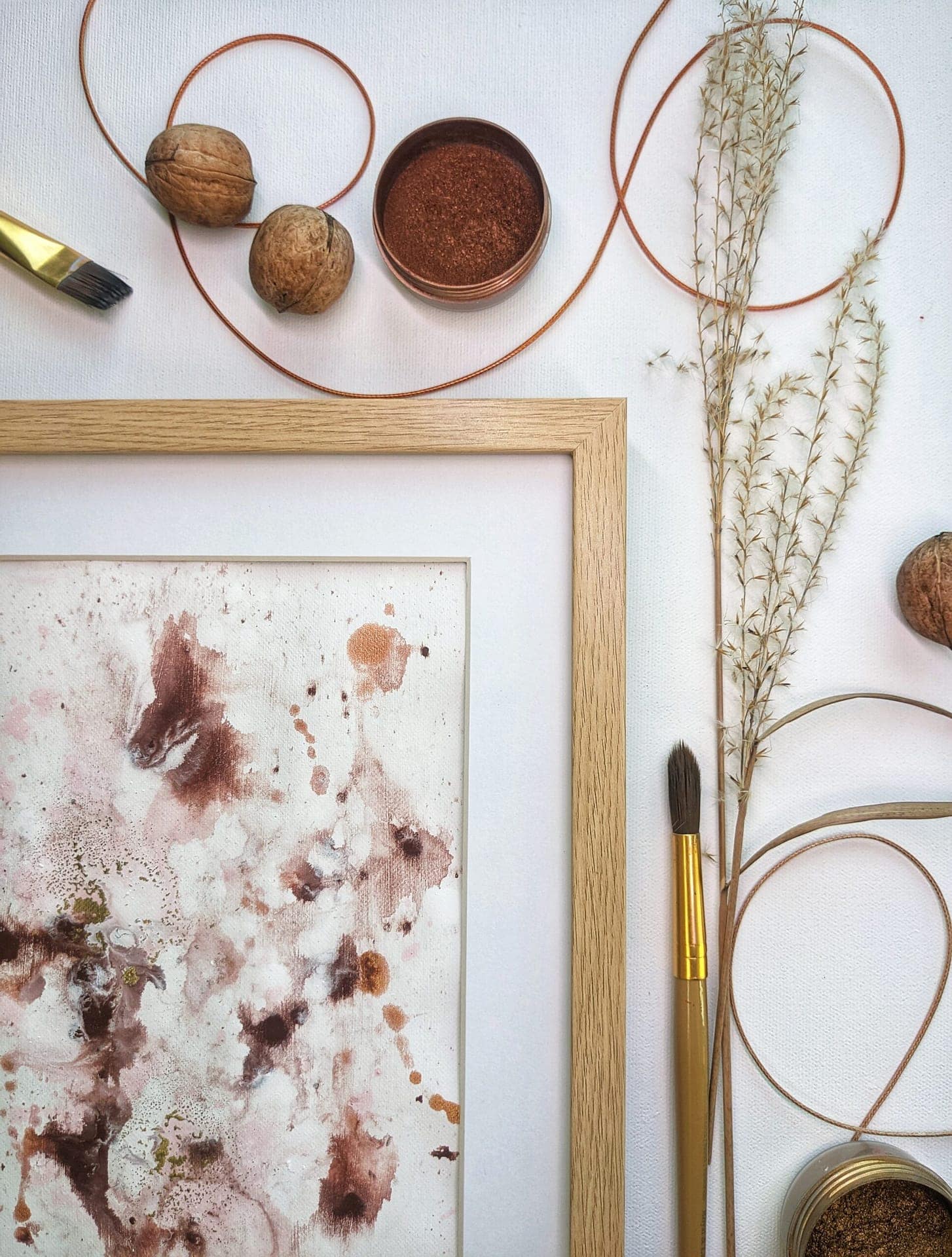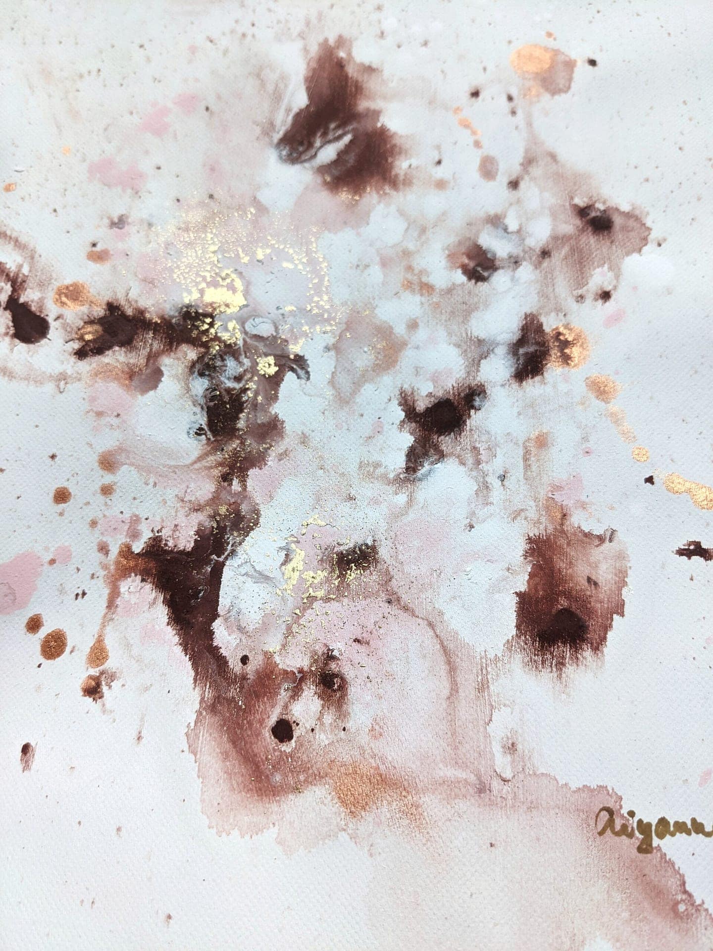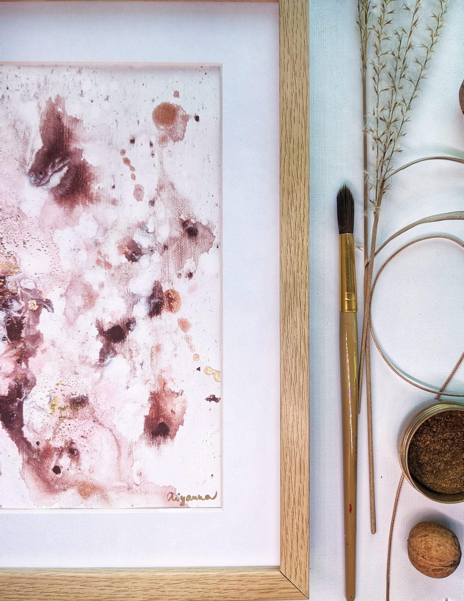 This collection of paintings was inspired by the heartfelt gratitude and love that I feel in my life. These paintings are carrying within themselves a warm image of a safe home and a beautiful feeling of loving and being loved. Brown tones for cozy, earthy warmth, pink color for love and gold particles for the gratitude, that I feel for all that we have.