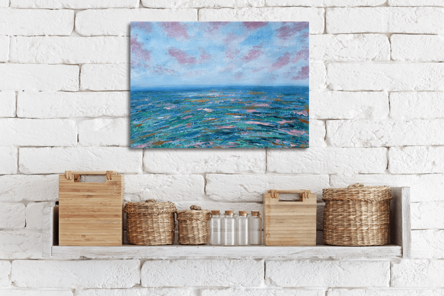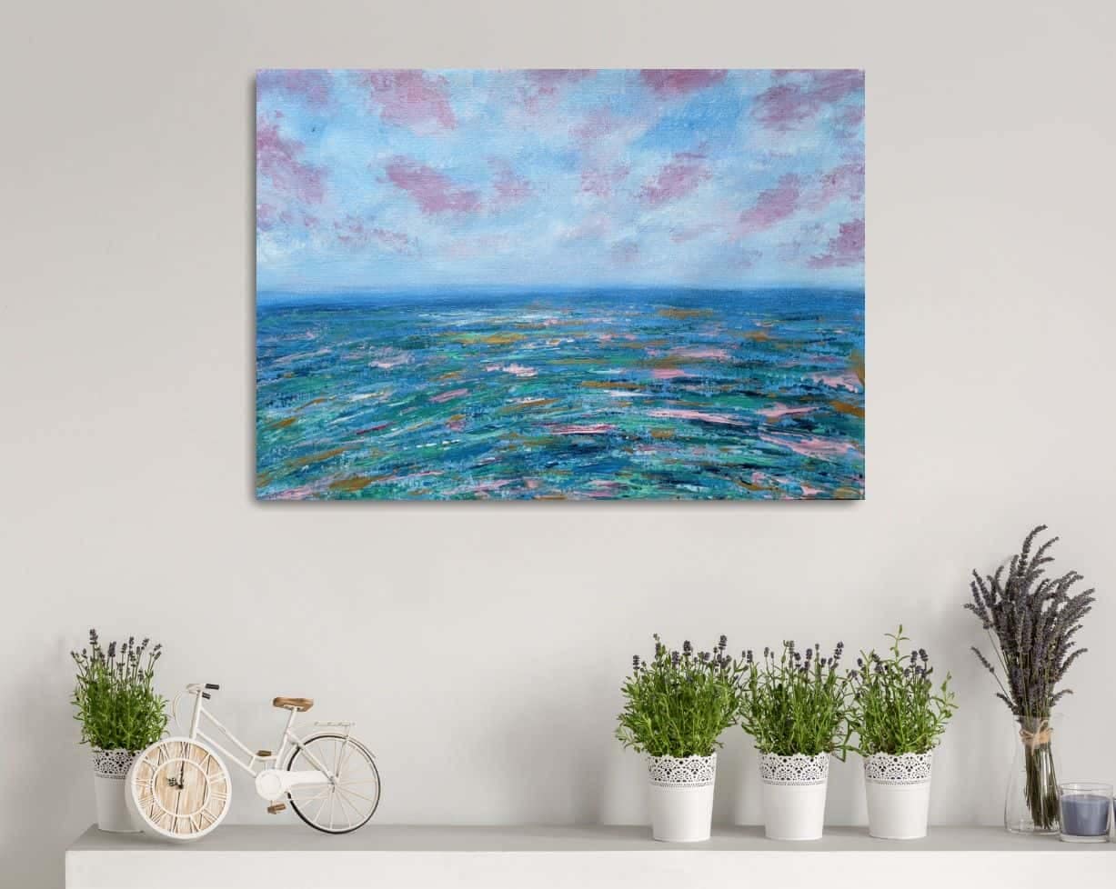 With golden highlights, changes colour in a different light. Interesting abstract painting of the sea and sky can add playful character to your room.
