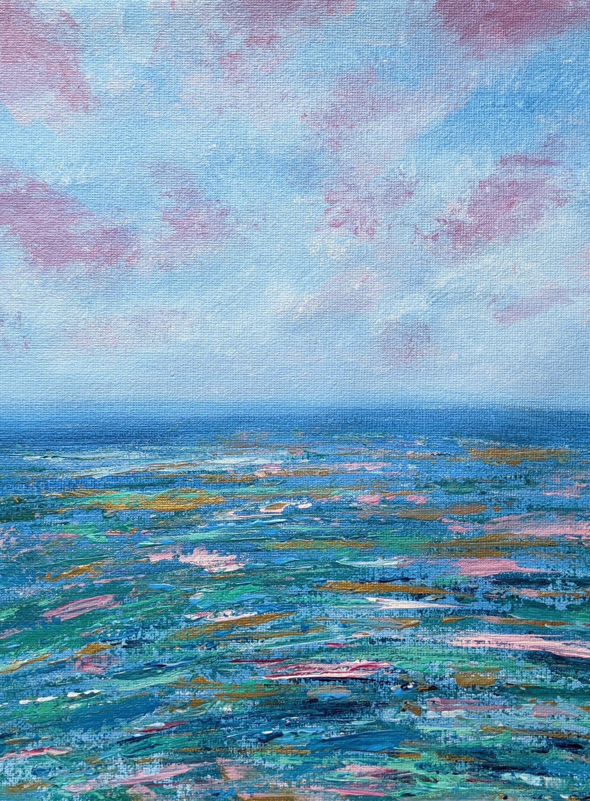 Very nice textured, colourful painting. With golden highlights, changes colour in a different light. Interesting abstract painting of the sea and sky can add playful character to your room.