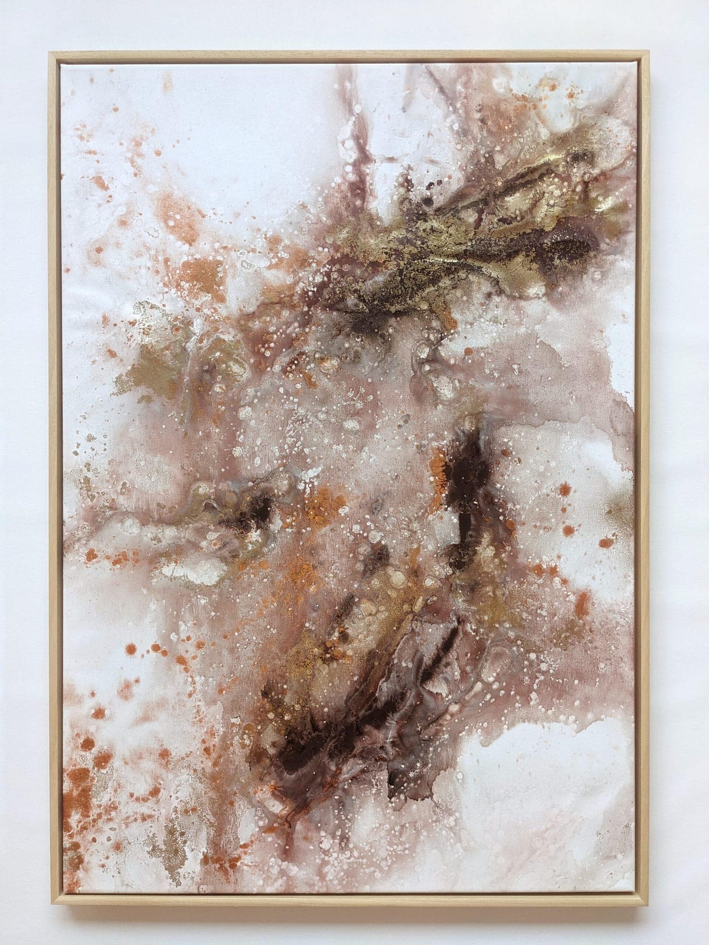 An abstract painting made of acrylic paint and golden pigments on stretched canvas. The artwork is varnished and signed.