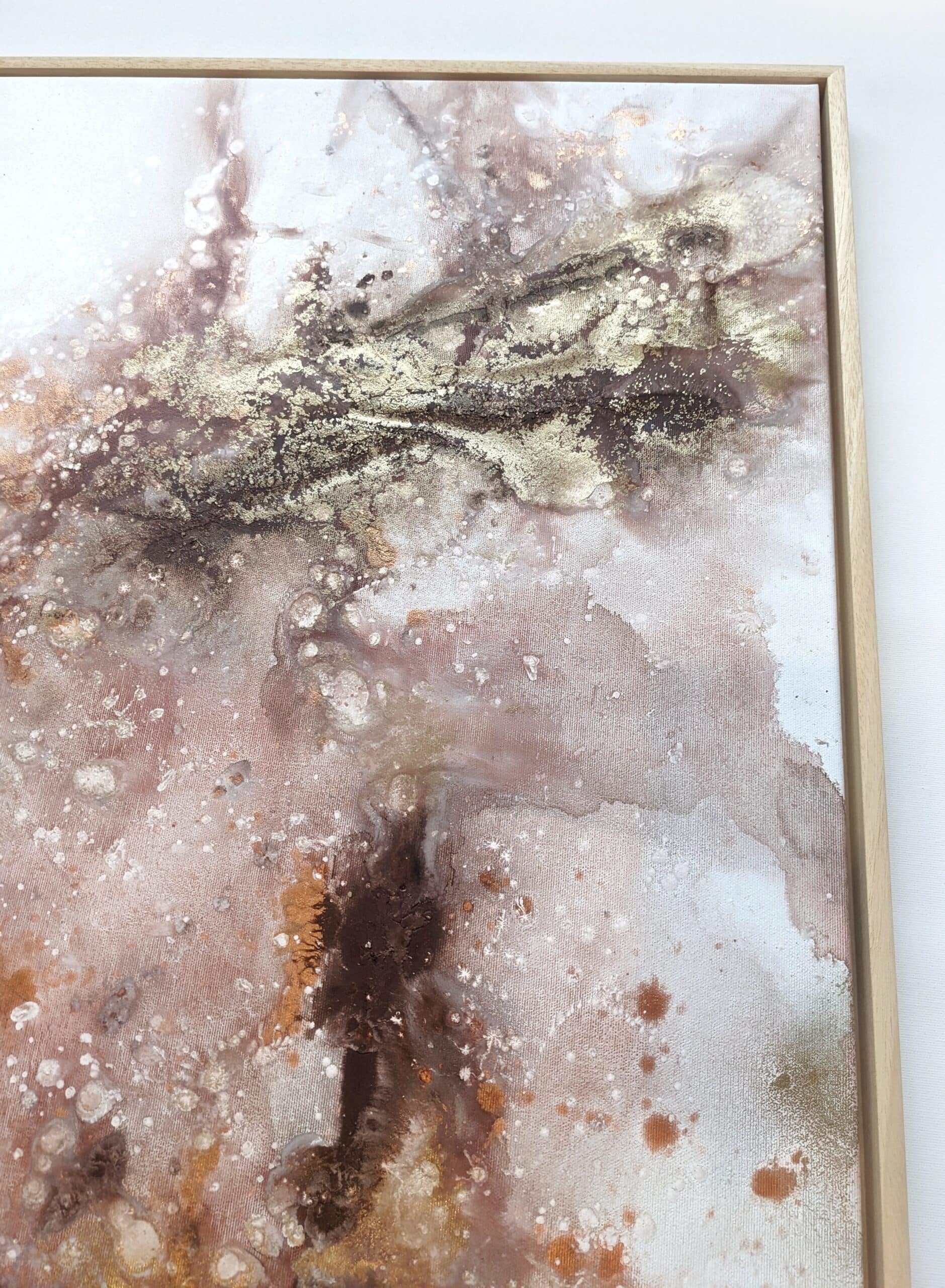 This collection of paintings was inspired by the heartfelt gratitude and love that I feel in my life. These paintings are carrying within themselves a warm image of a safe home and a beautiful feeling of loving and being loved. Brown tones for cozy, earthy warmth, pink color for love and gold particles for the gratitude, that I feel for all that we have.