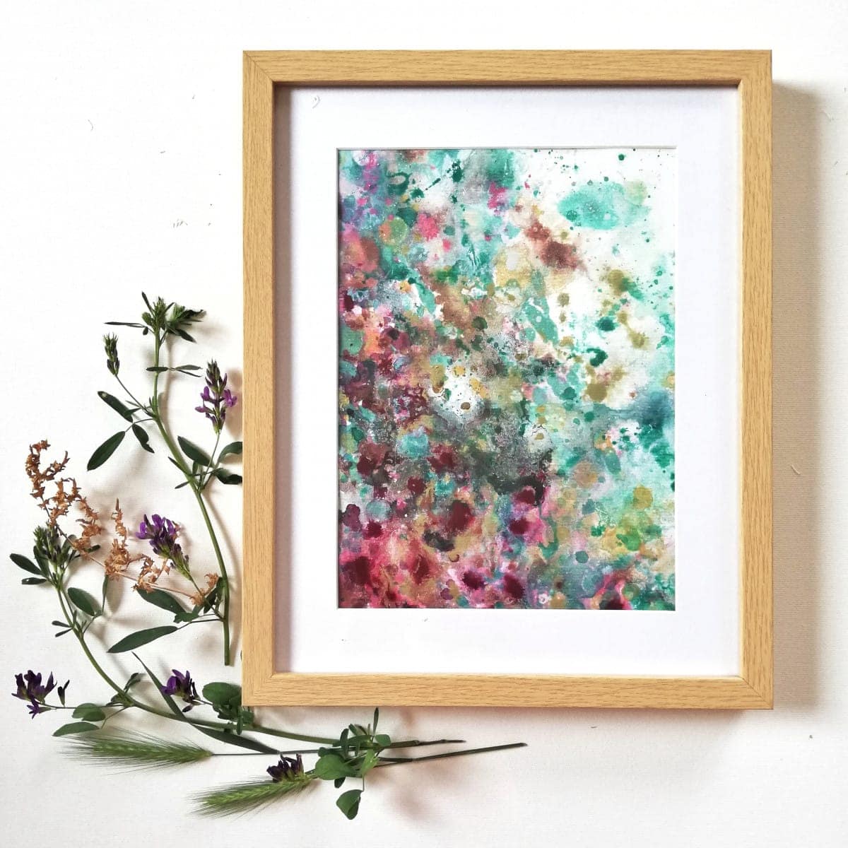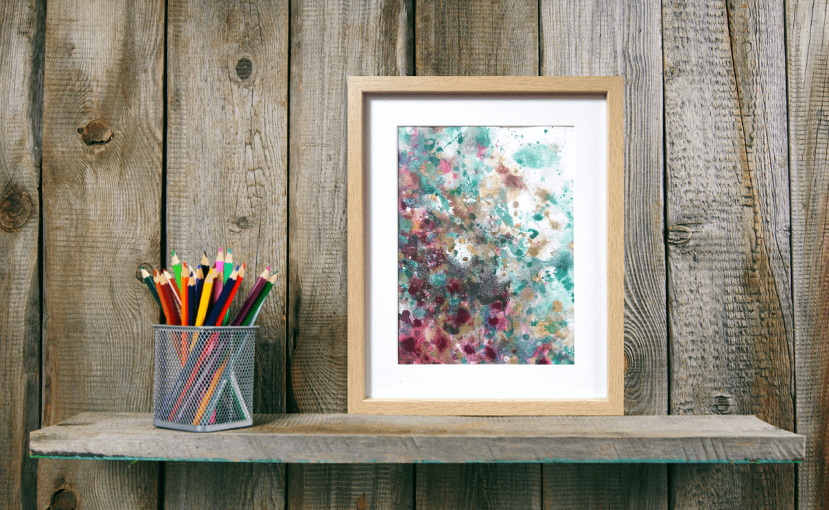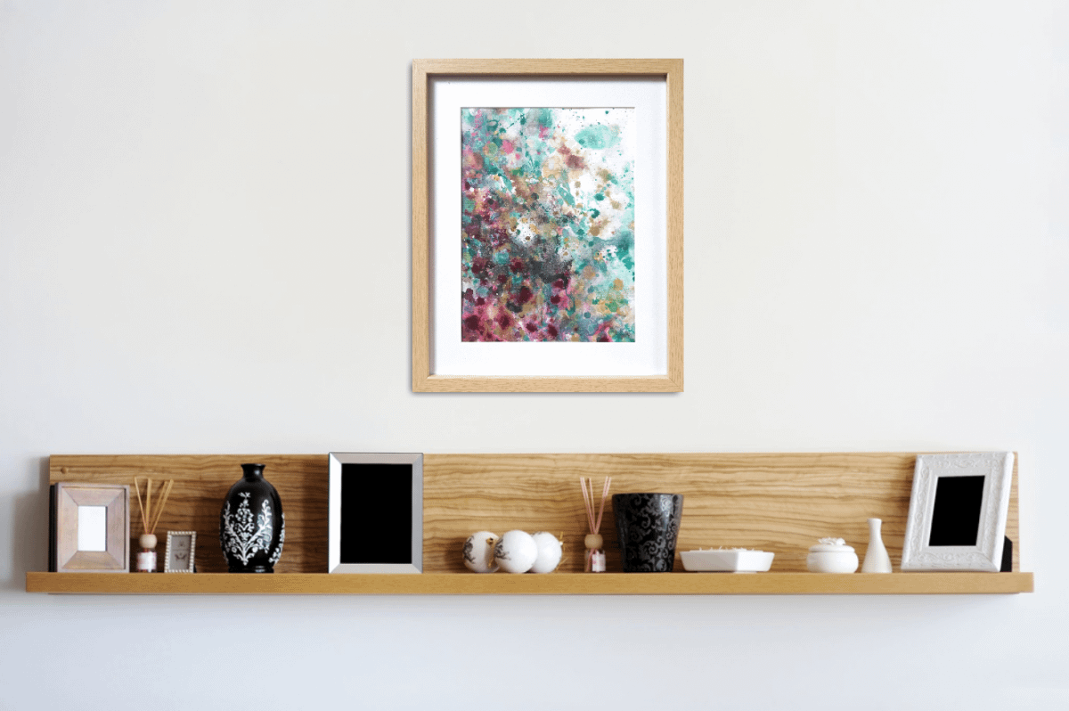 Material: watercolour paper framed in a wooden frame with mat board and glass, acrylic paint, alcohol ink, golden paint, glossy varnish.