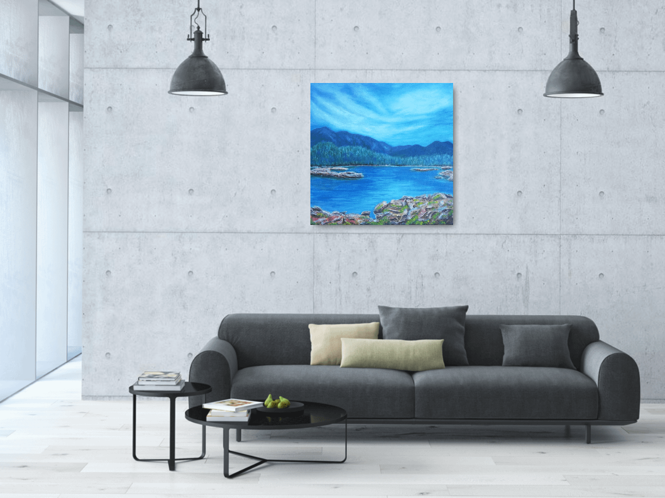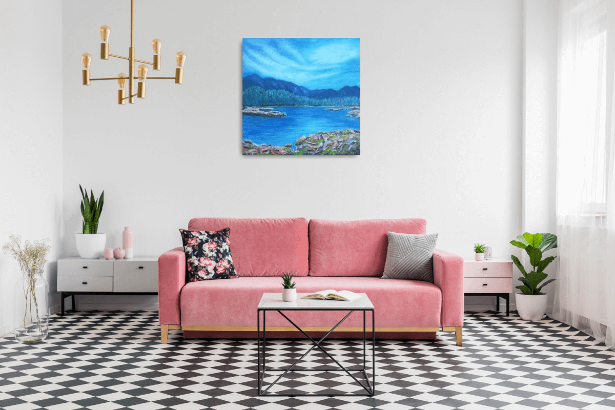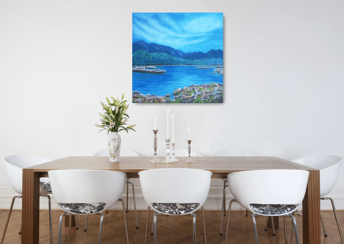 This painting can help you brighten any room, bring colours to your home with blue lake and mountains in the background. This beautiful landscape scene painting can catch your eye and bring more serenity to your home.