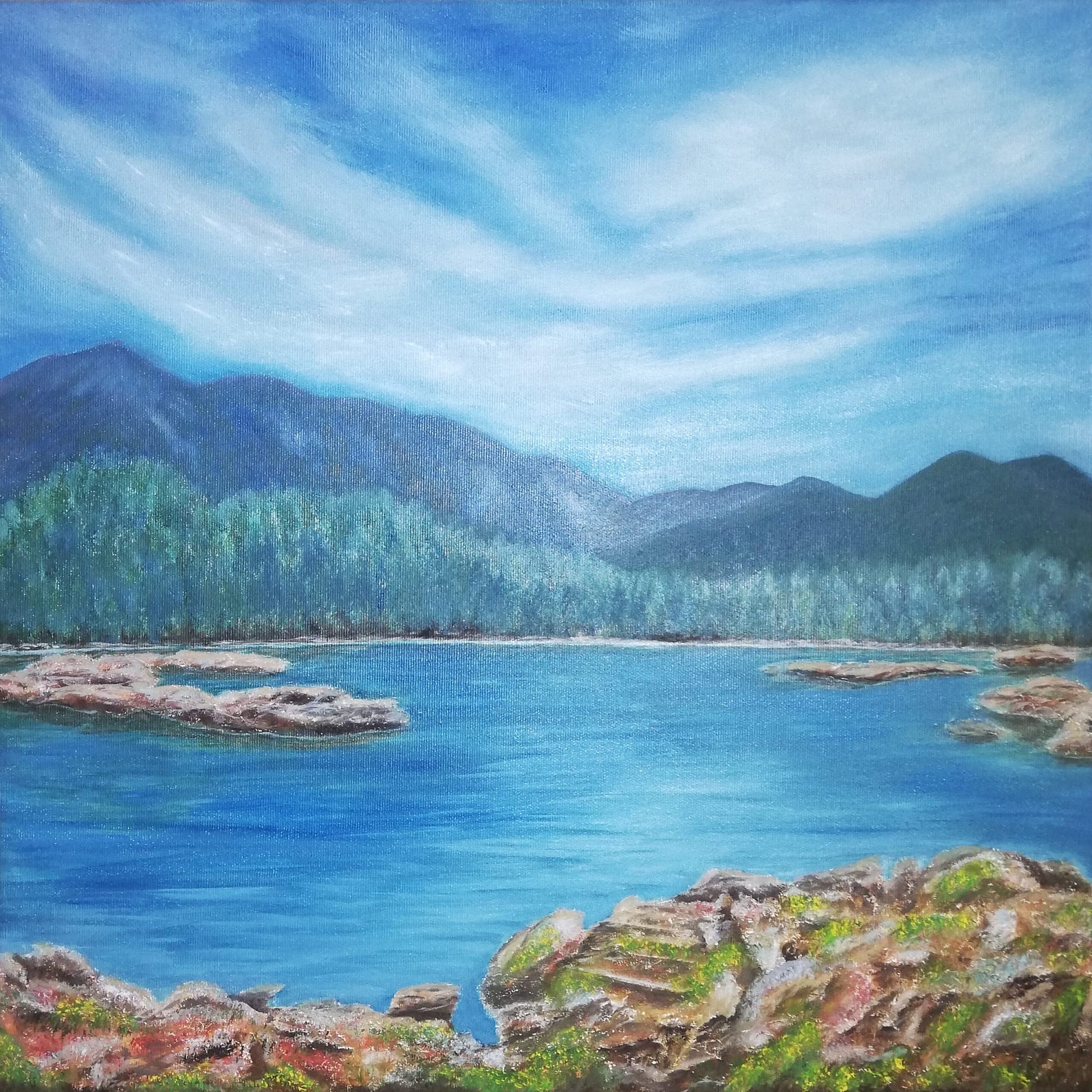 Serenity – lake painting on canvas, 50×50 cm