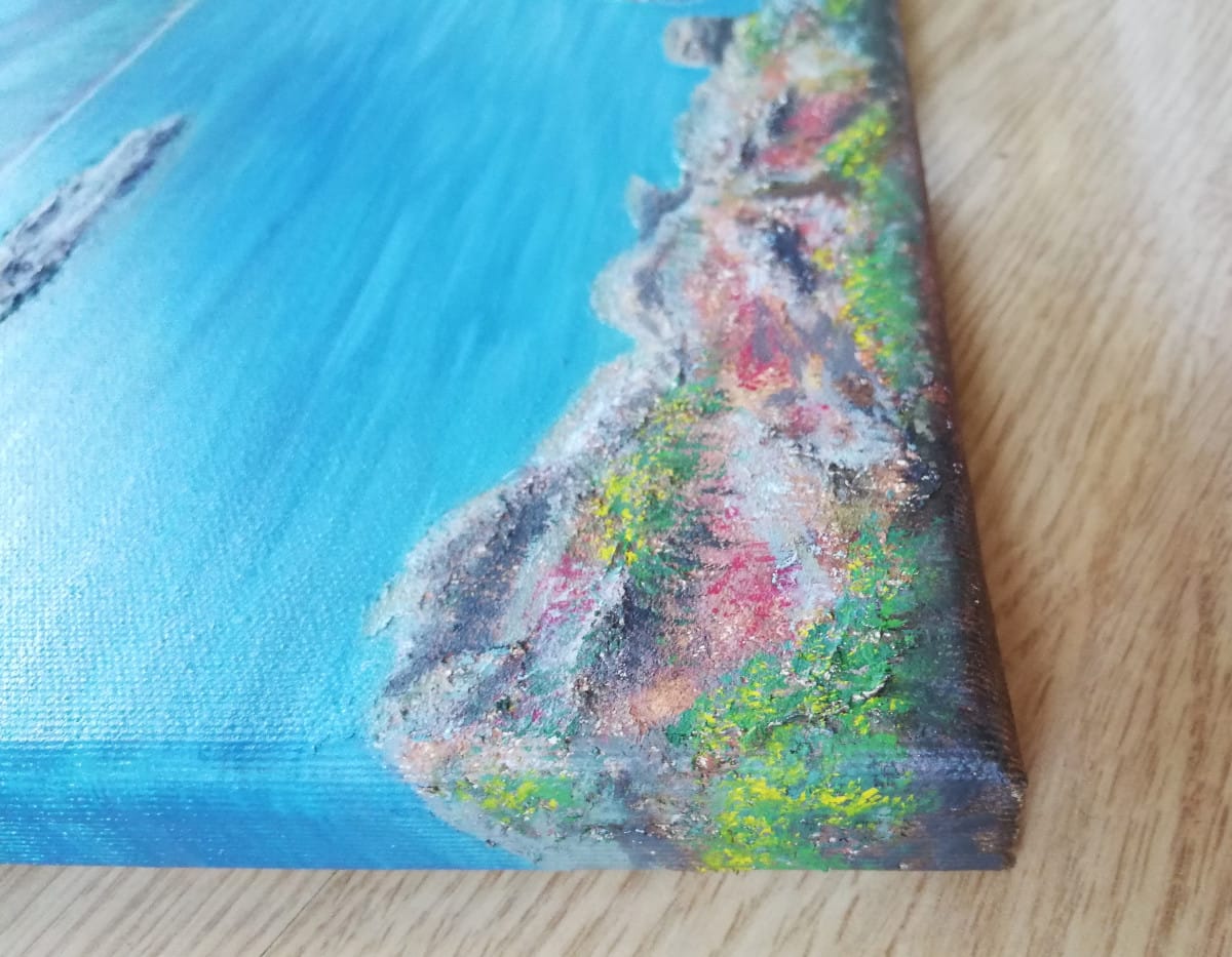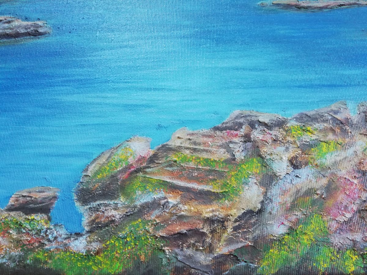 Rocks are painted with structured paste, so the painting has a 3D look, you can see and touch the texture of the rocks.