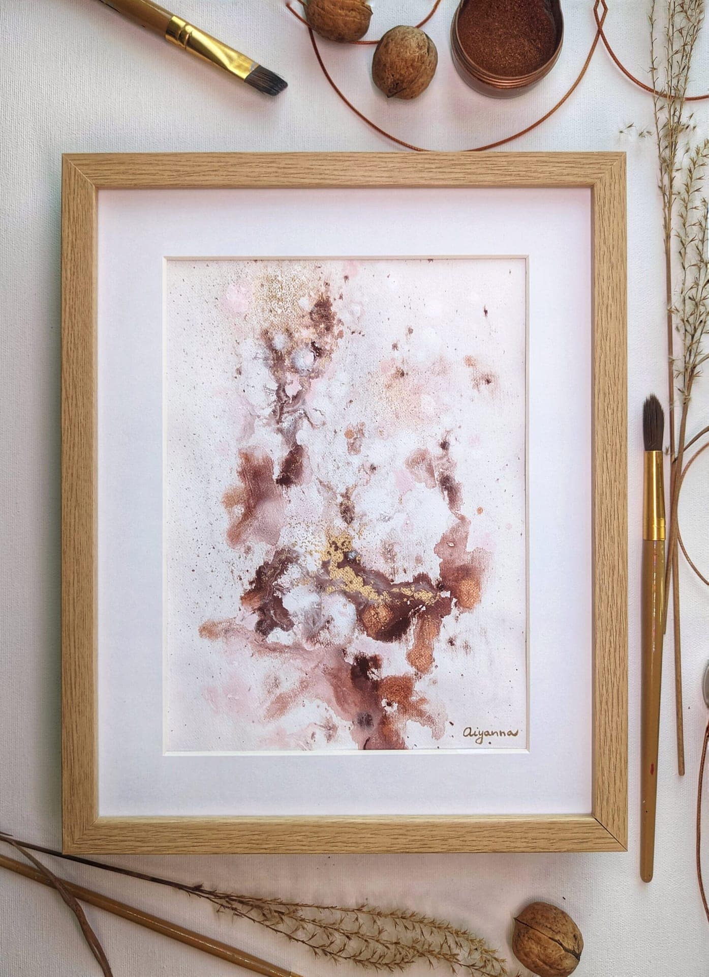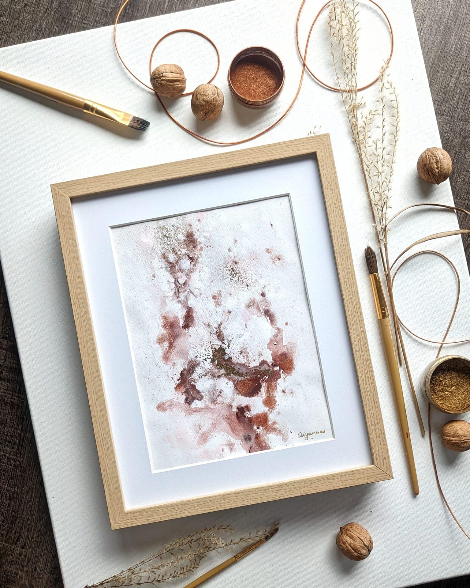 An abstract painting made of acrylic paint and golden pigments on watercolor paper, framed in a wooden frame with matboard and glass. The painting is varnished and signed.