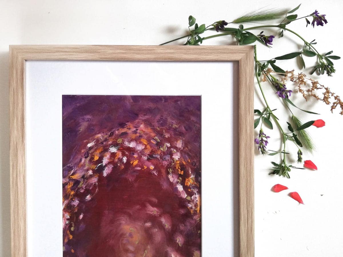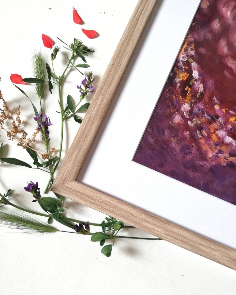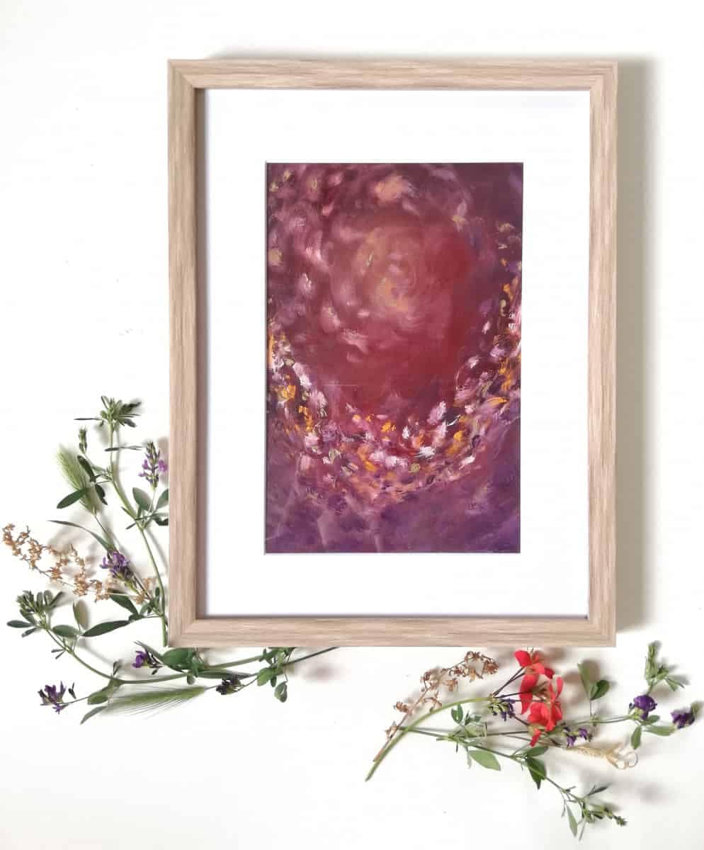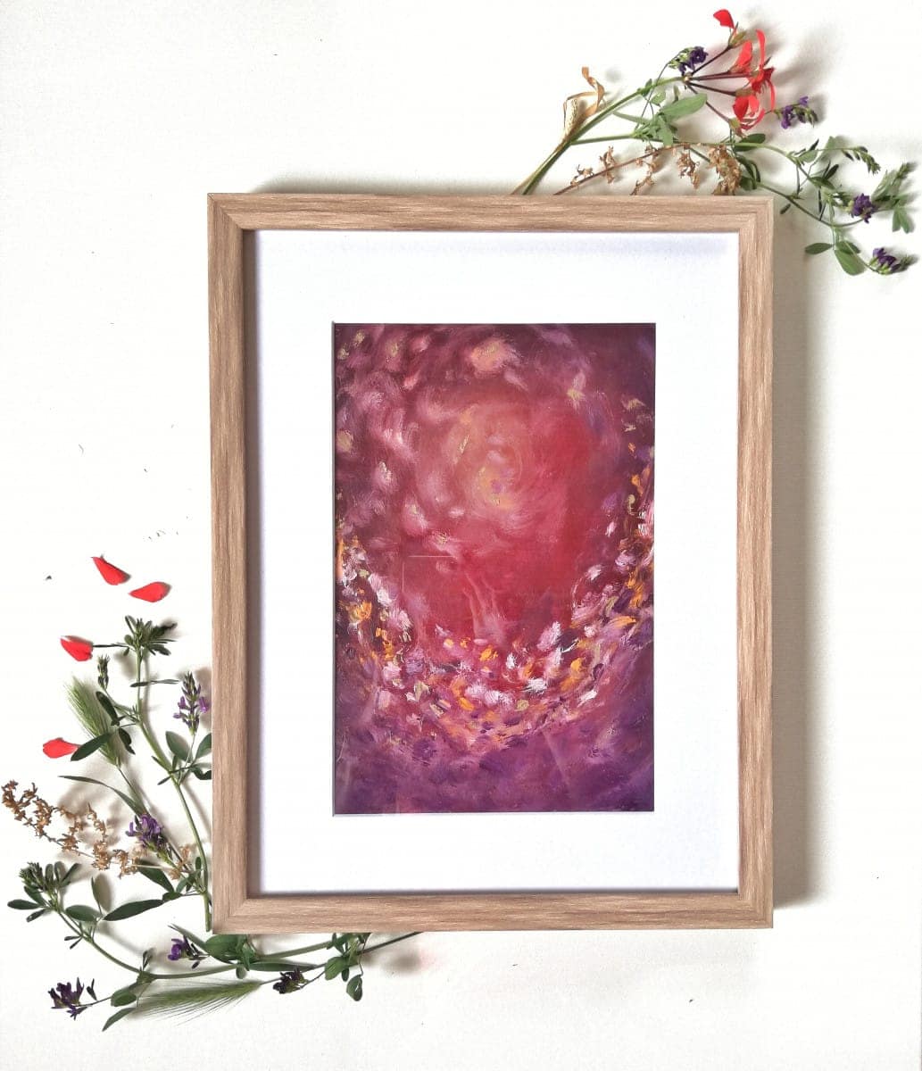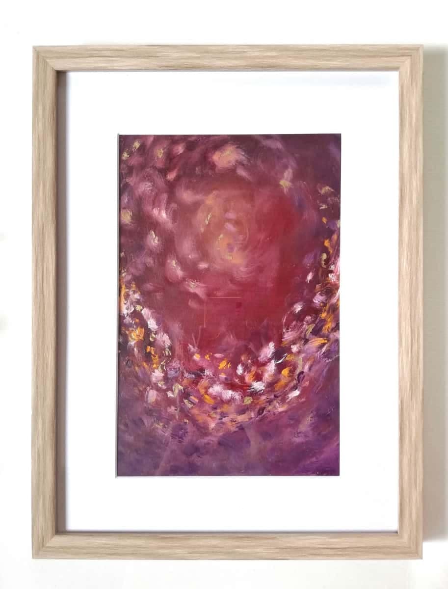 Material: watercolour paper framed in a wooden frame with mat board and glass, acrylic paint, alcohol ink, golden paint, glossy varnish.