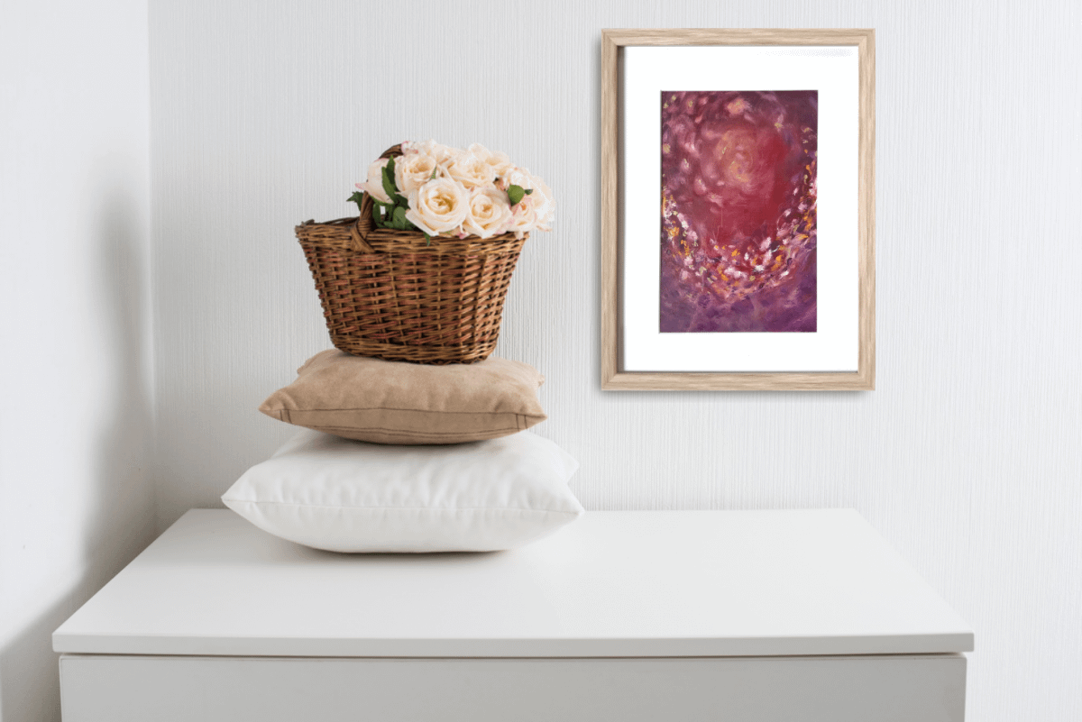 Original, modern abstract acrylic painting in red, gold, pink and purple colours.