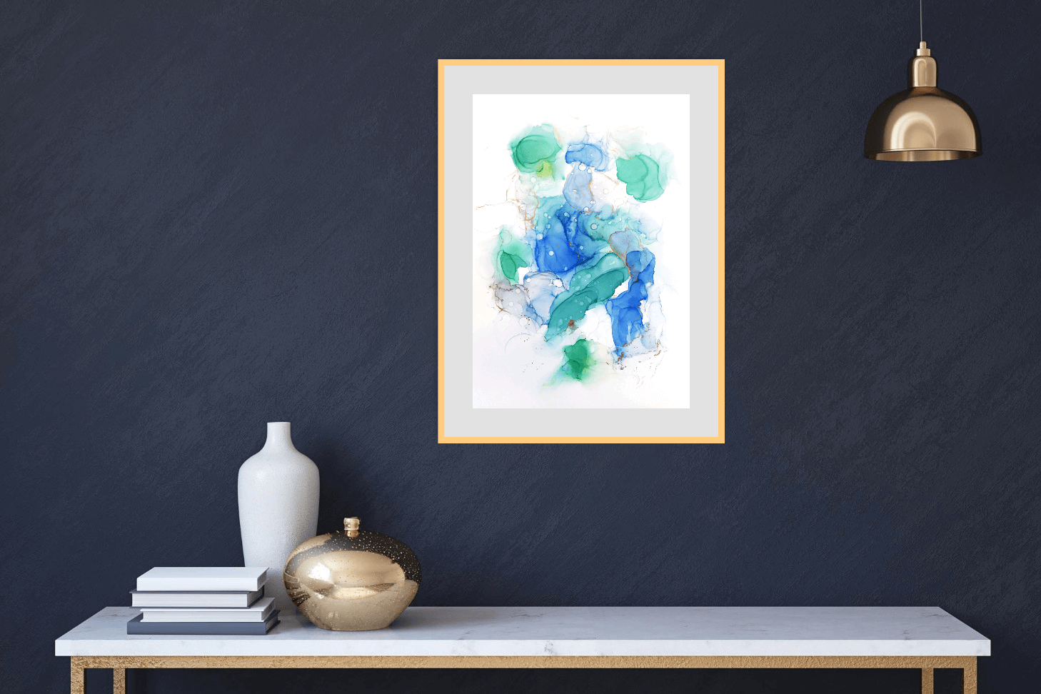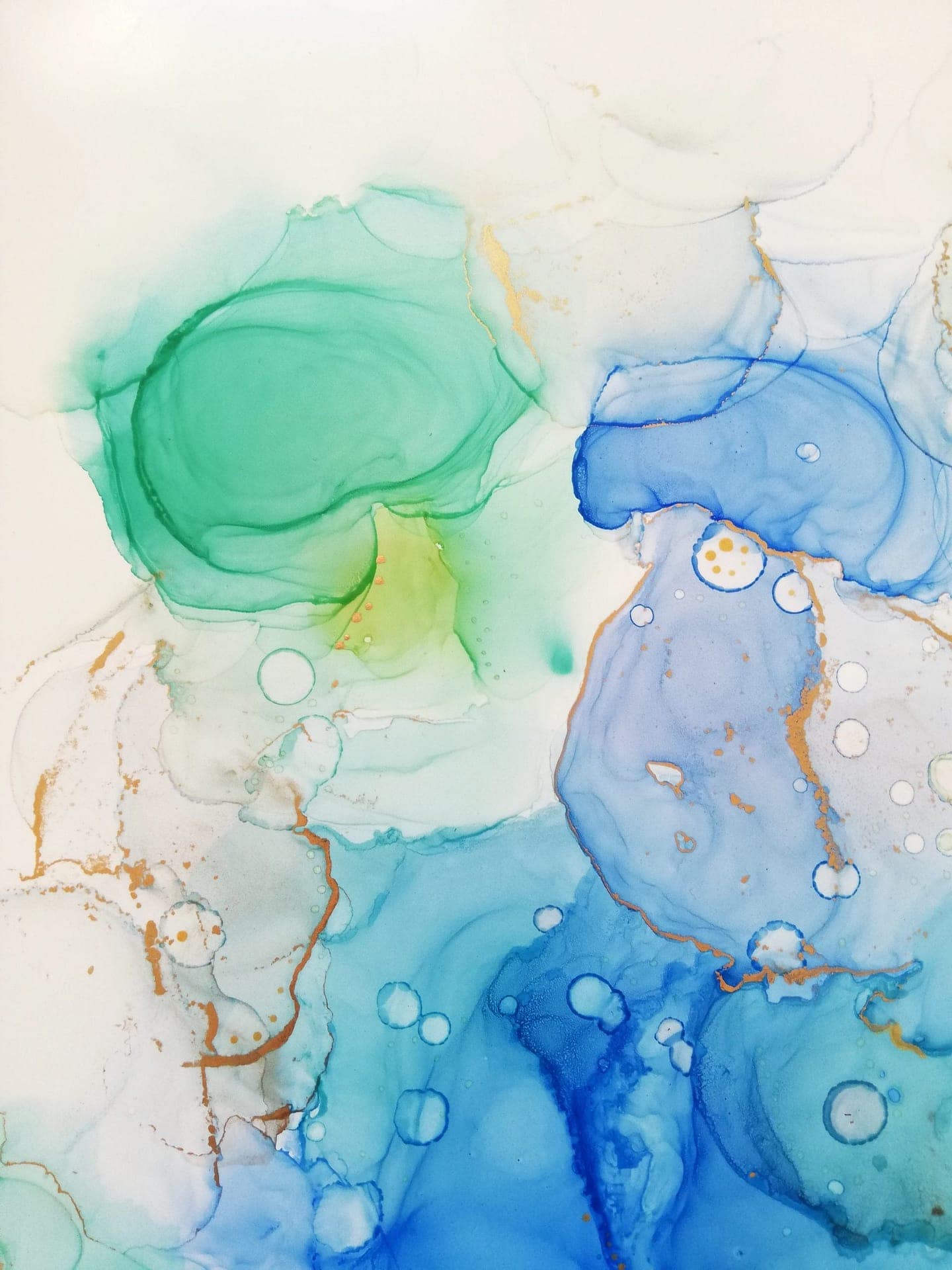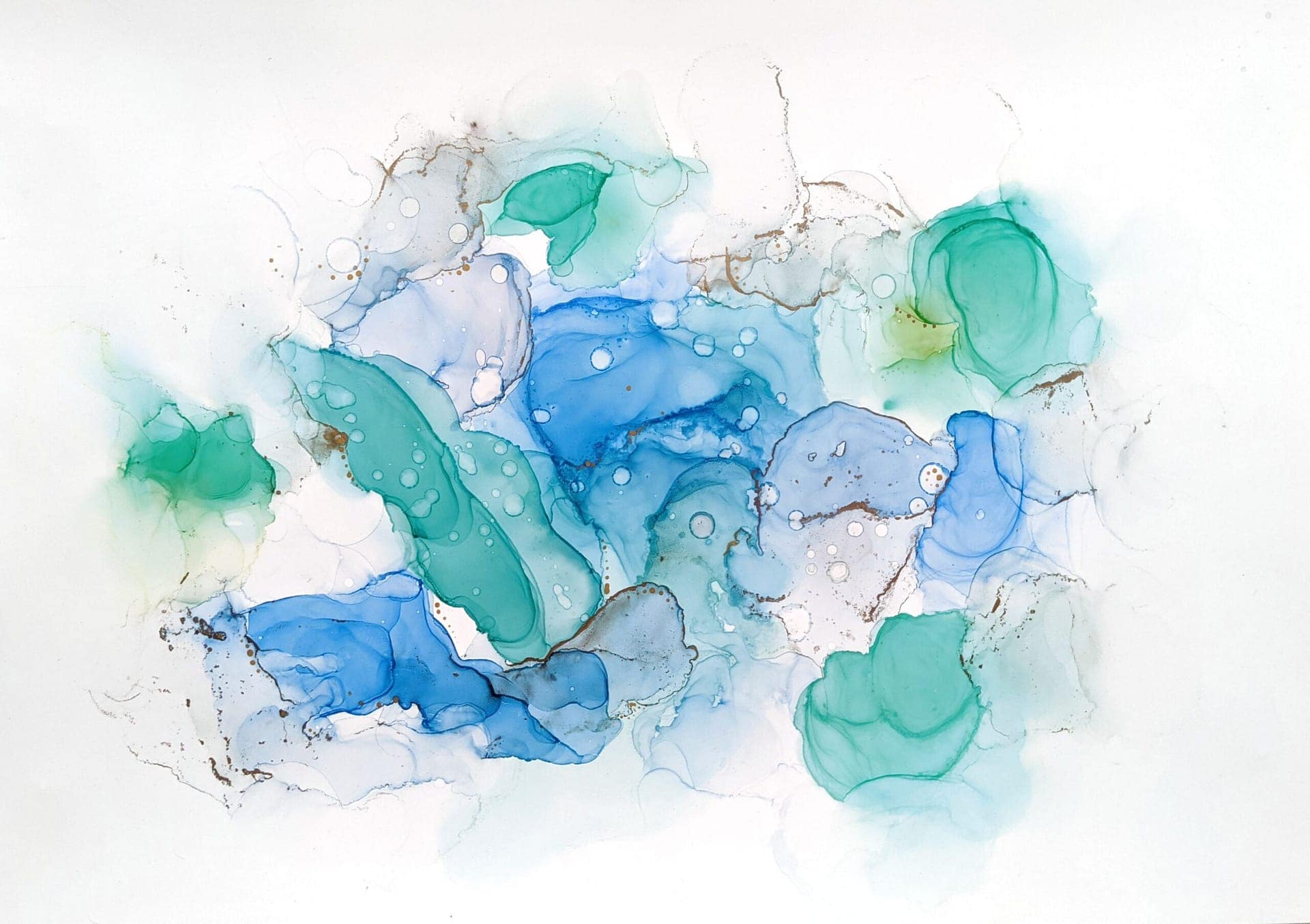 Green and blue fluid abstract painting. Original artwork on Yupo paper.