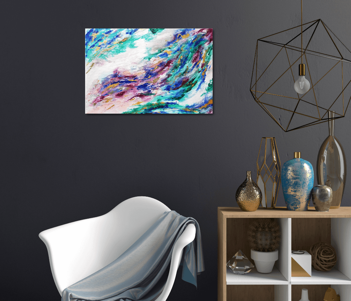 Original, modern abstract acrylic painting on a stretched canvas in blue, purple, gold and green colours.